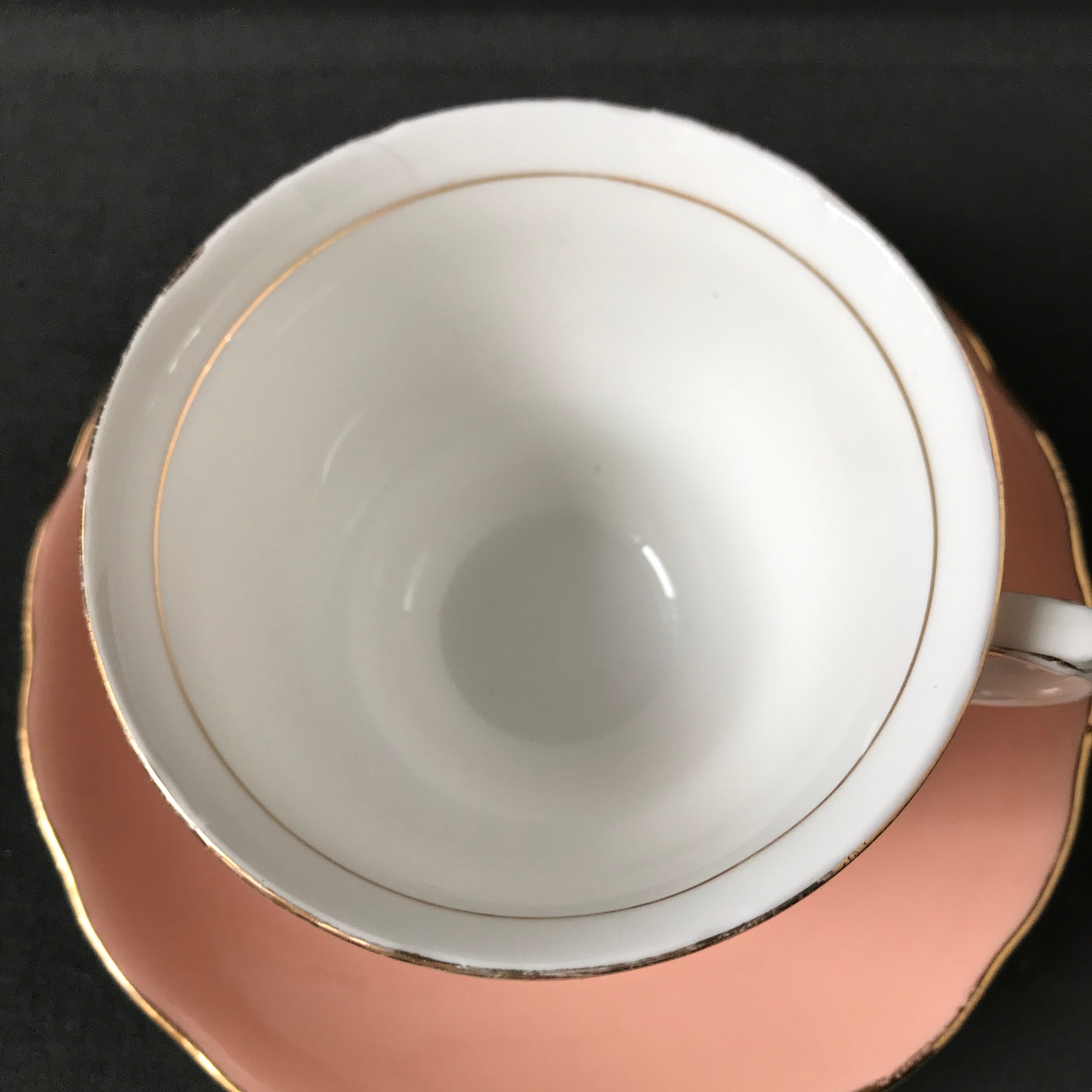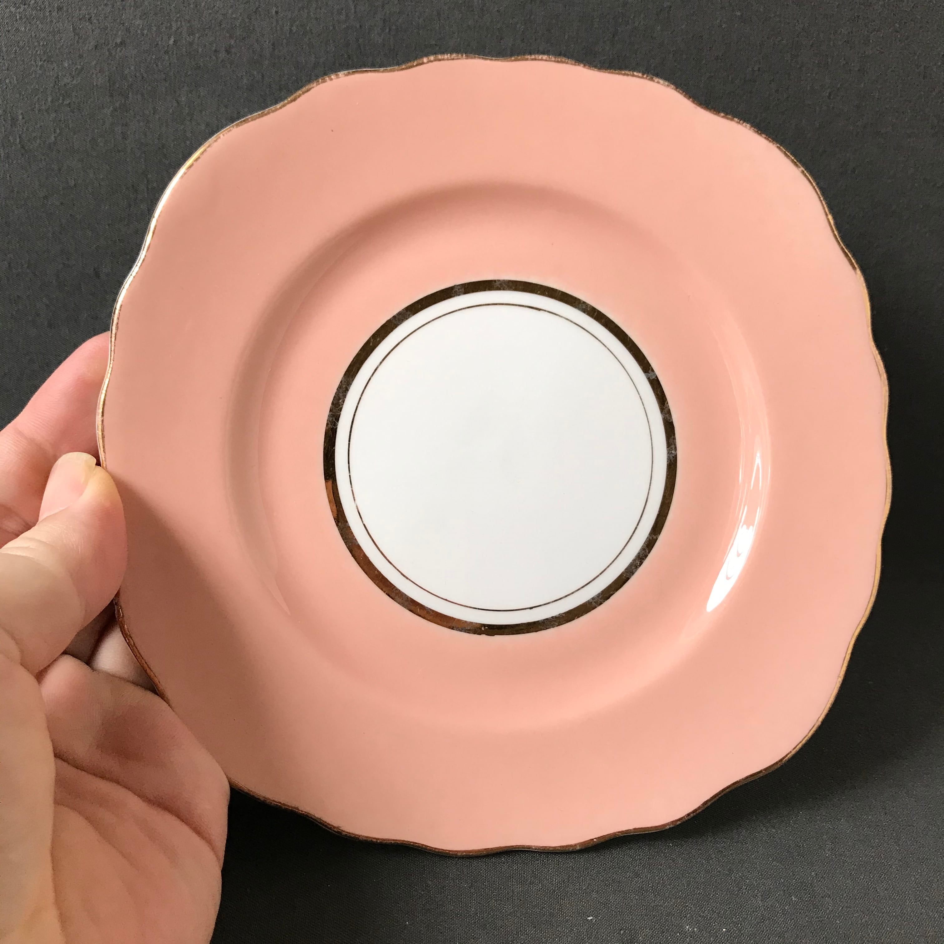 COICLOUGH社 コーラルピンクが綺麗なカップ&ソーサーとプレートのトリオセットです。多少の金彩のスレはございますが、ヒビカケ無く良い状態です。イギリスビンテージ。