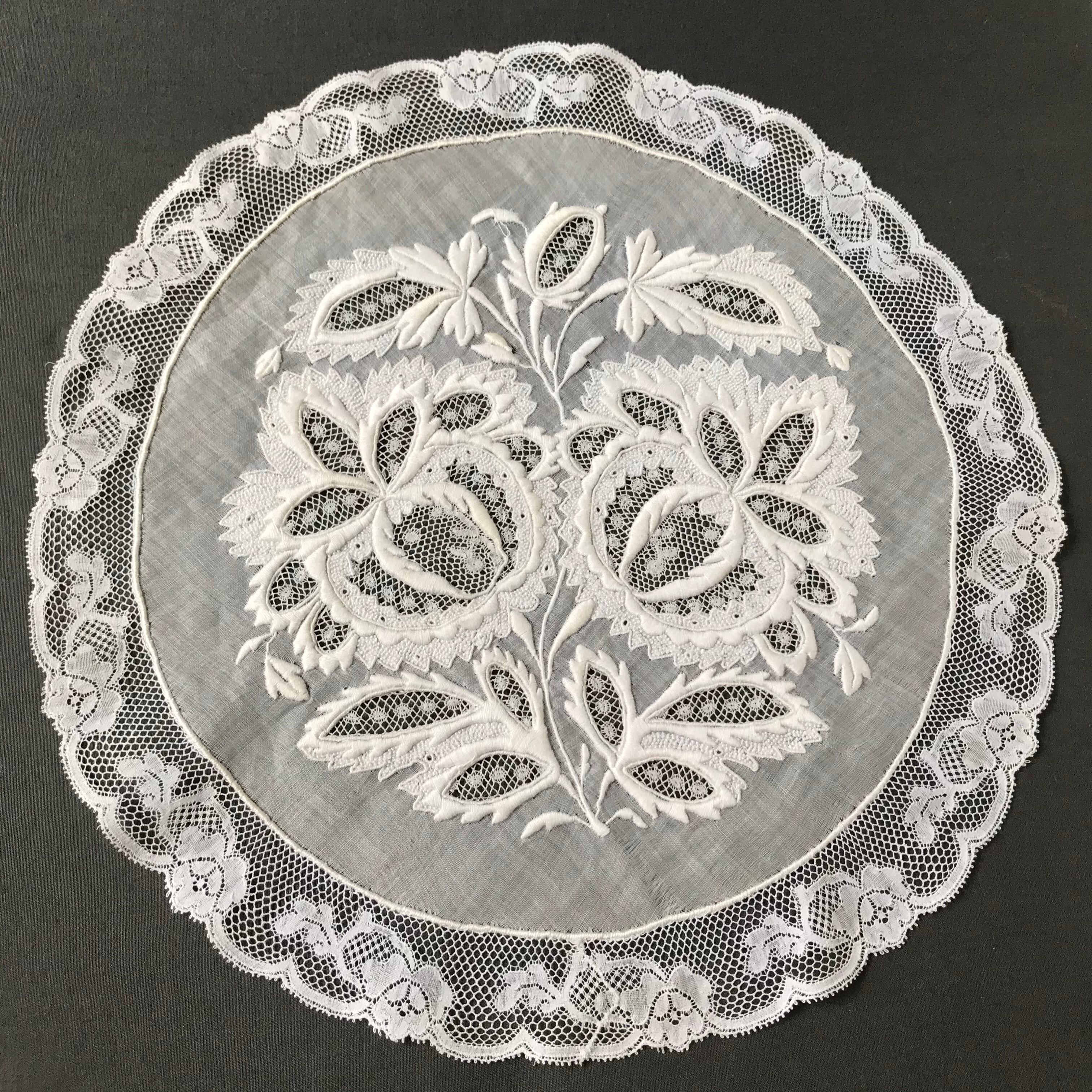 ・直径 27㎝ 素晴らしいバラの刺繍のドイリー です。細やかな刺繍が大変エレガントです。フランスアンティーク。