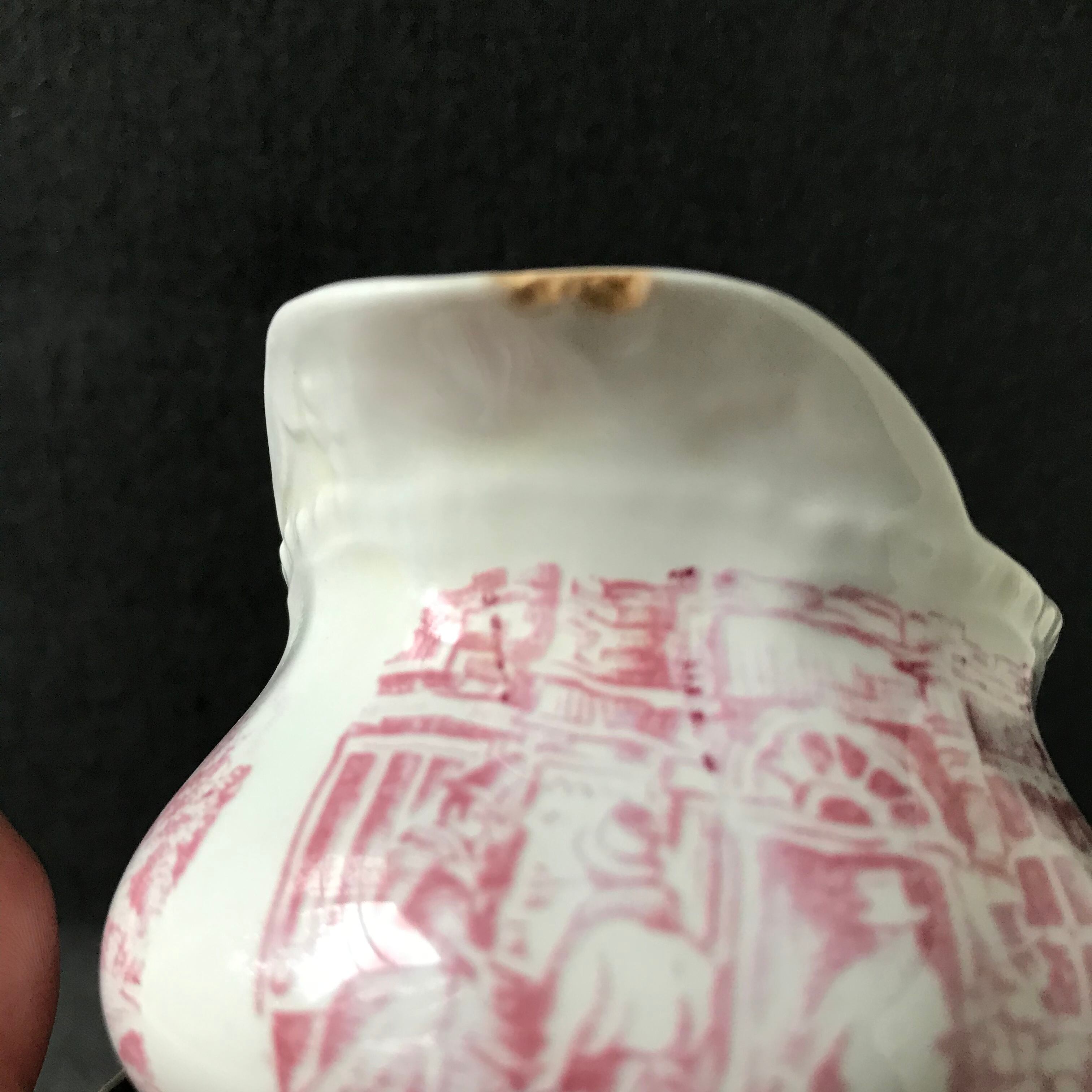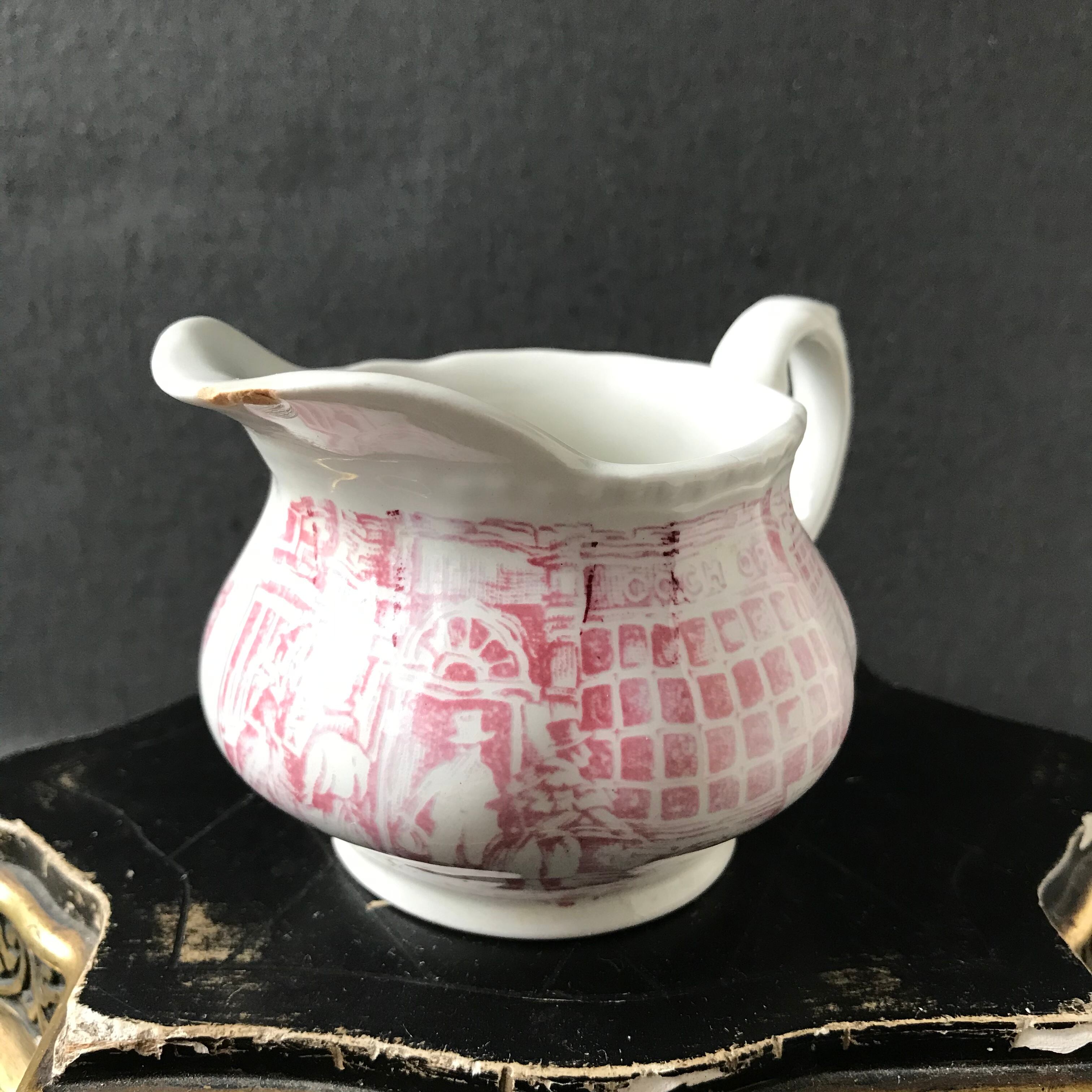 ROYALSTAFFOSHIRE 淡いピンクの貴族の様子の絵付けが可愛らしい小さなピシェです。口裏にスレカケがあります。それ以外はヒビカケありません。イギリスアンティーク。