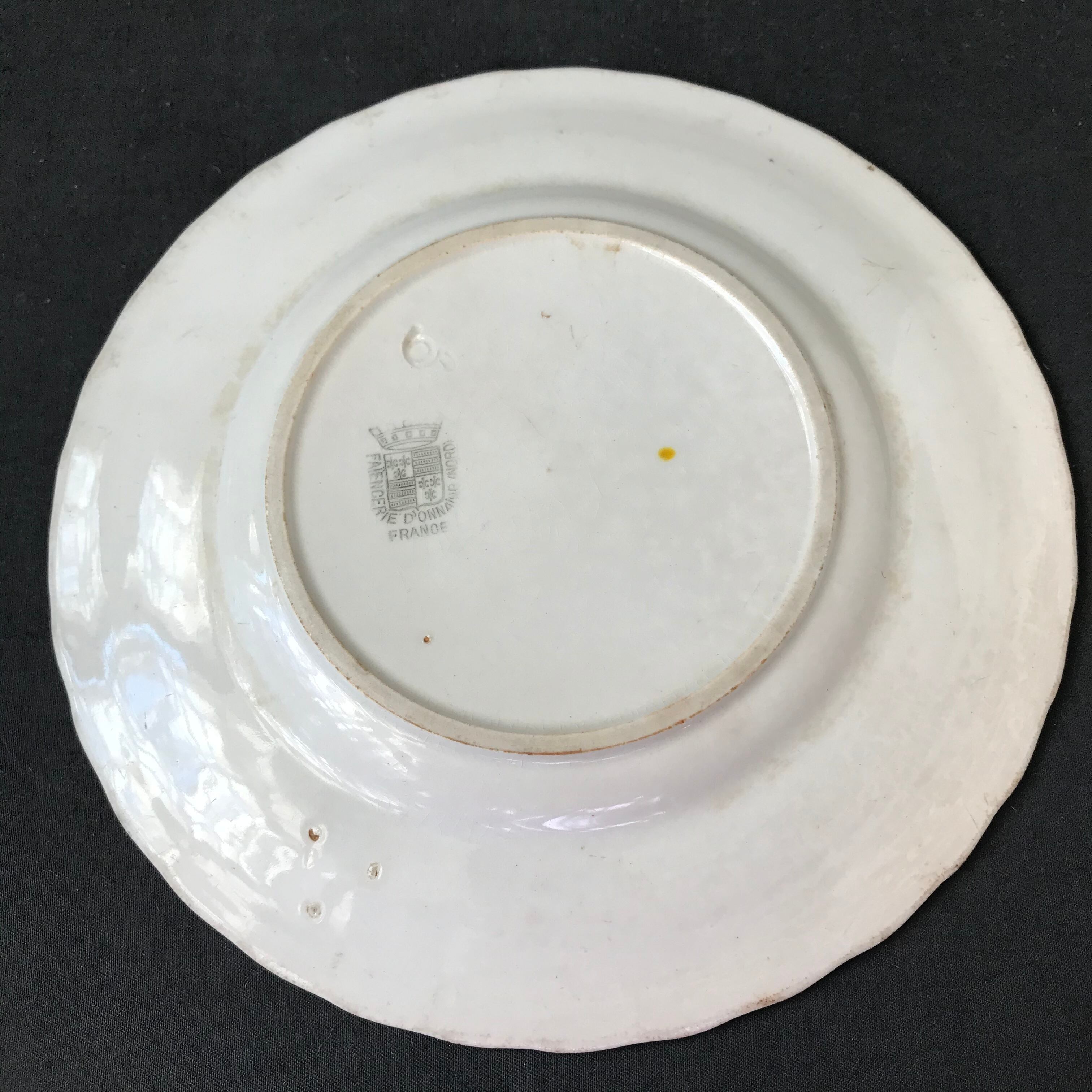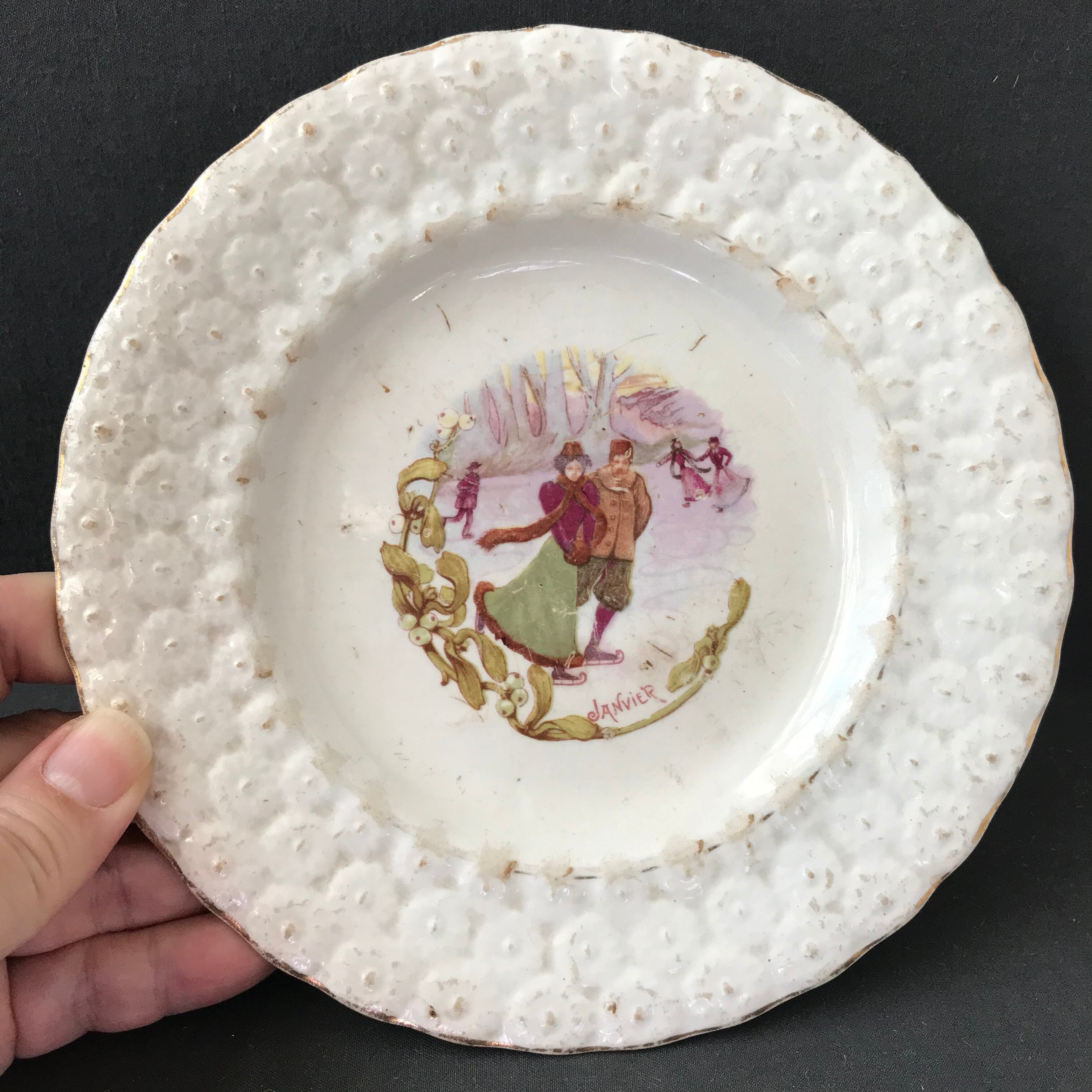 ・直径 18.2㎝ マーガレットレリーフの中央にはヤドリギ とスケートをする情景が描かれたプレートです。経年のスレがあります。フランスアンティーク。