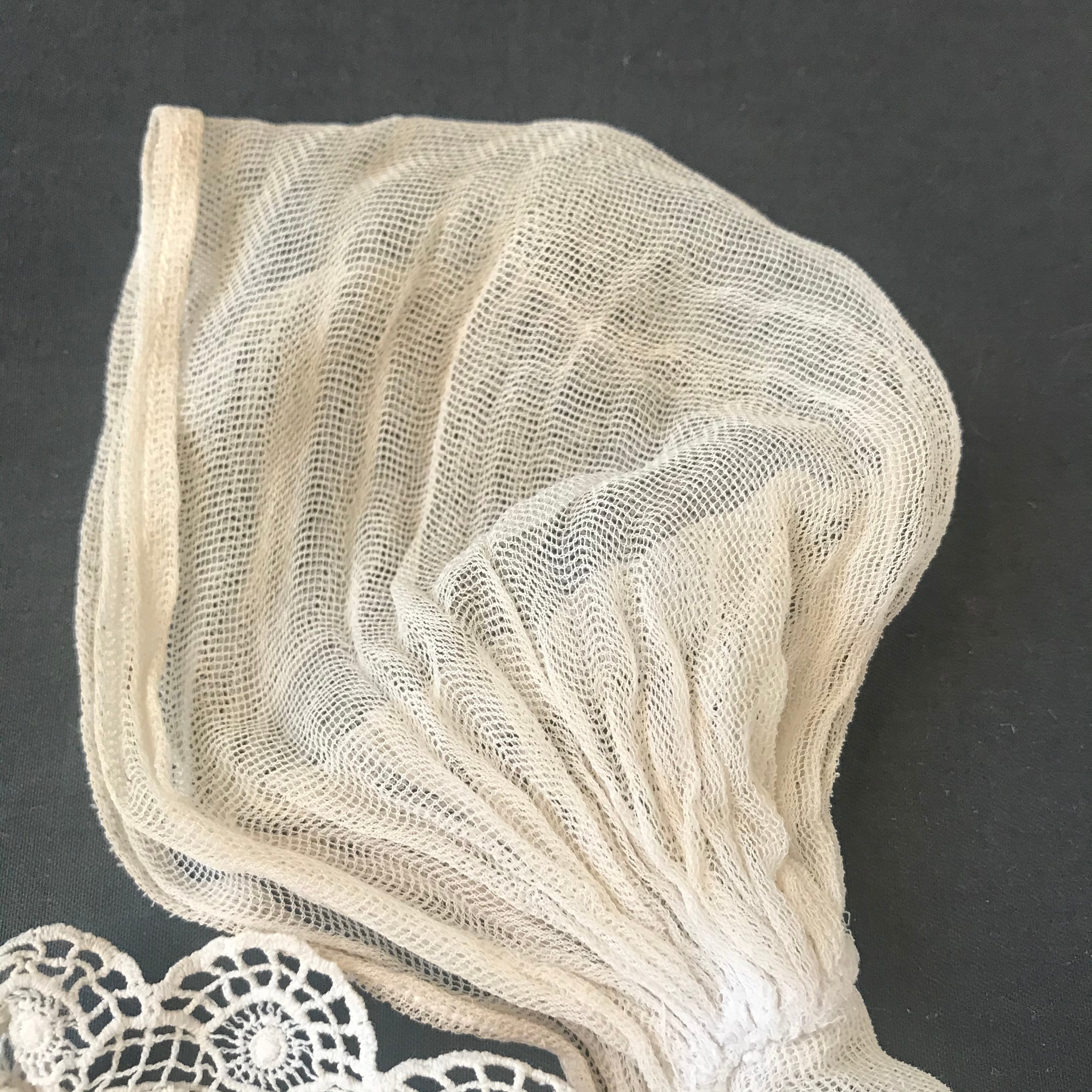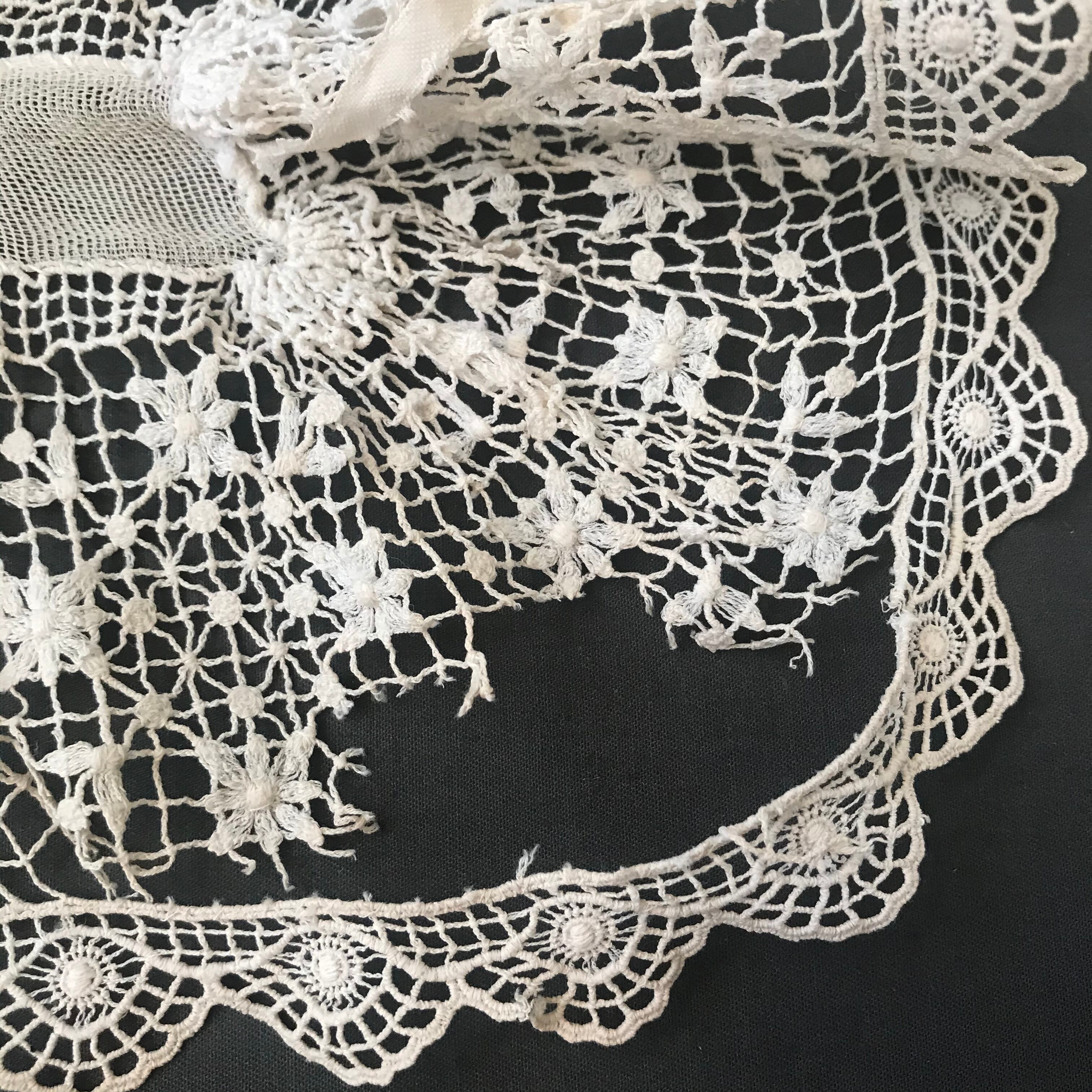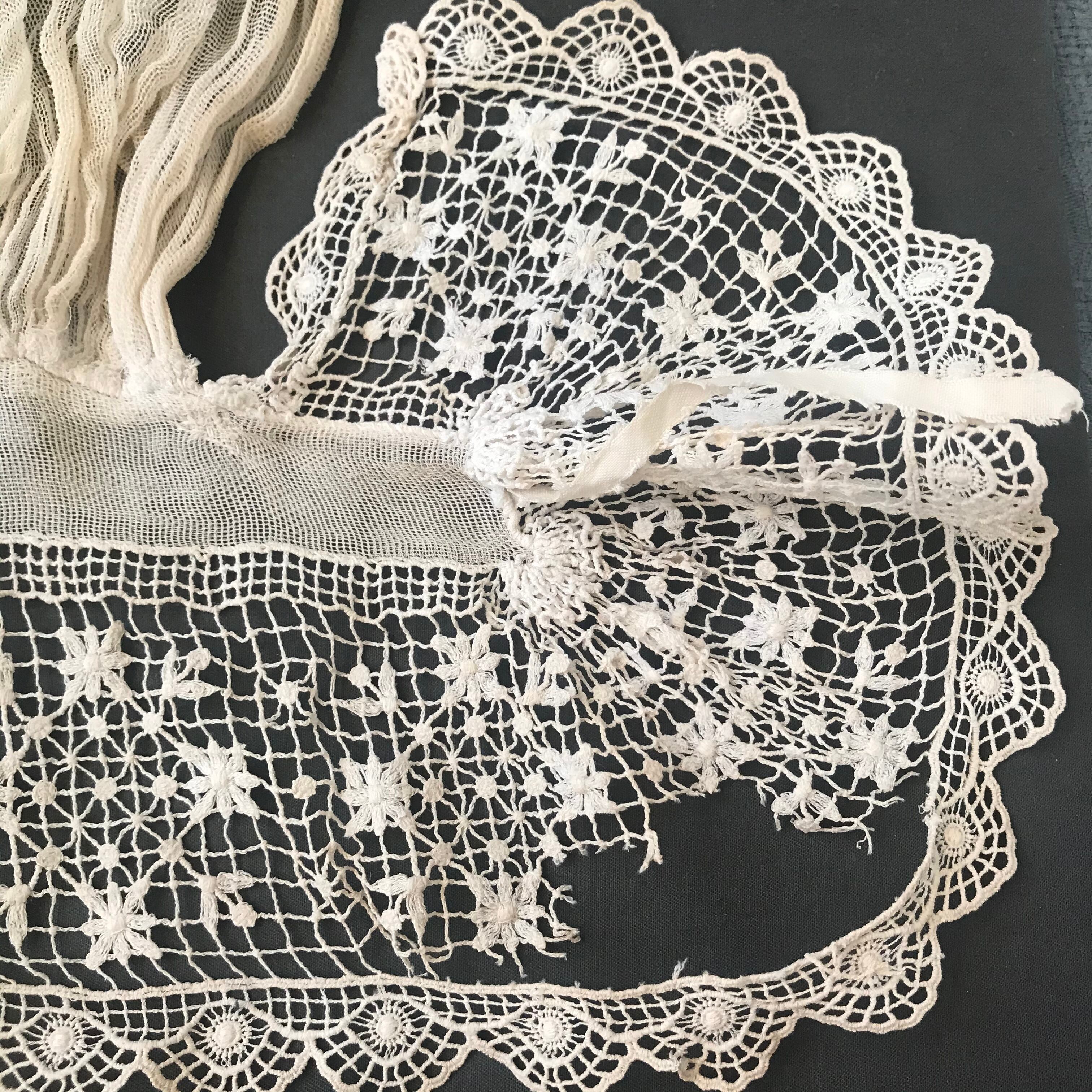 横 35㎝ チュールレースのボネにゴージャスなクロッシェレースの襟がついたベビーボネです。ベビーと書きましたが、頭の部分が小さめですのでドールちゃんやベアちゃんに被せて頂いても可愛いらしいです。クロッシェ部分にほつれがあります。フランスアンティーク。