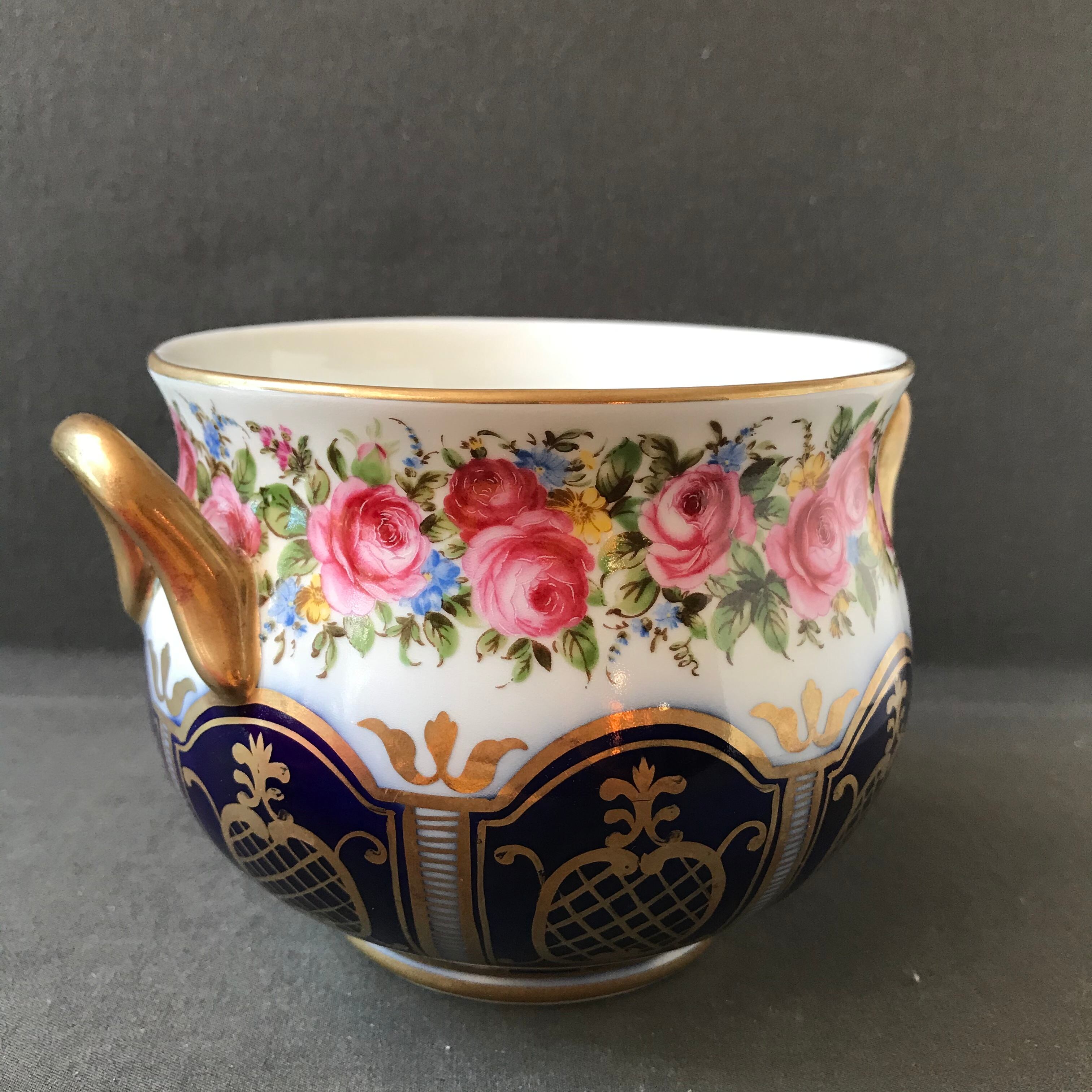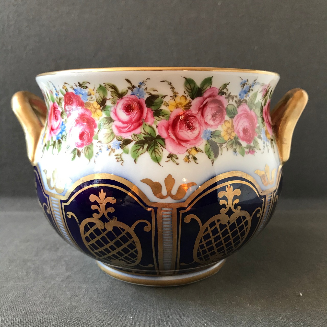 ・直径 12.7㎝ 高さ 11㎝ バラとロカイユの絵付けが綺麗なジャルディニエールです。ヒビカケ無く良い状態です。ぴったりなバラのキャンドルもお付けします。フランスビンテージ。