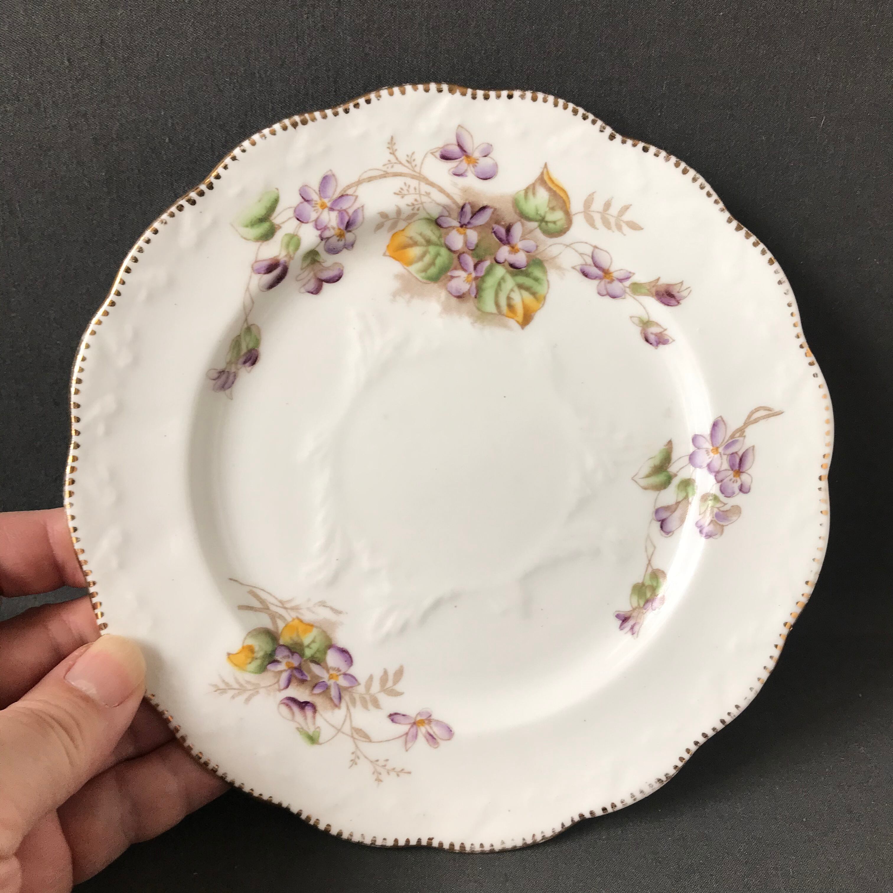 ・直径 17.5㎝ R&D スミレとレリーフが素晴らしいプレート2枚セットです。多少の金彩のスレはございますが、ヒビカケ無く経年の割に良い状態です。フランスアンティーク。