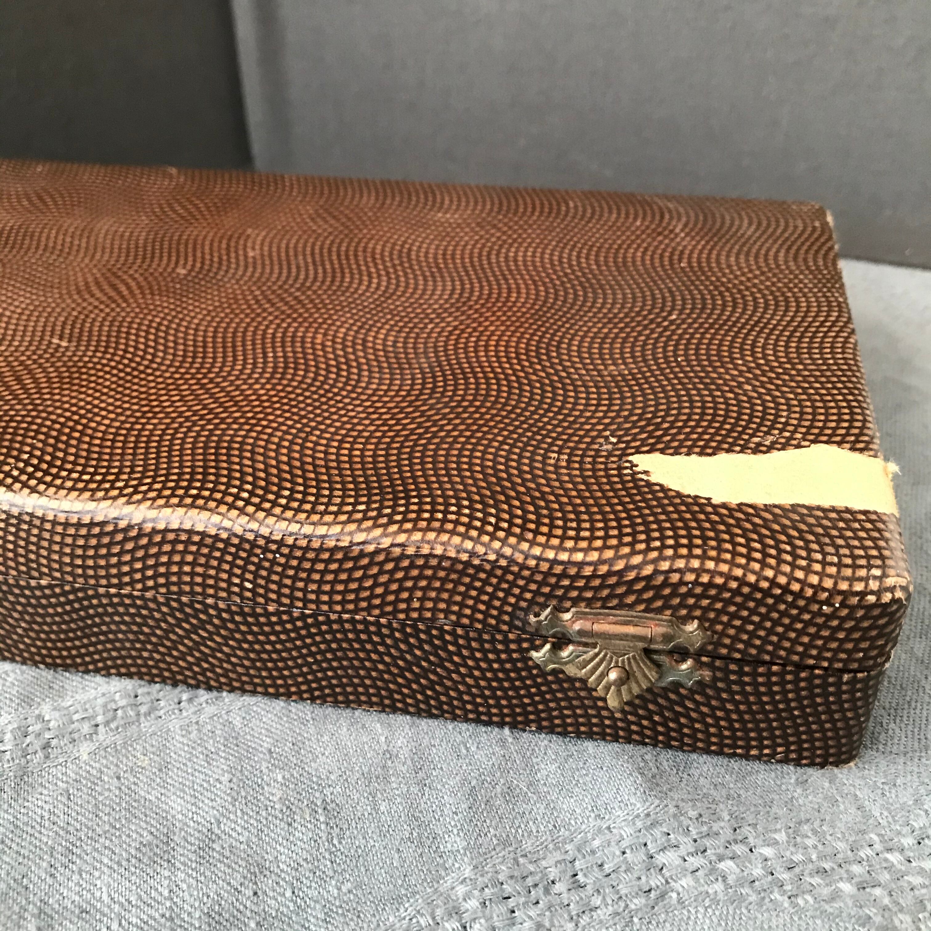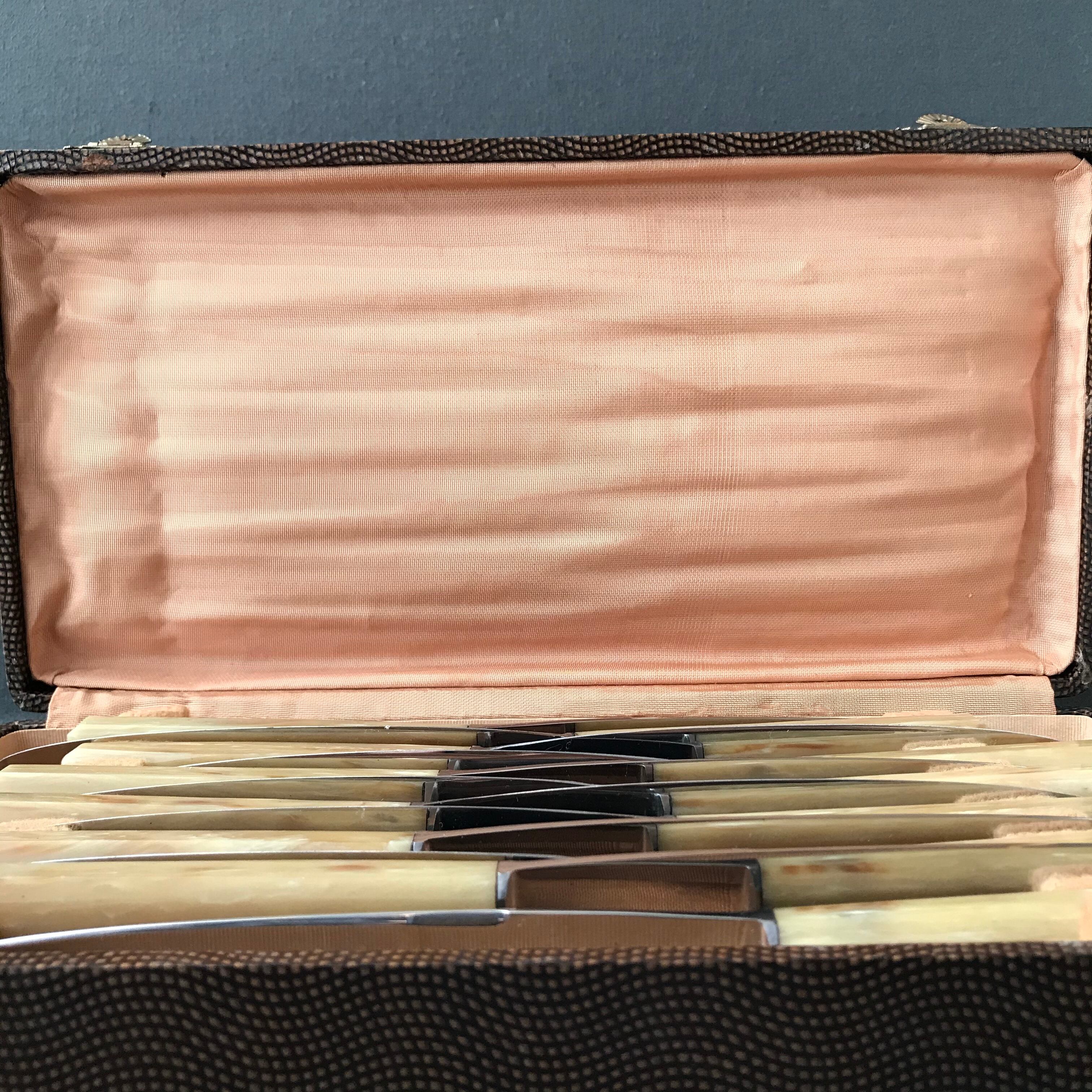 革のBOXに入ったナイフのセットです。ナイフはステンレスとベークライトです。BOXにダメージがあります。ナイフはとても良い状態です。フランスビンテージ。