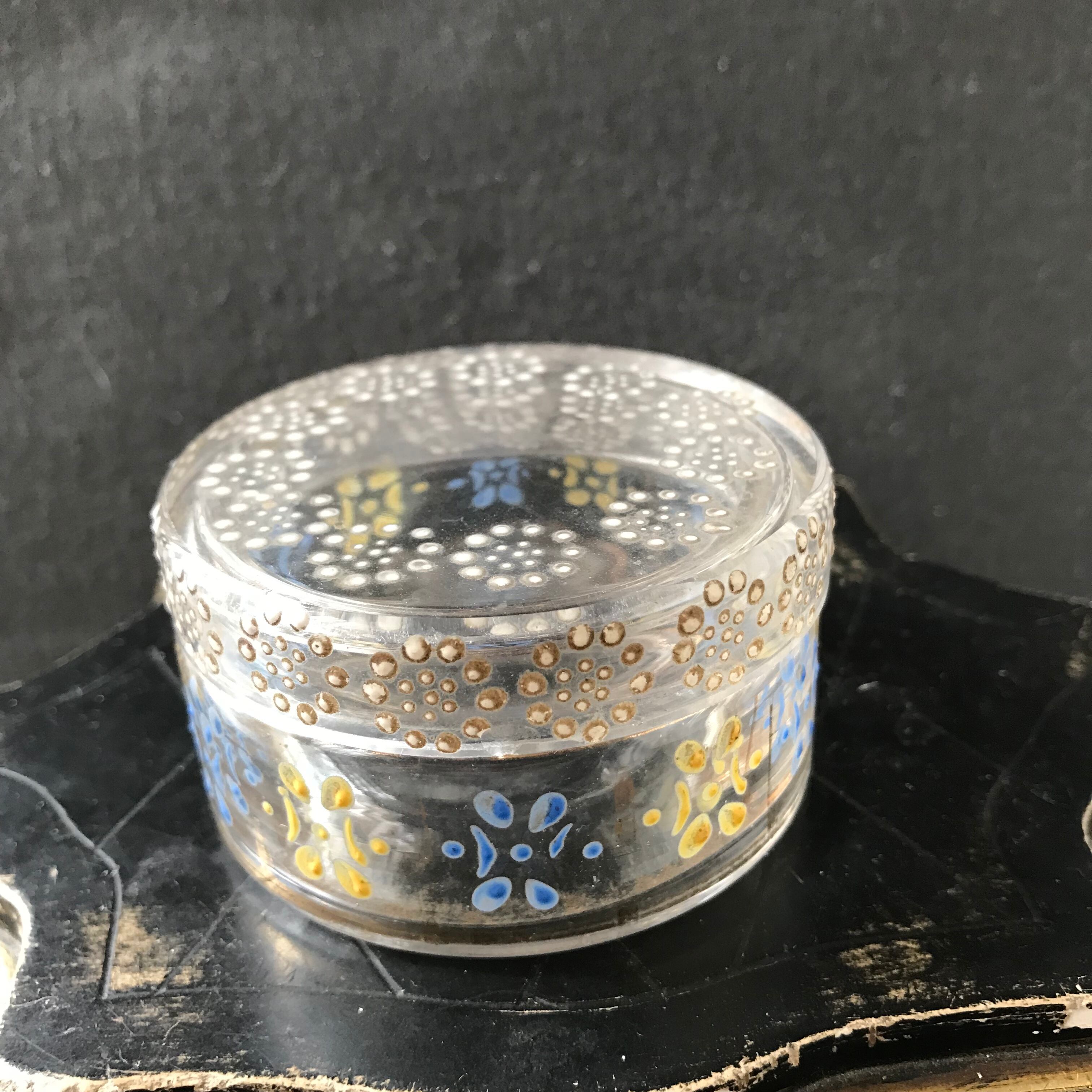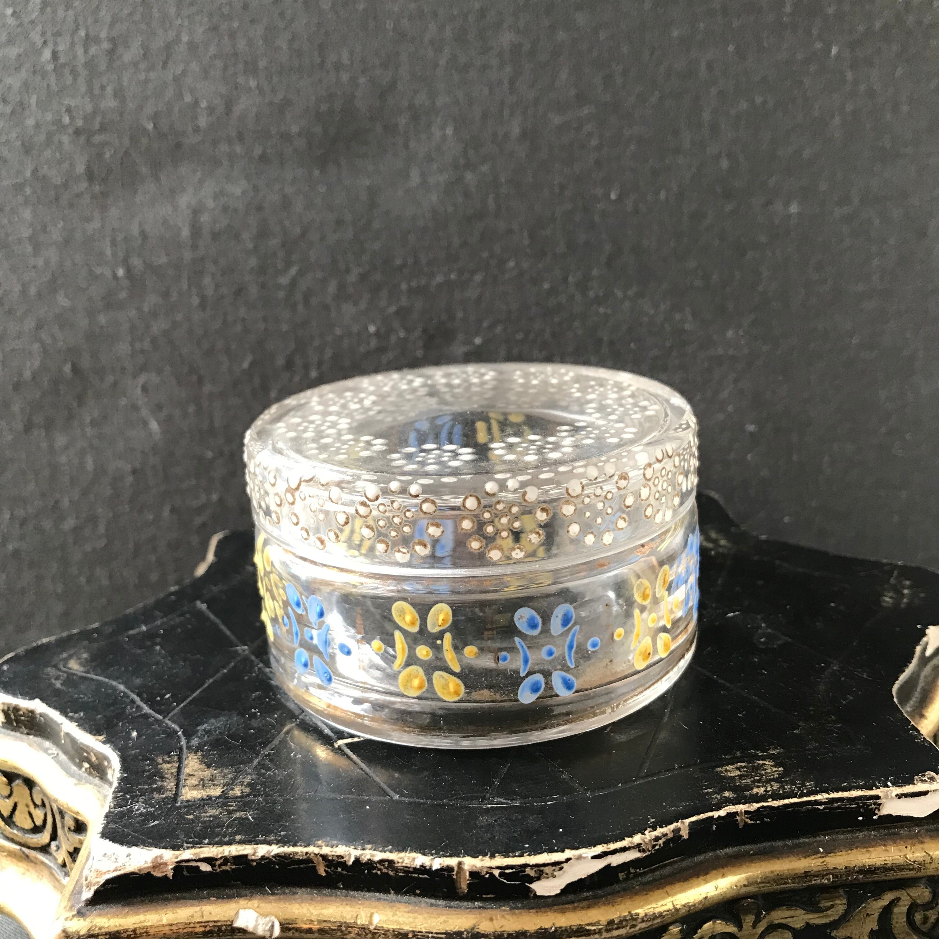 ・直径 6.8㎝ 高さ 4㎝ 蓋と周りに綺麗なエナメル装飾がついたガラスのボンボニエールです。ヒビカケ無く良い状態です。ジュエリーBOXやパウダーBOXとしてもお使い頂けます。フランスアンティーク。