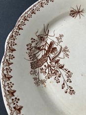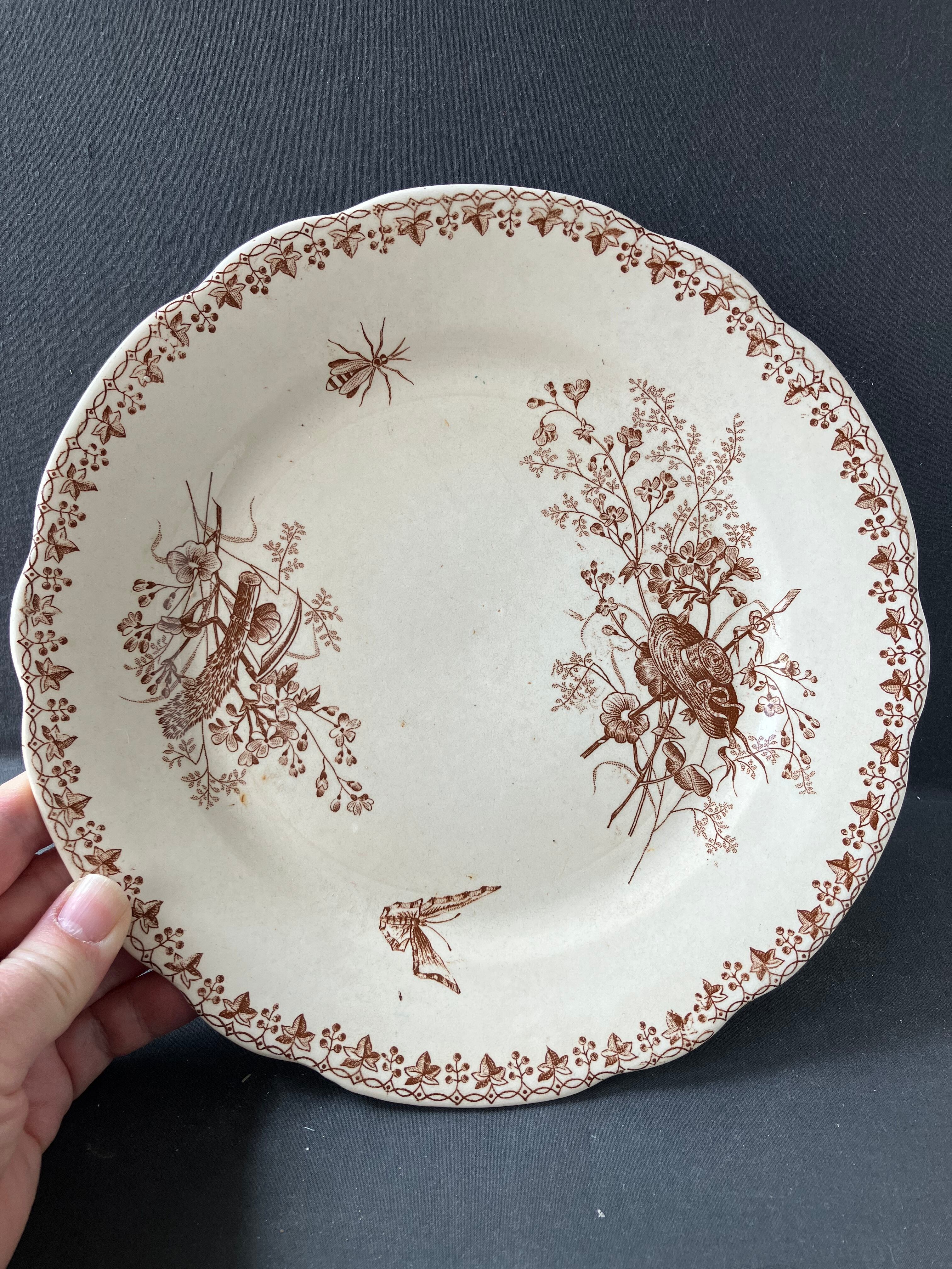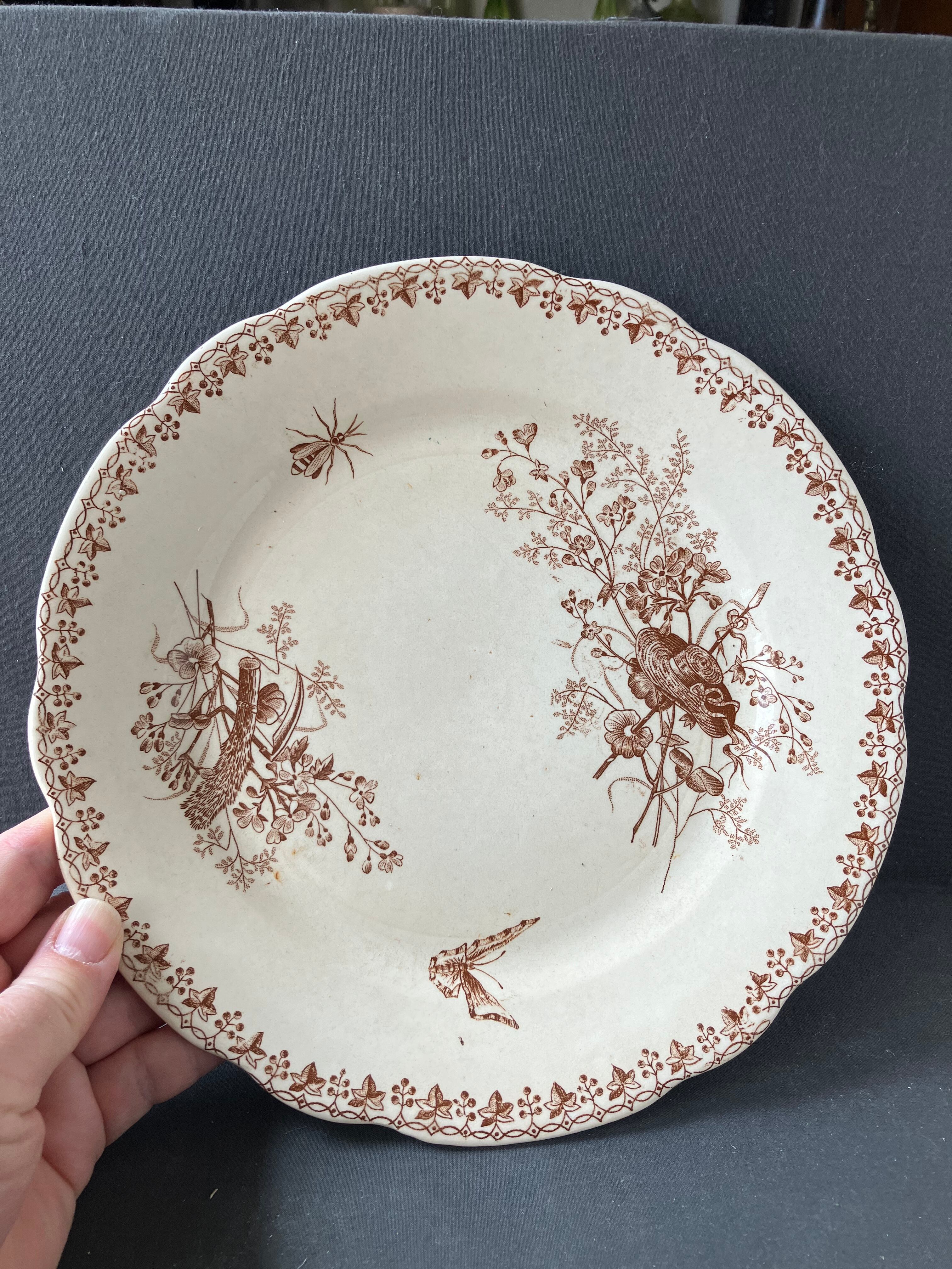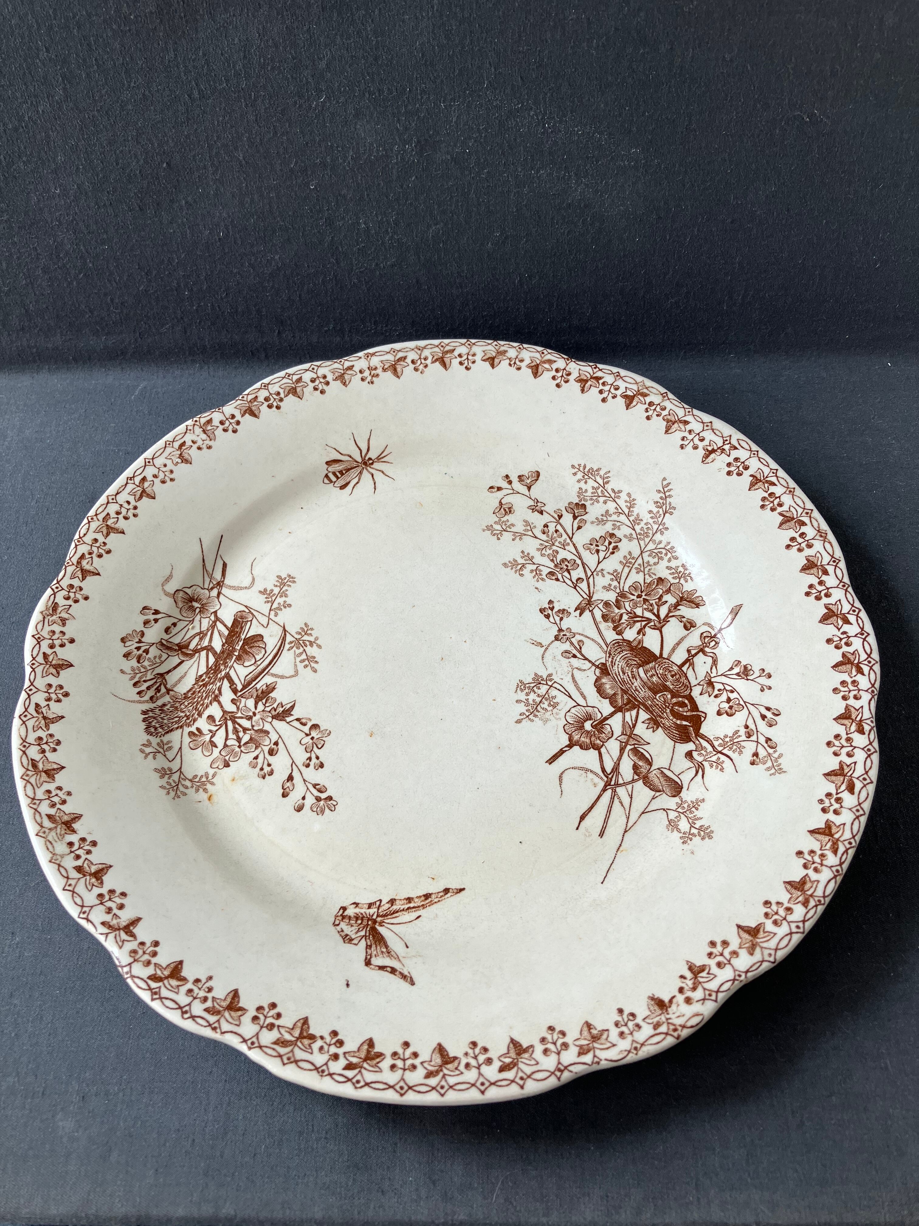 ・直径 24.2㎝ シェルエルイ ストローハット、勿忘草、蝶々や蜂の描かれたプレートです。ヒビカケ無く経年の割に良い状態です。フランスアンティーク。