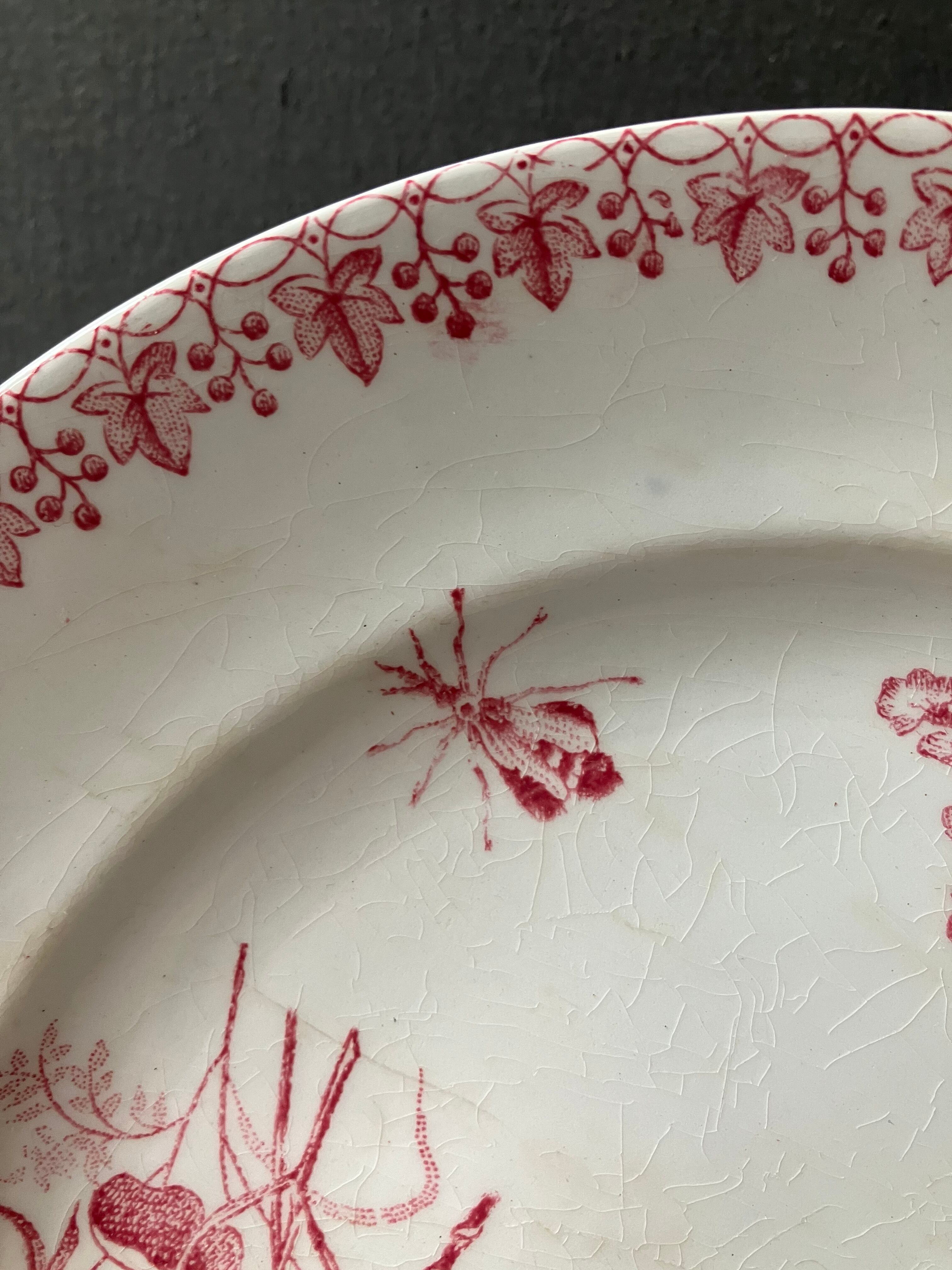 ・直径 23.5㎝ ストローハットや勿忘草、蜂や蝶々が描かれた赤絵付けのプレートです。若干の貫入はありますがヒビカケ無く経年の割に良い状態です。フランスアンティーク。