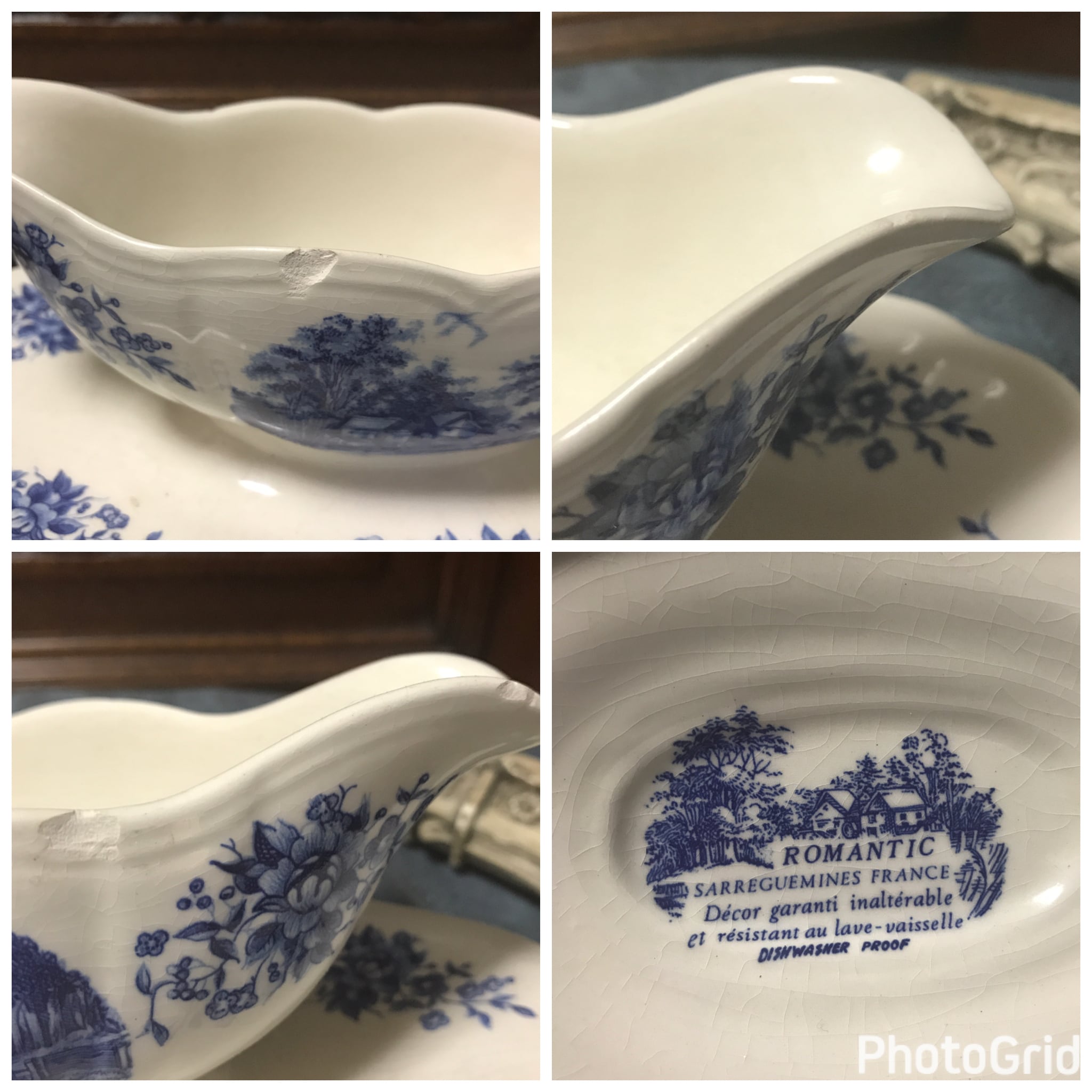 サルグミンヌの田園風景やお花がブルーで描かれたソーシエールです。小さなチップが4ヶ所あります。画像でご確認ください。そちらを考慮したお値段です。お花を浮かべたり、生けたりすると綺麗です。
