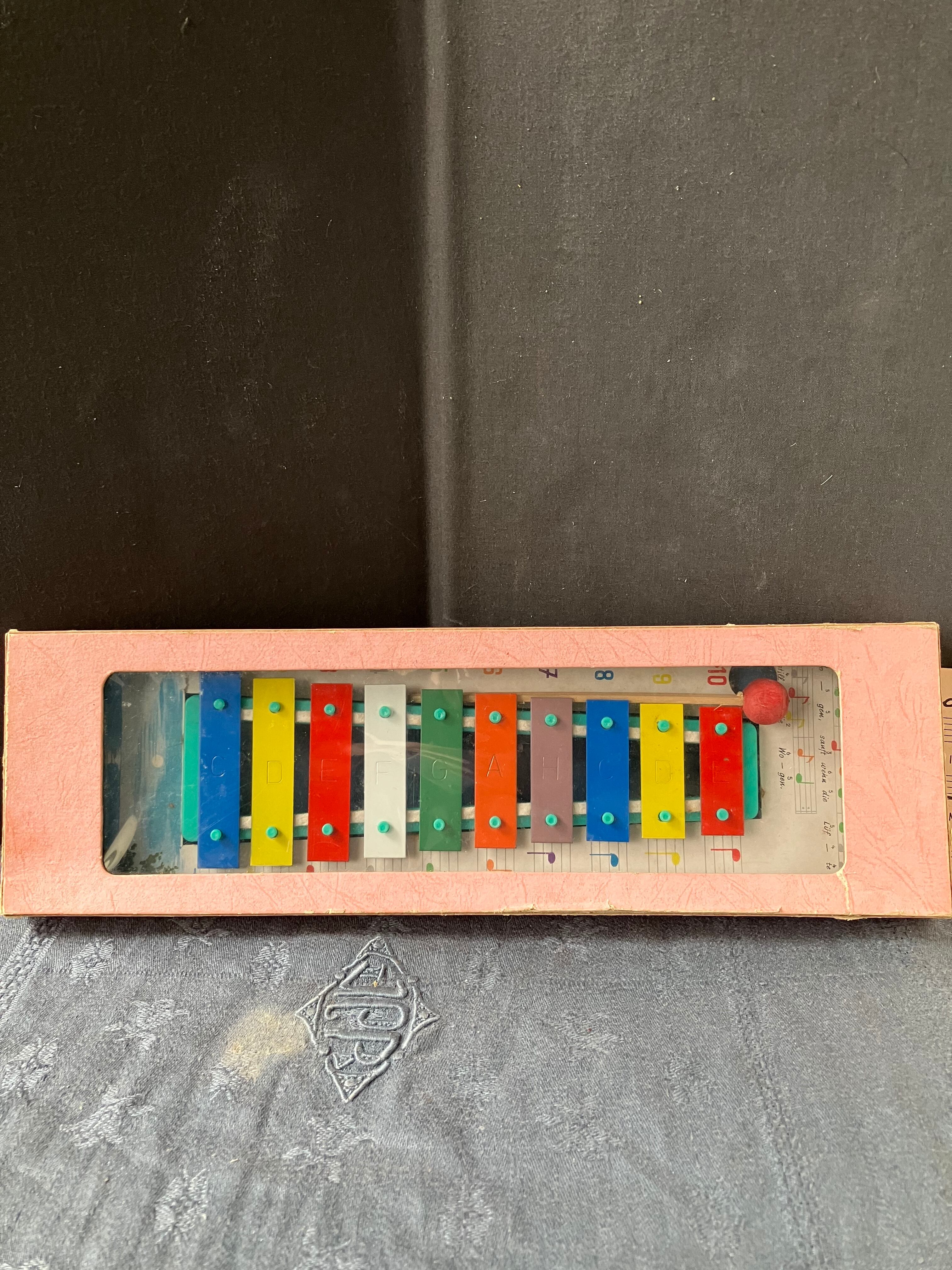 ・箱 10.5㎝ 横 35㎝ モーヴピンクの箱に入った可愛らしい木琴です。箱も可愛らしいですが