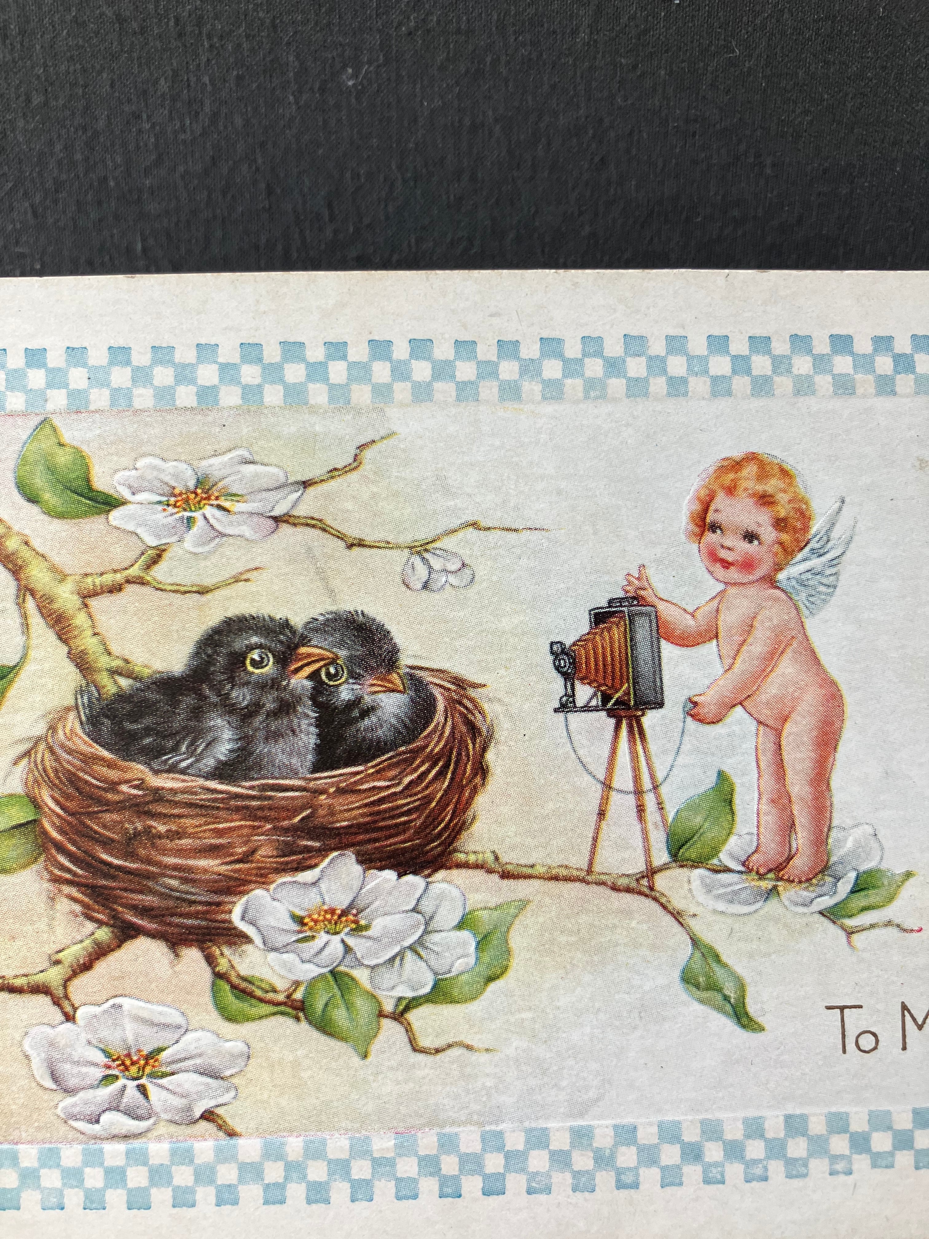 ・縦 9㎝ 横 14㎝ ふわふわのツバメの赤ちゃんとフォトを撮るエンジェルが可愛らしいカードです。イギリスアンティーク。