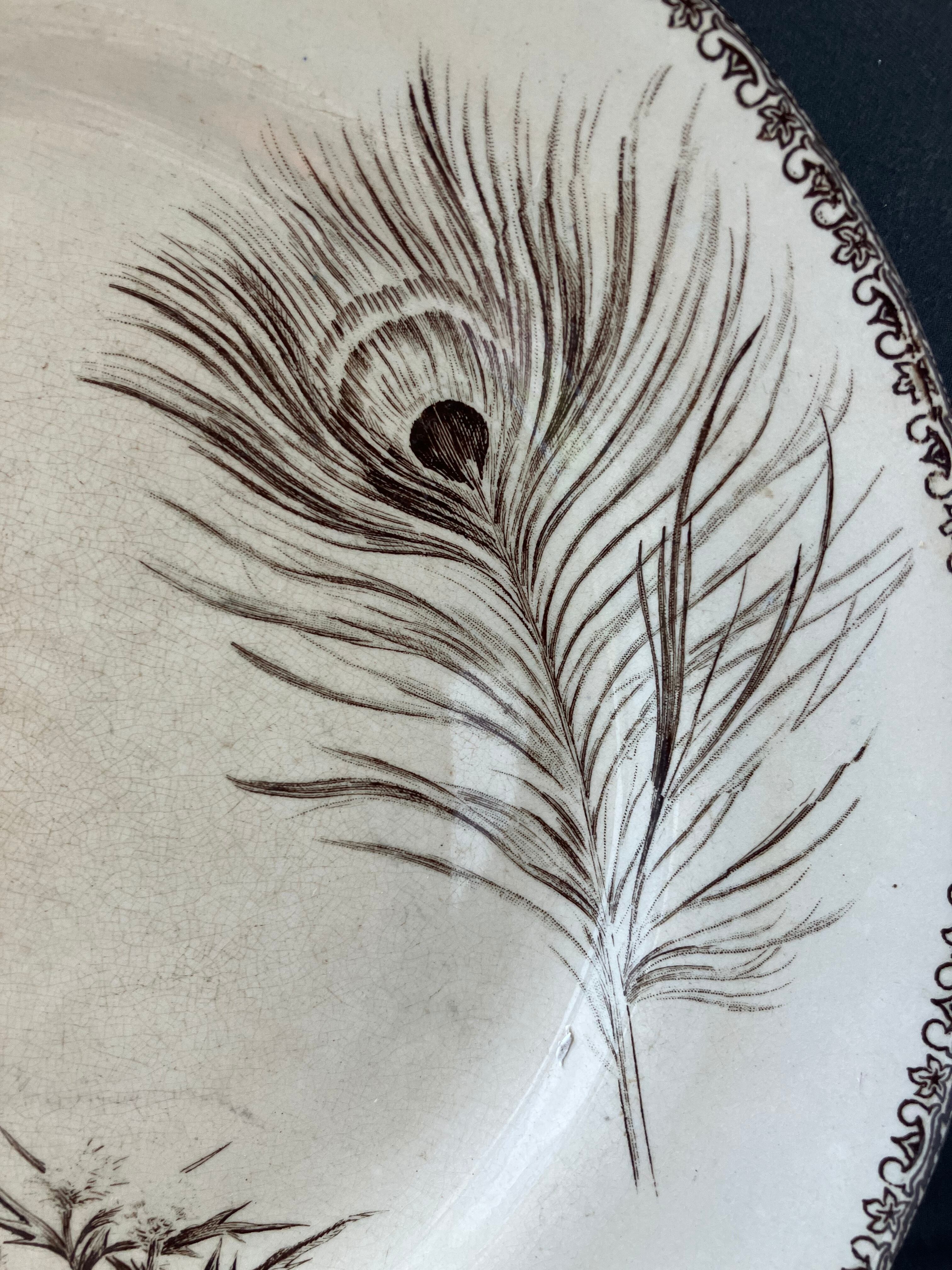 ・直径 23㎝ GRAND DEPOT 孔雀の羽根、アザミ、鴨、桃などが描かれたシノワズリのプレートです。5㎝のラインがあります。ご使用には問題ありません。ヒビカケはありません。フランスアンティーク。