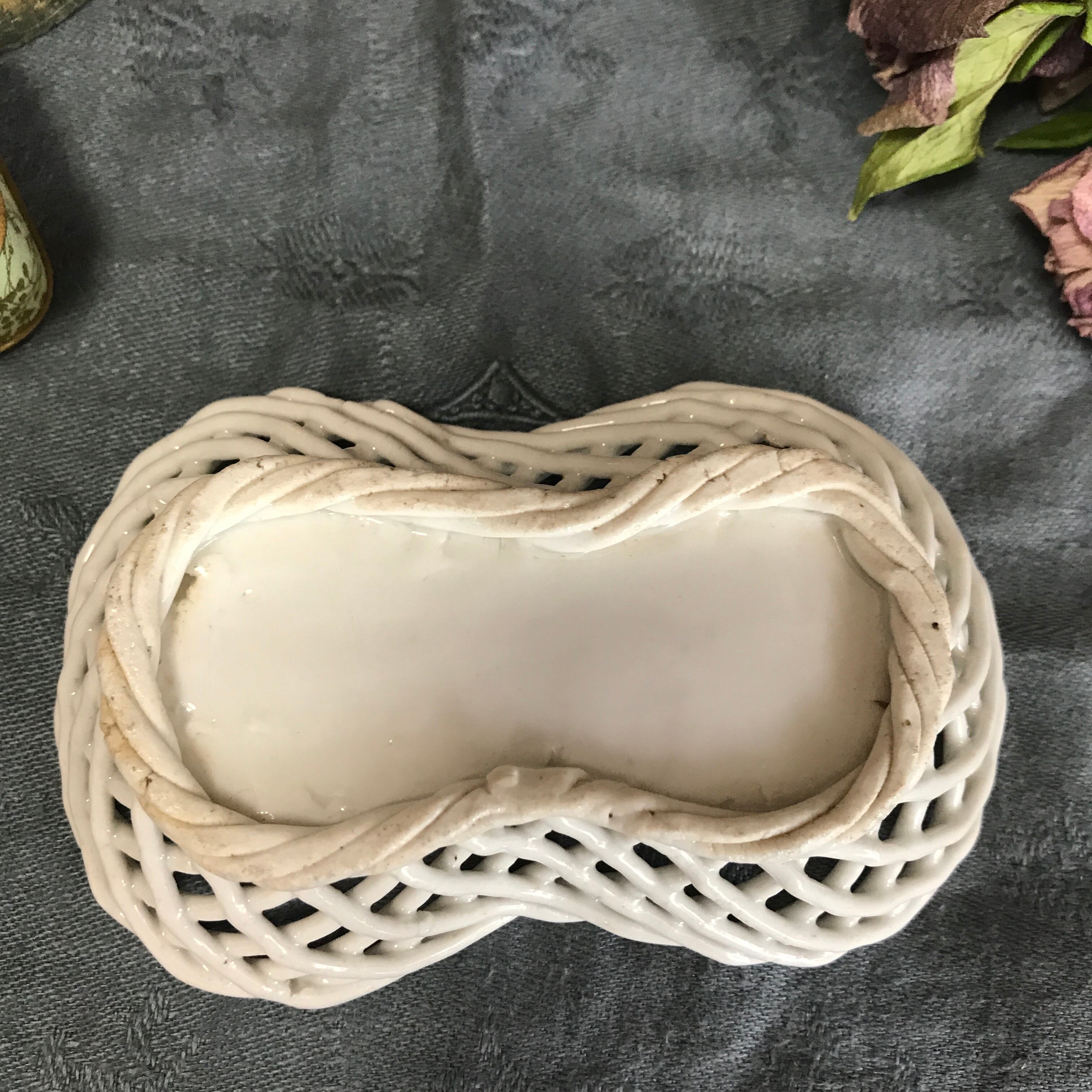 ・縦 7.5㎝ 横 12㎝ 高さ 3㎝ パニエ編みの繊細な陶器です。中央には手描きでバラや花が描かれています。パニエ編みの陶器は素晴らしい技術がいる逸品です。フランスアンティーク。商品合計20000円以上で送料無料です。