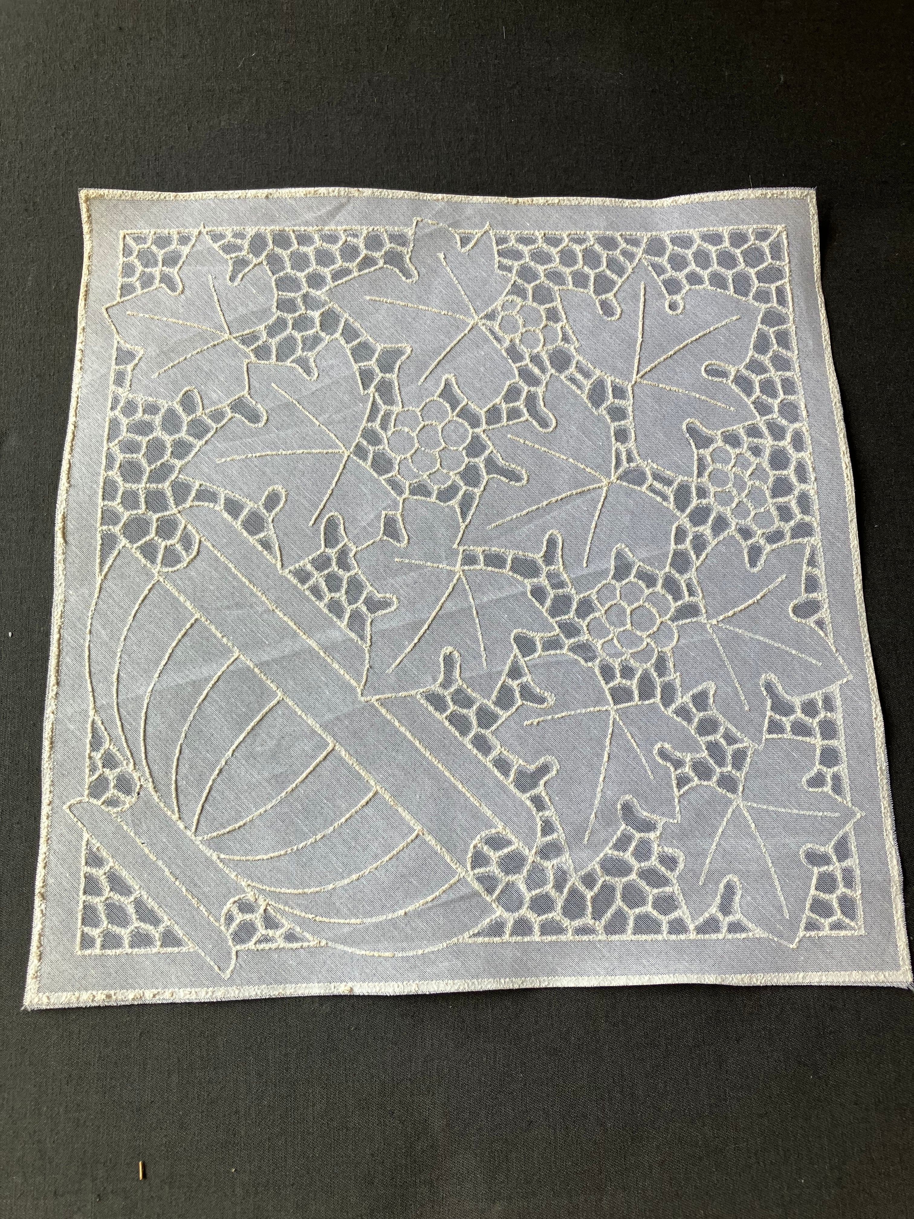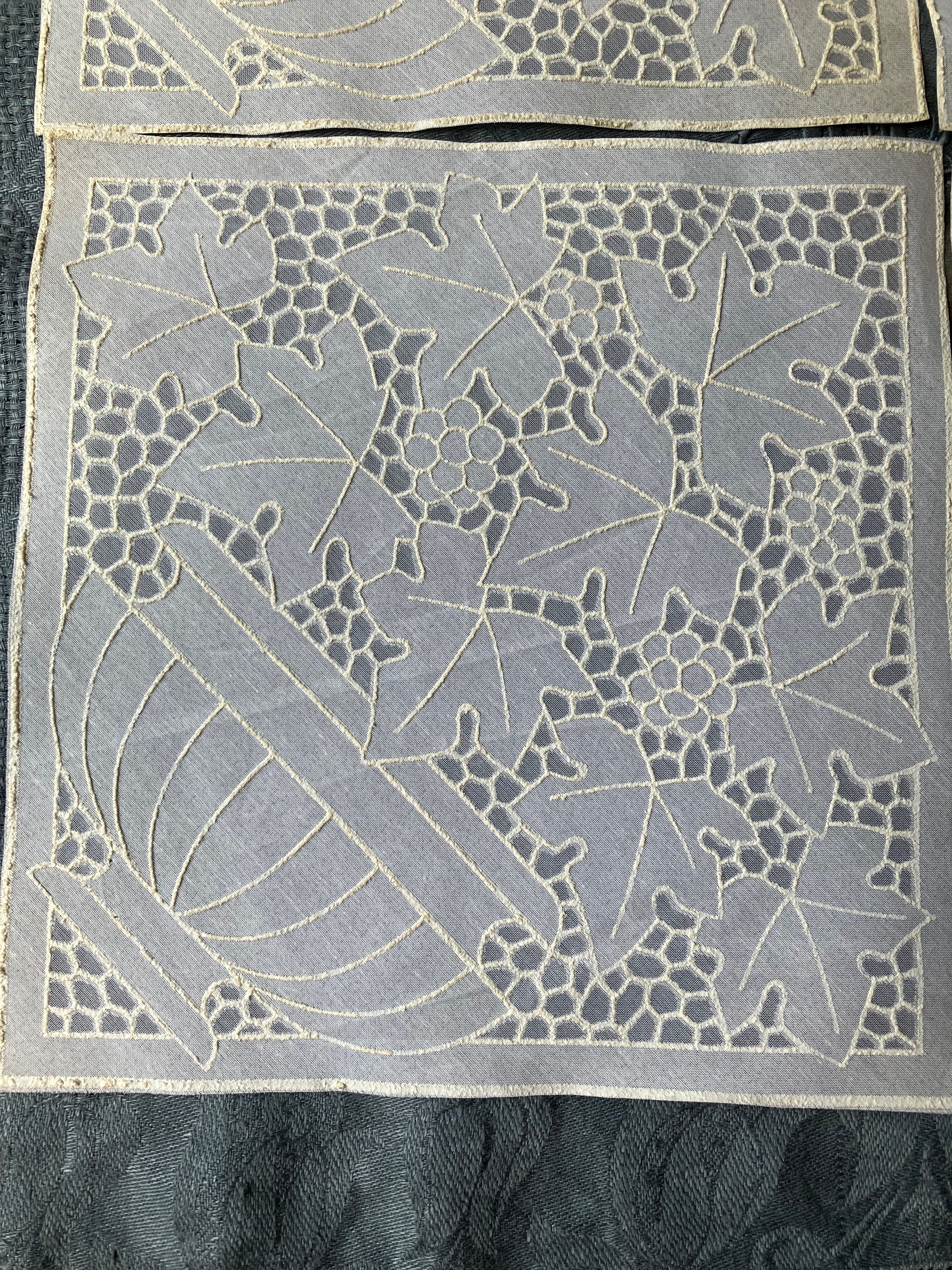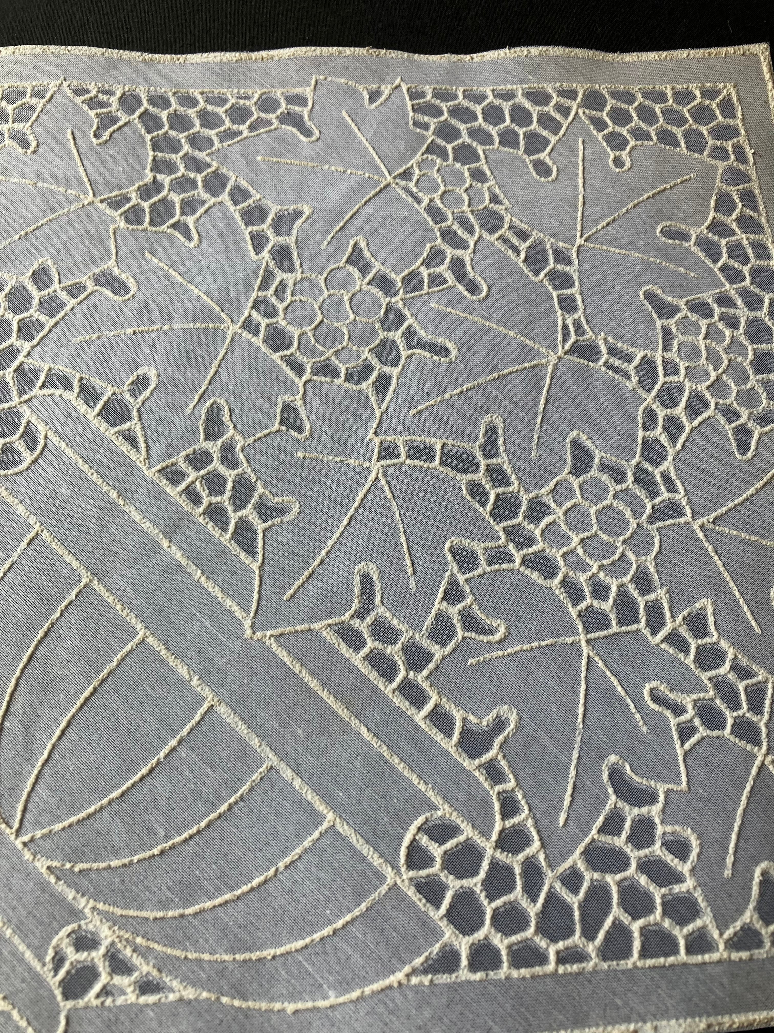 チュールレースにブドウとジャルディニエールのモチーフが入ったパネルです。ふくれ加工が施してあります。5枚ありますので4枚繋げて大きなパネルにして頂いたり、裏打ちしてティーマットや
