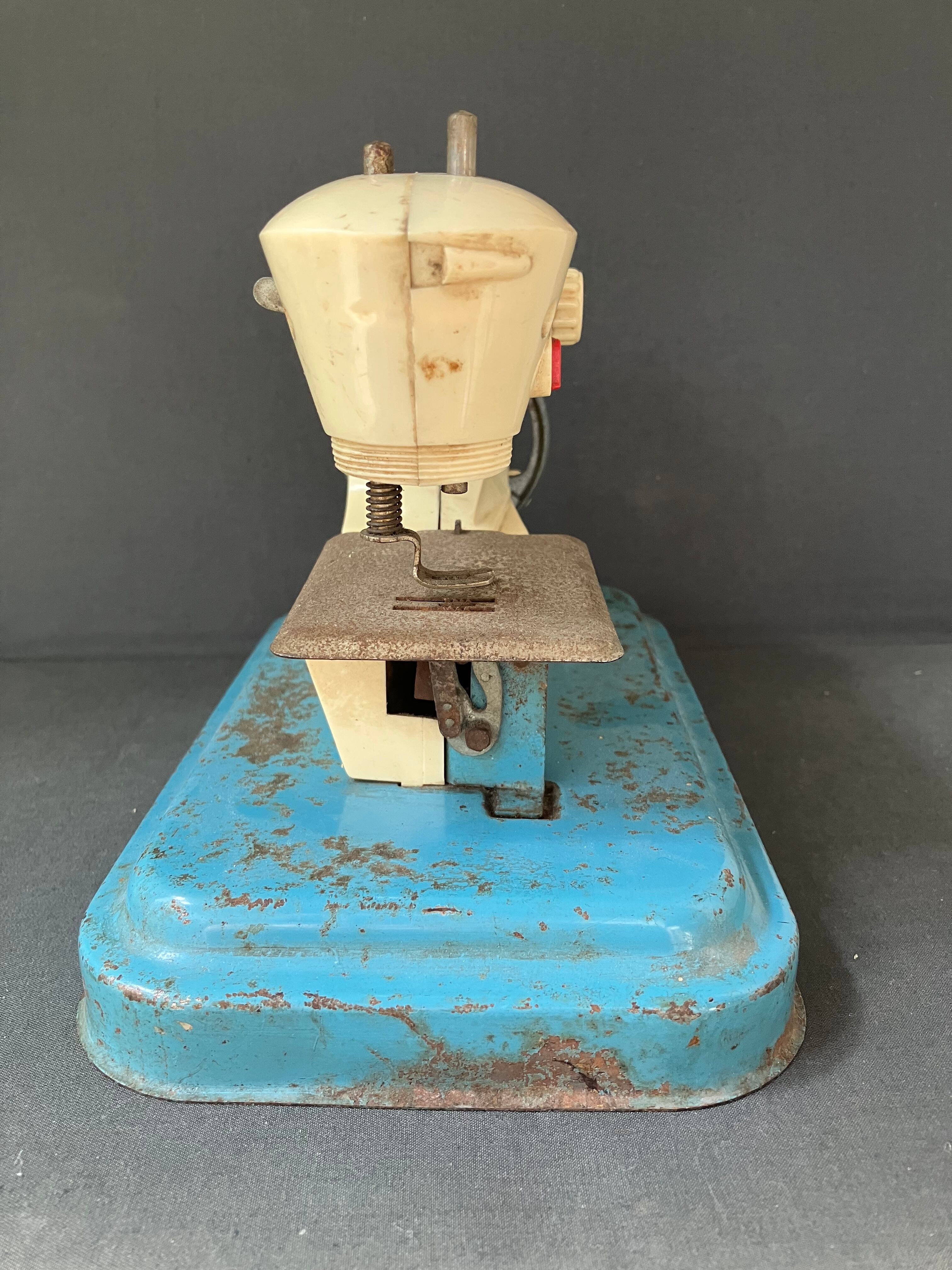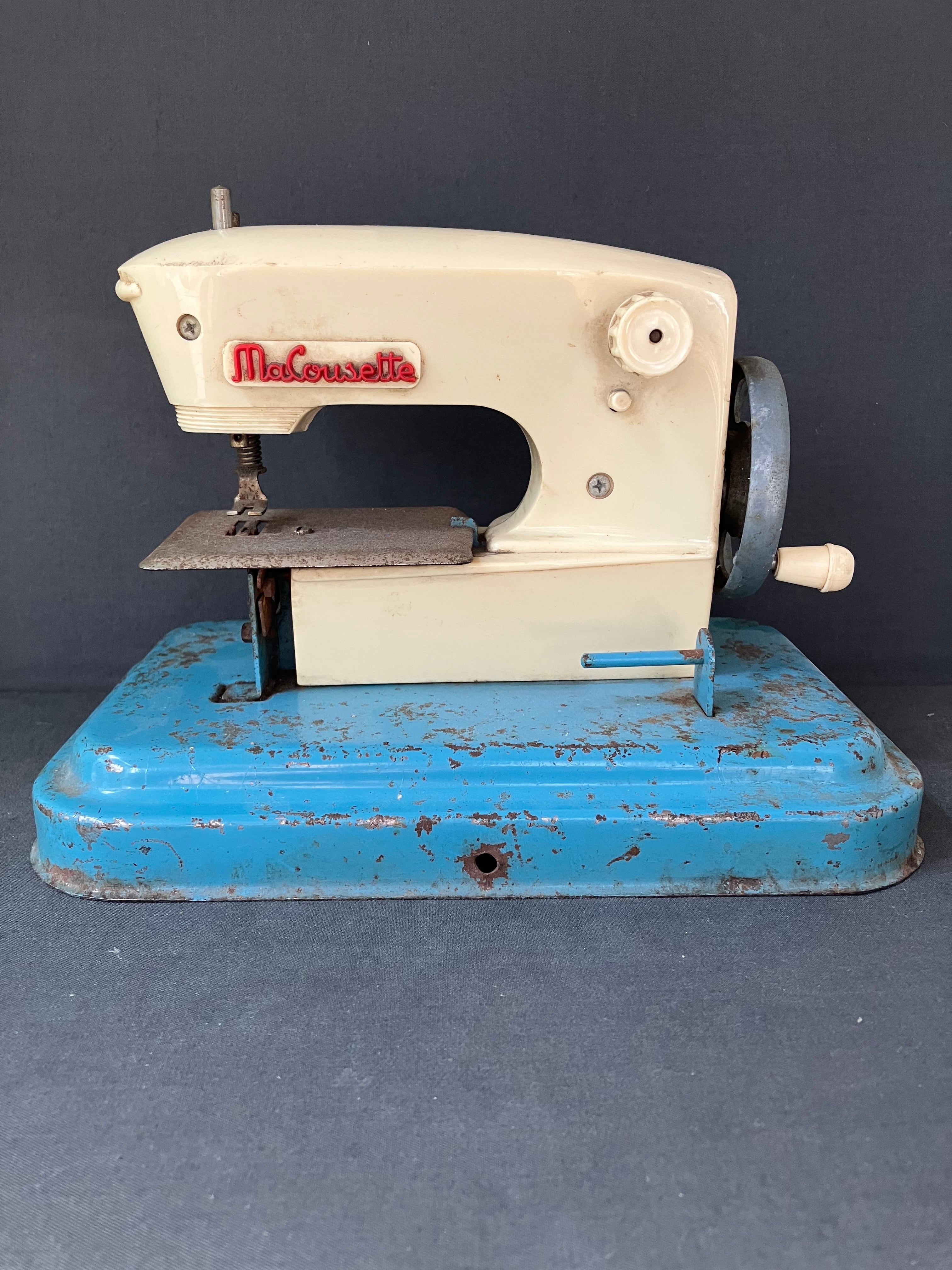 ・縦 14㎝ 横 23㎝ 高さ 16.3㎝ アイボリー色にレッドのロゴ、シャビィブルーの台のトイミシンです。ハンドルを回すと動きます。フランスビンテージ。