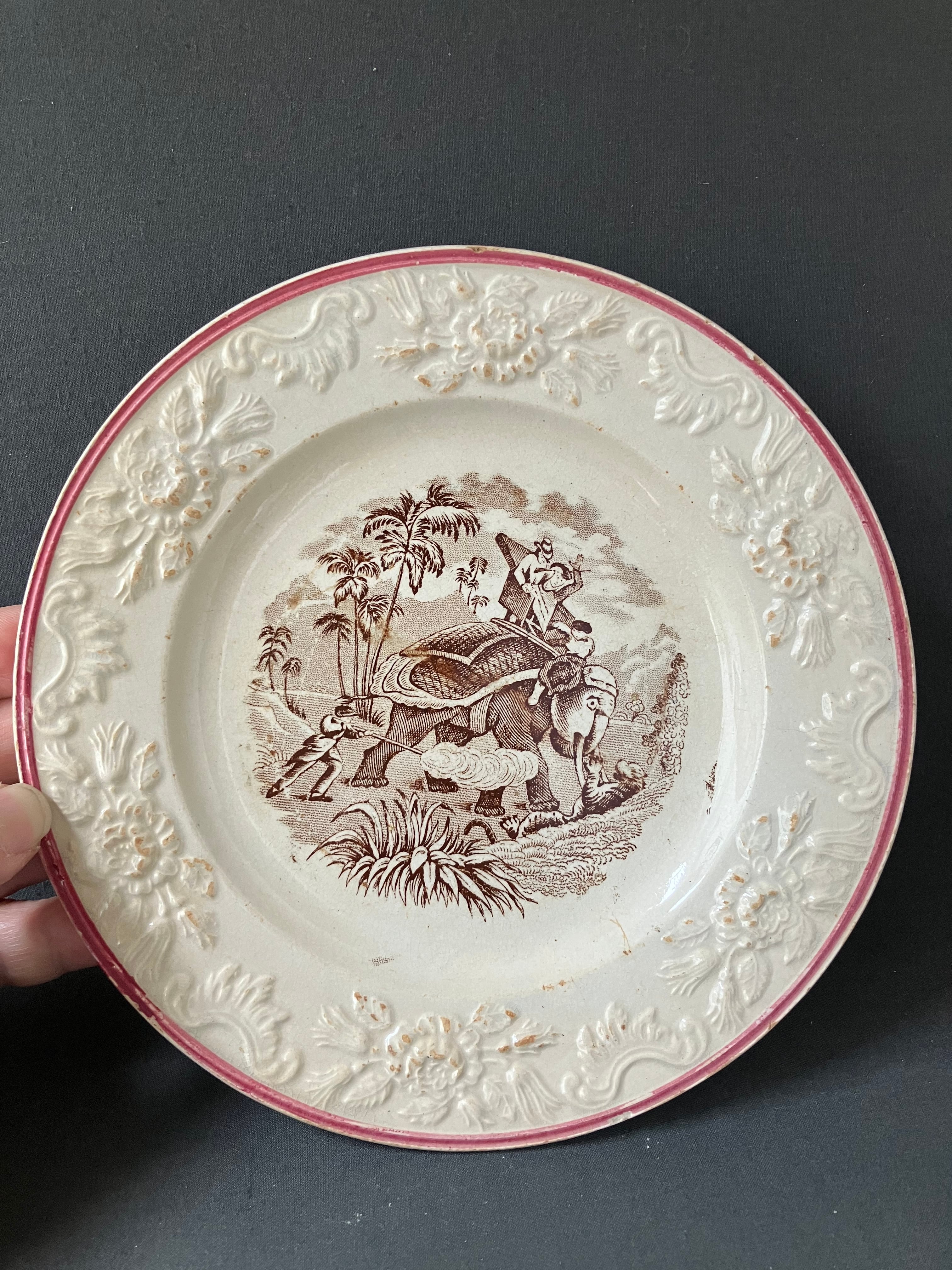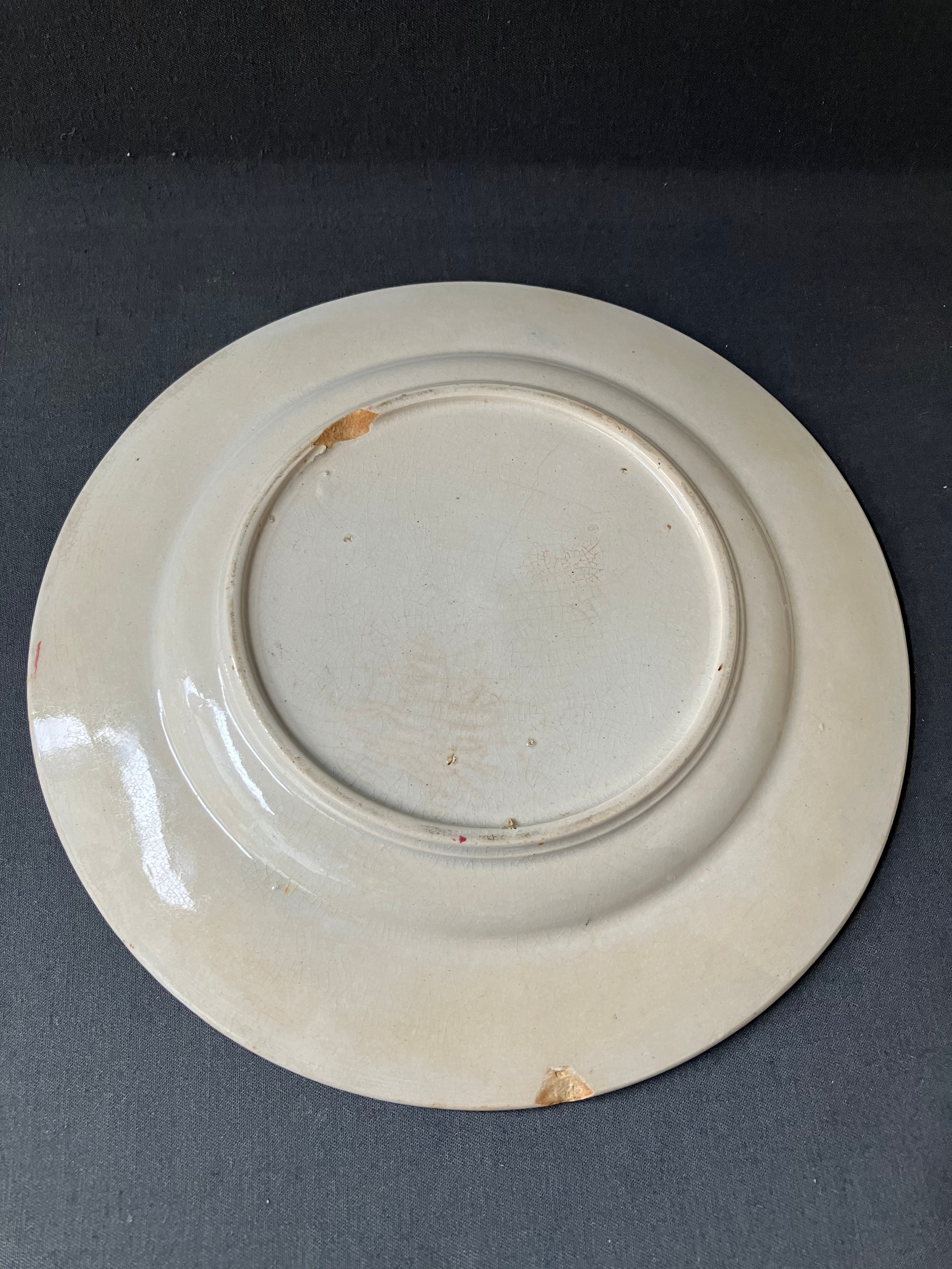・直径 19㎝ 縁周りのピンクラインとレリーフが素晴らしいプレートです。全体の枯れ具合とモチーフが高めあってアンティークプレートならではの仕上がりになっております。裏面に2ヶ所スレカケがございます。フランスアンティーク。