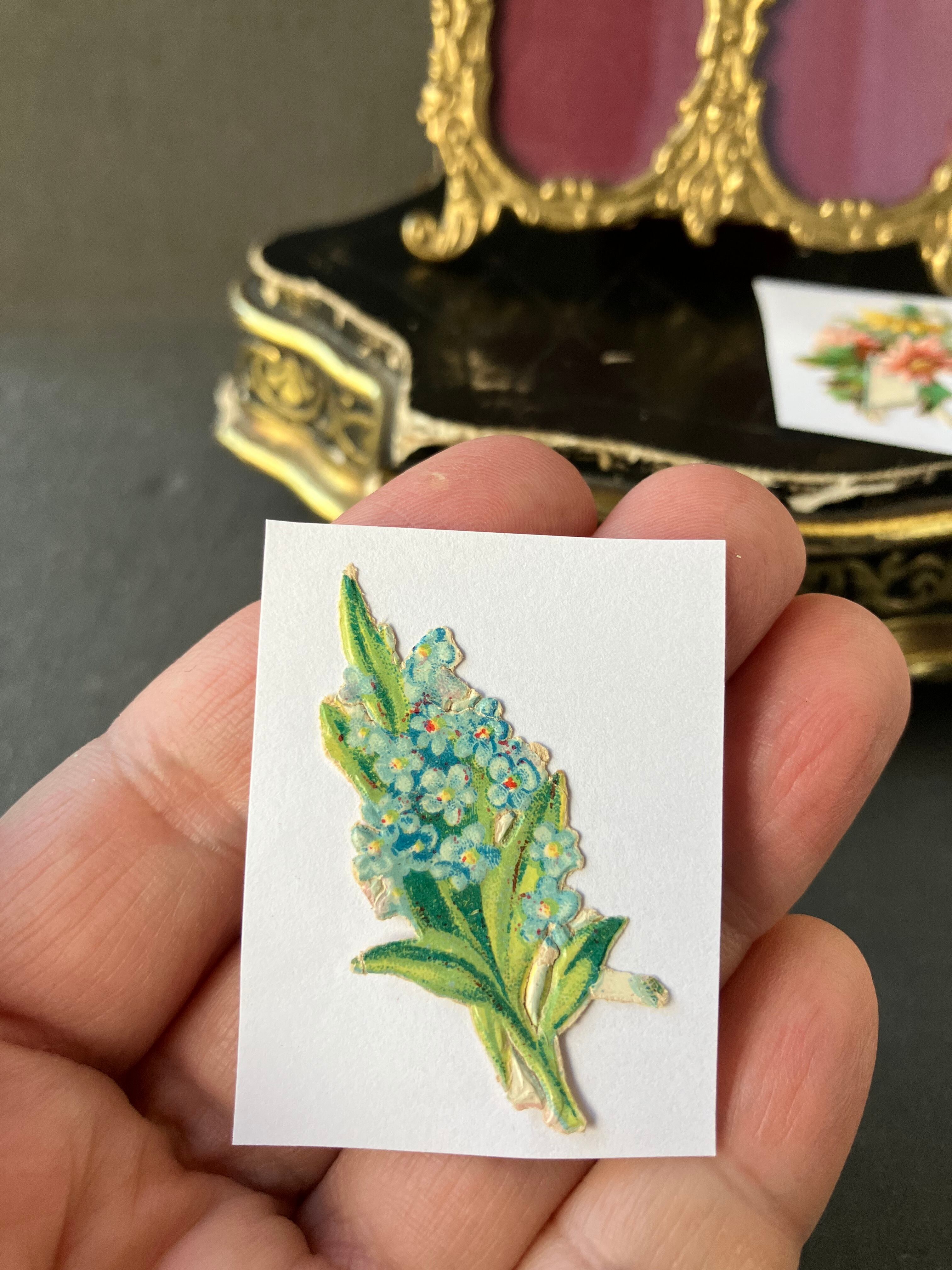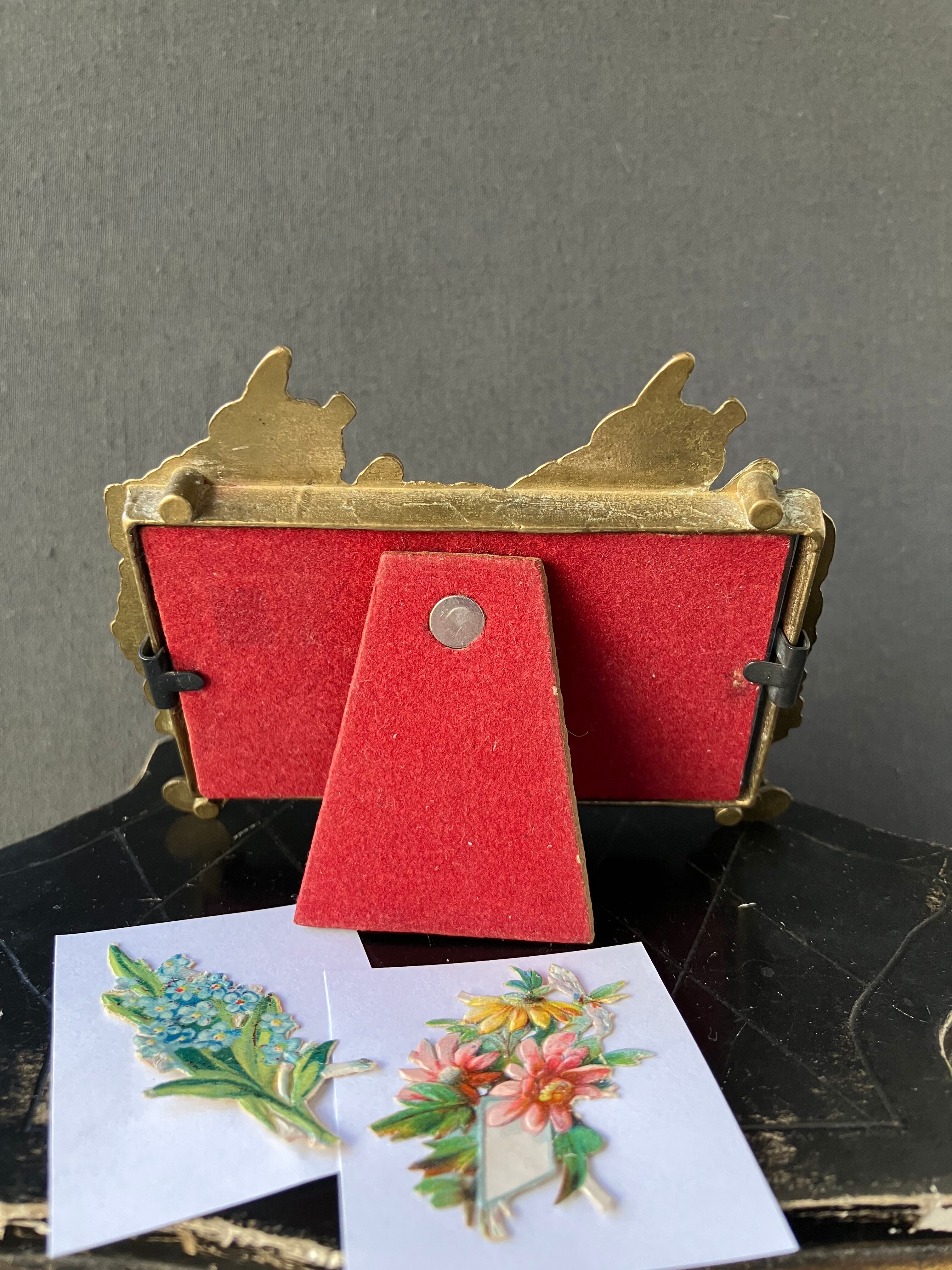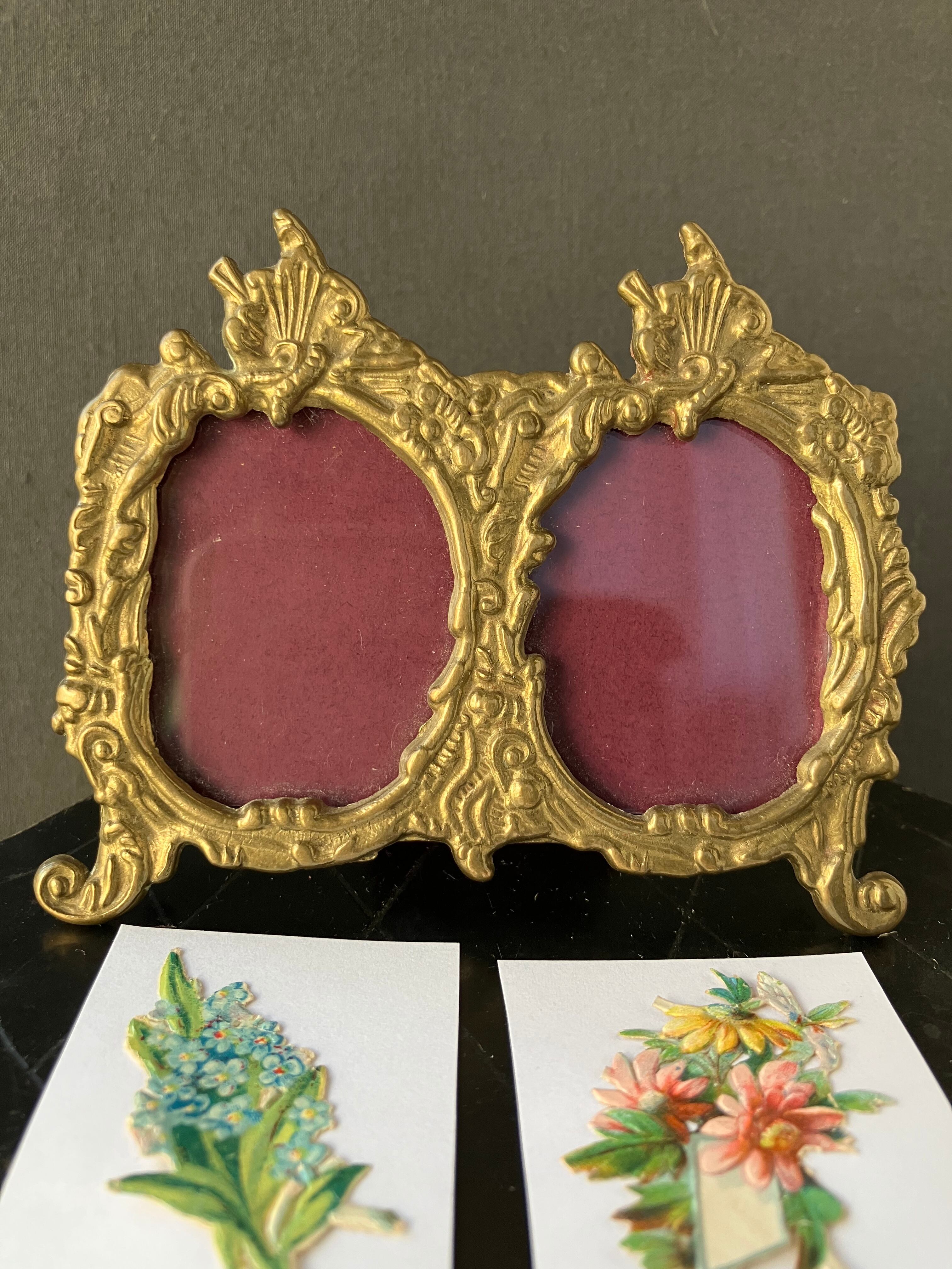 ・縦 8㎝ 横 9.5時 真鍮製 ロカイユのダブルフレームのフォトスタンドてす。ガラスも付いています。勿忘草とマーガレットのクロモスお付けします。1940年から50年。フランスビンテージ。