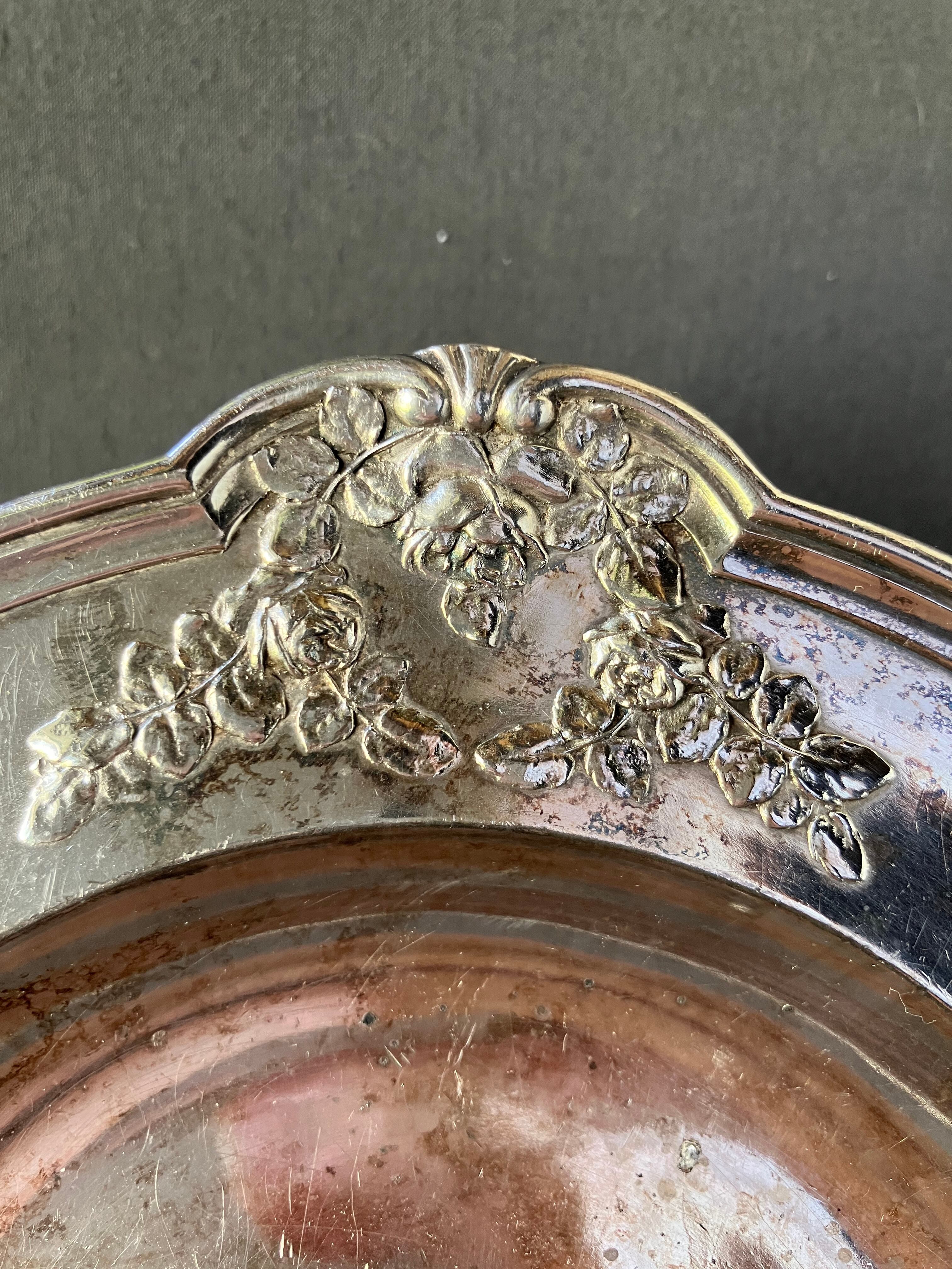 ・直径 19㎝ ARGITのシルバープレートのプレートです。バラとリーフのガーランドにエンジェルのような顔のモチーフが入った素晴らしいモールドのシルバープレートです。刻印入っています。小傷はございますが、経年の割に良い状態です。1920年から30年。フランスアンティーク。