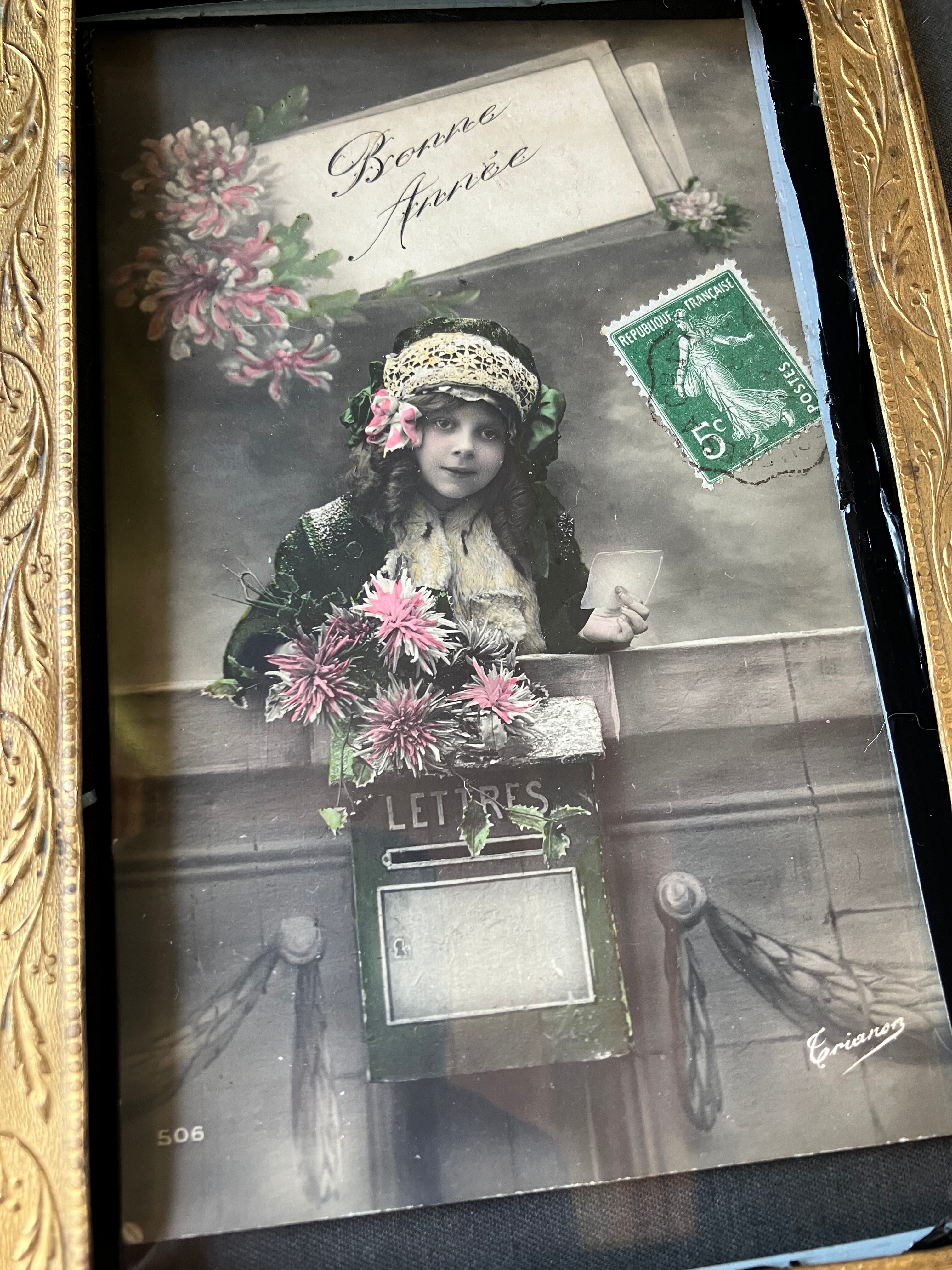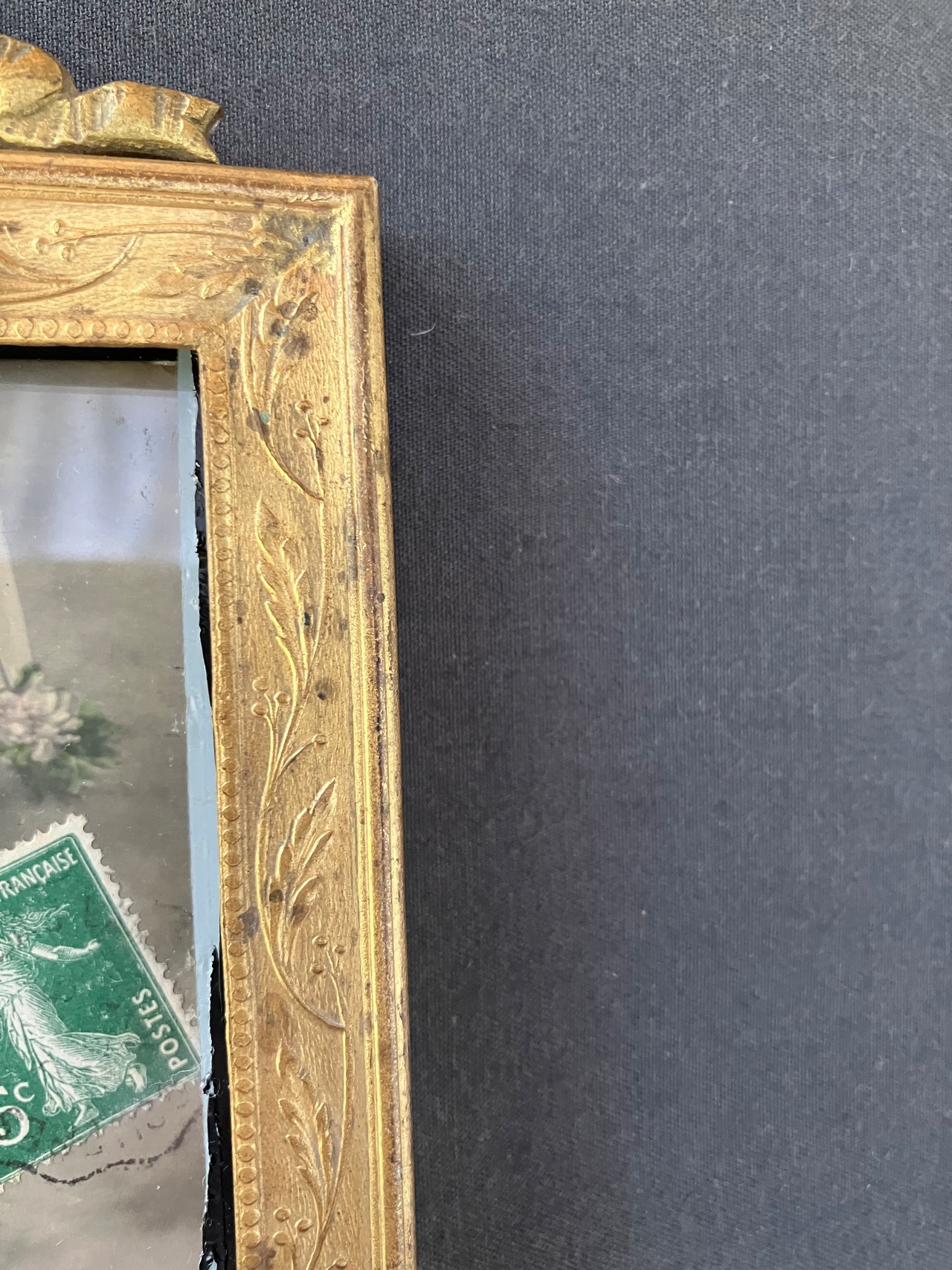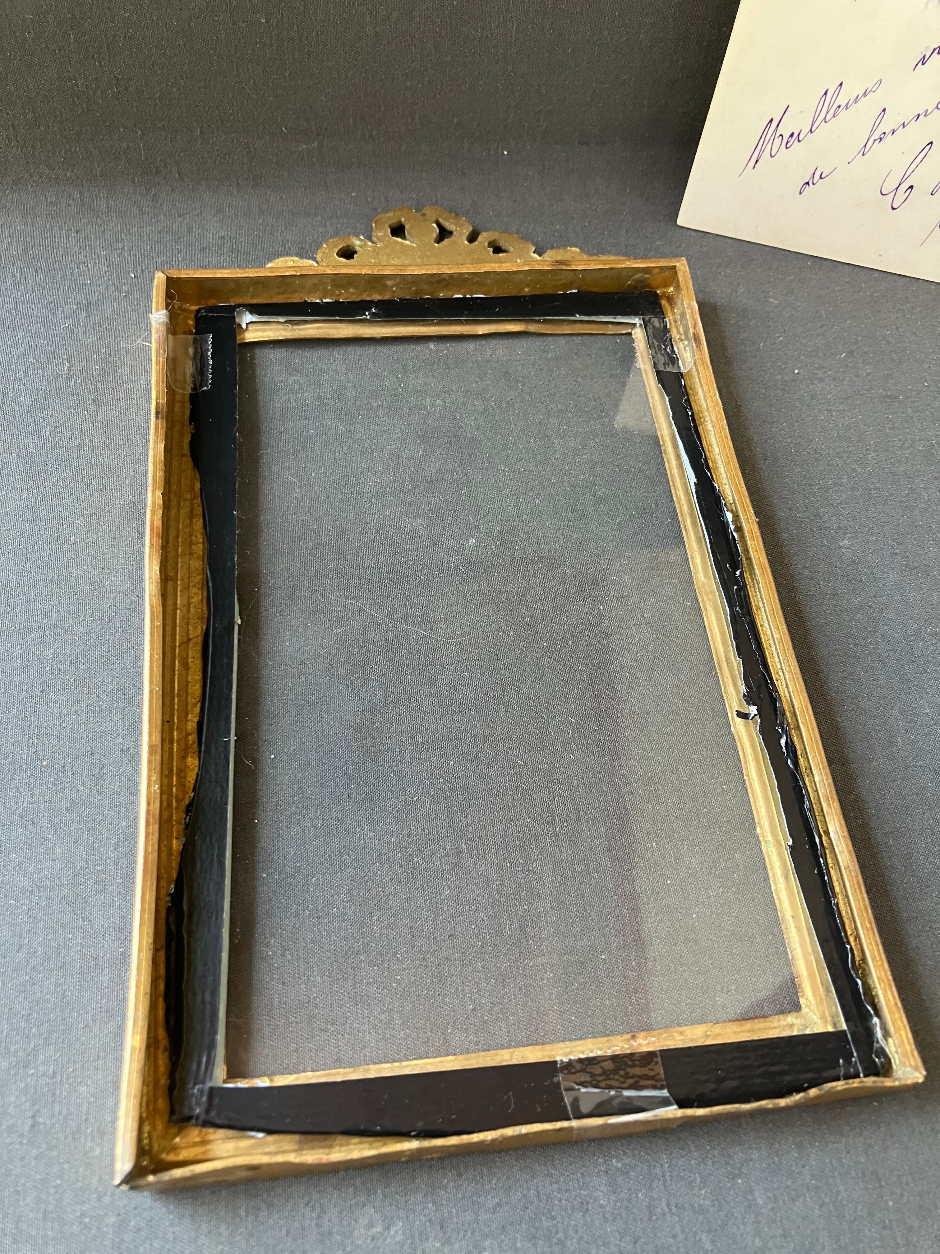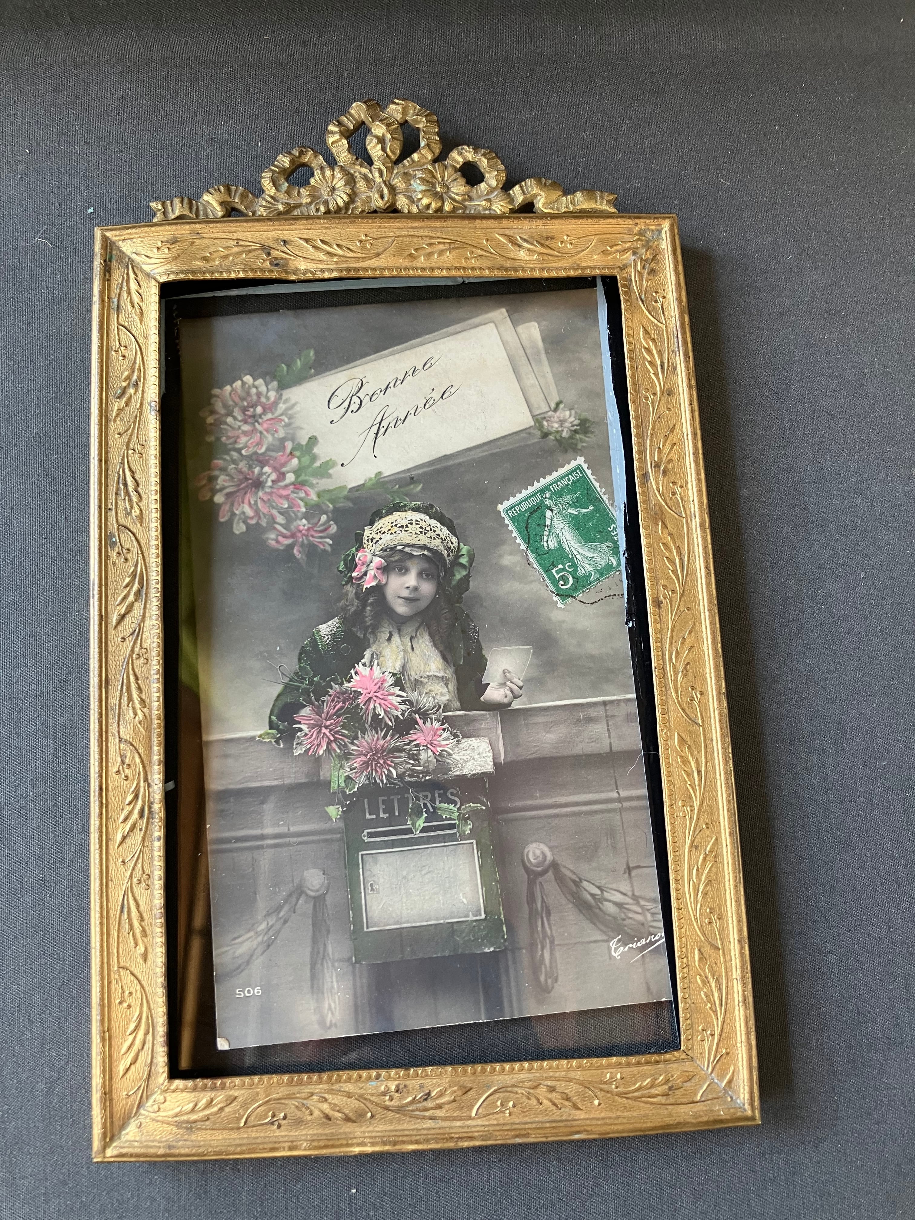 ・縦 19.3㎝ 横 11.3㎝ 真鍮製のリボントップと縁周りのレリーフが素晴らしいフォトフレームです。裏打ちがありません。ガラスは前のオーナーさんが、合わせて付けてあります。ポストカードもお付けします。1920年から30年。フランスアンティーク。