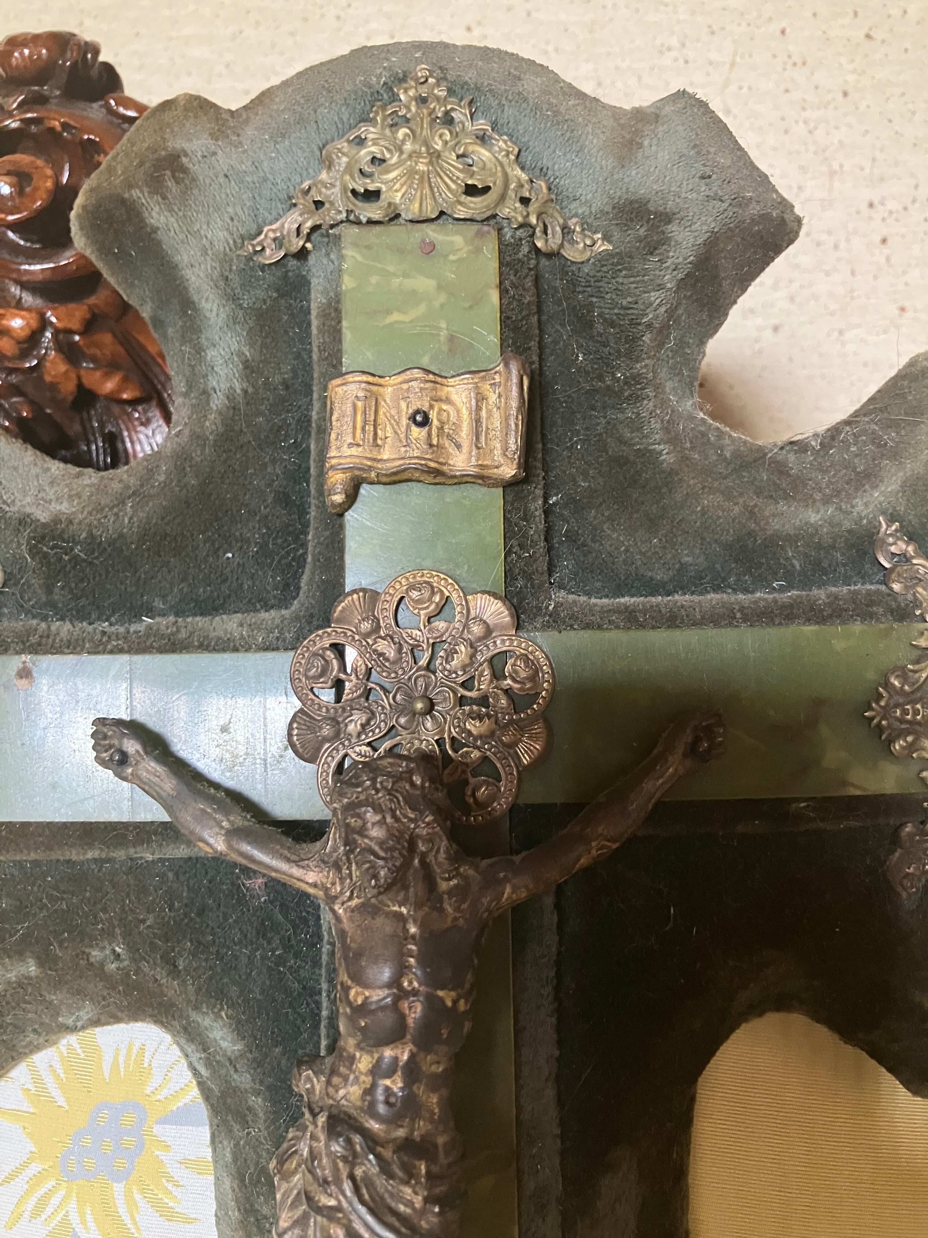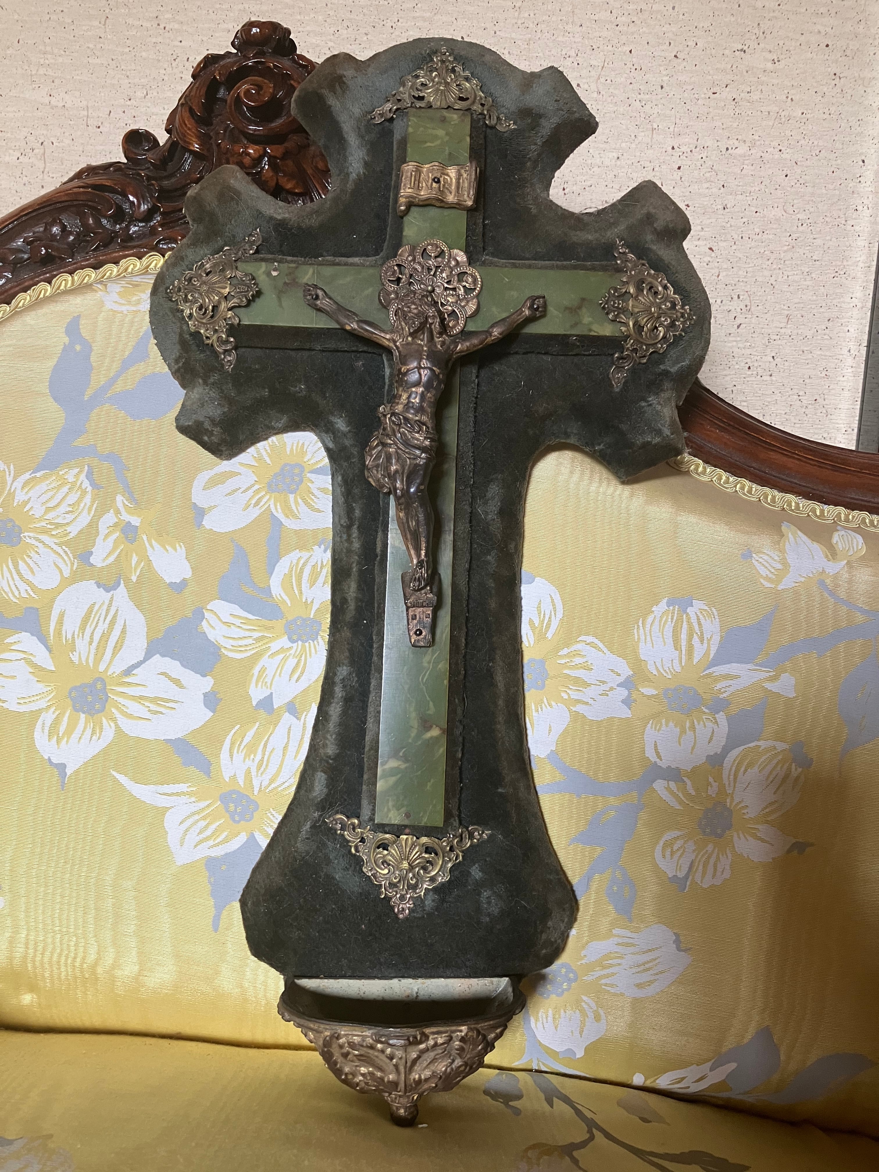 ・縦 42㎝ 横 22㎝ 深いモスグリーンのクロスにマーブルの代理石のクロス、真鍮のイエスやロカイユの装飾が素晴らしいベネティエです。