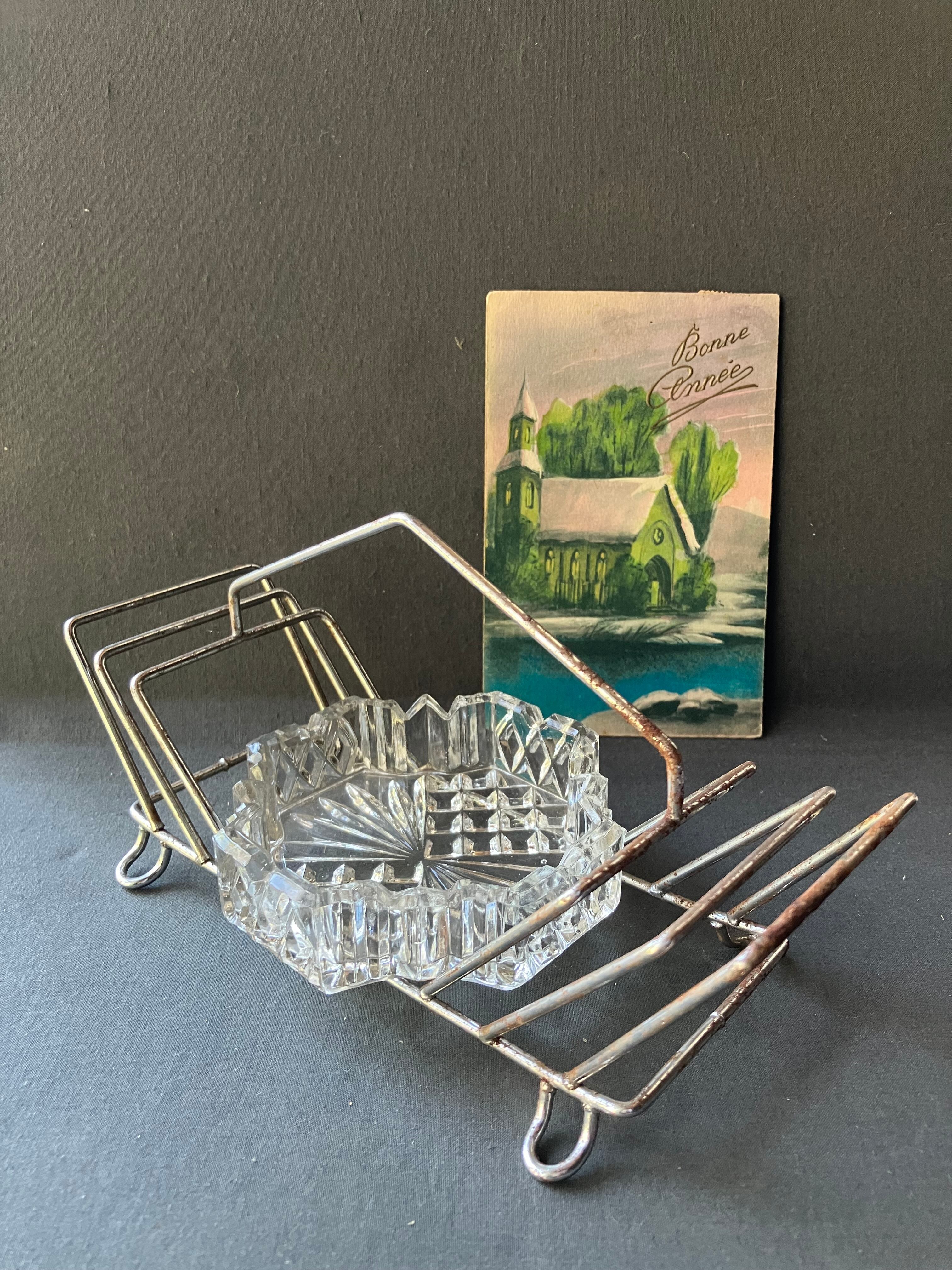 アイアンのトーストラックにカットガラスのジャムディッシュがセットされてぃます。ガラスにカケやヒビはございません。写真のようにポストカードをディスプレイして頂いて、中央にアクセサリーを飾って頂いても綺麗です。ポストカードもセットです。1920年から30年。フランスアンティーク。