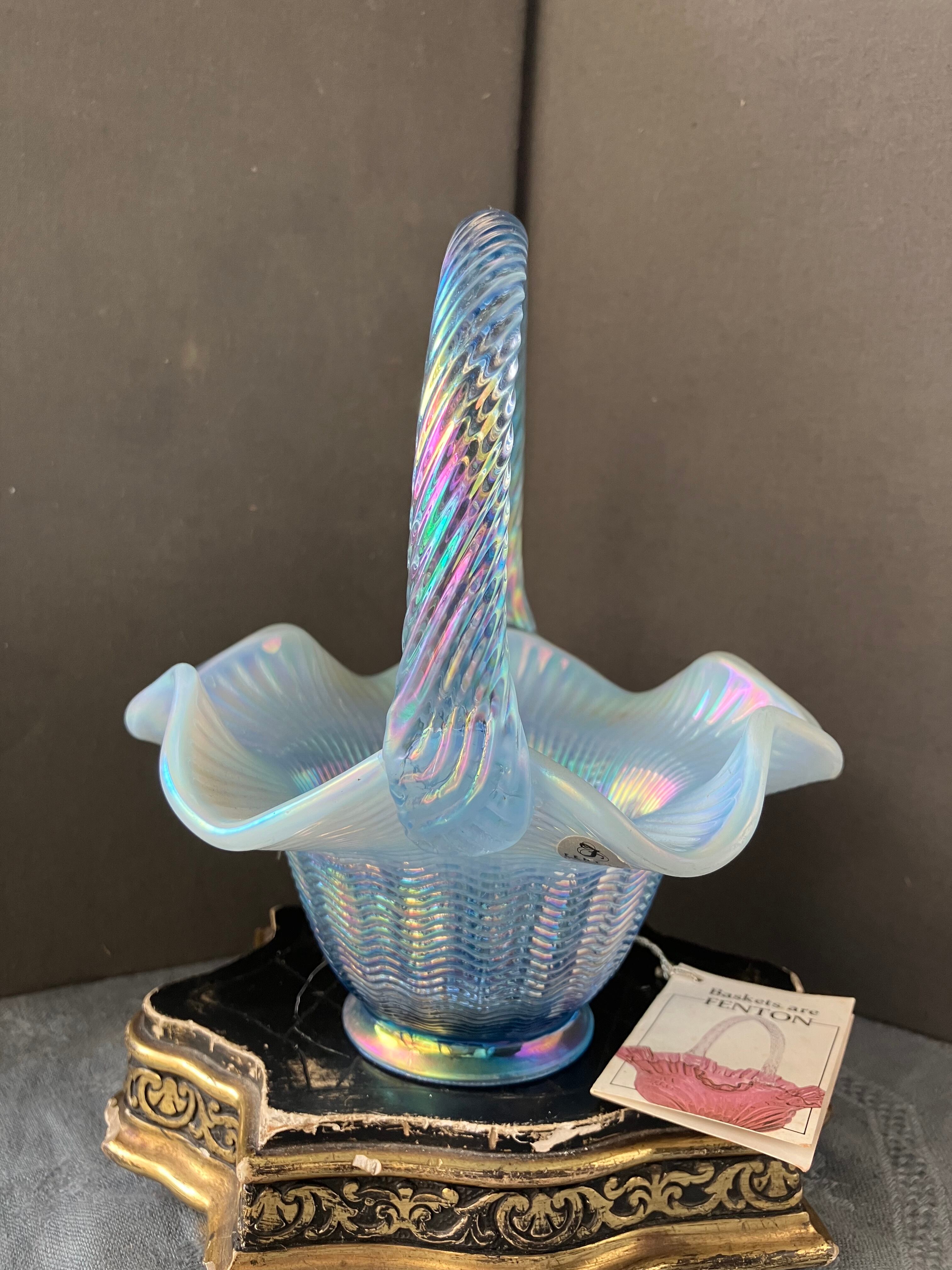 FENTON オパーリンガラスの綺麗なバスケットです。FENTONのタグシールとインビテーションも残っています。ヒビカケ無く良い状態です。1960年から70年。アメリカビンテージ。