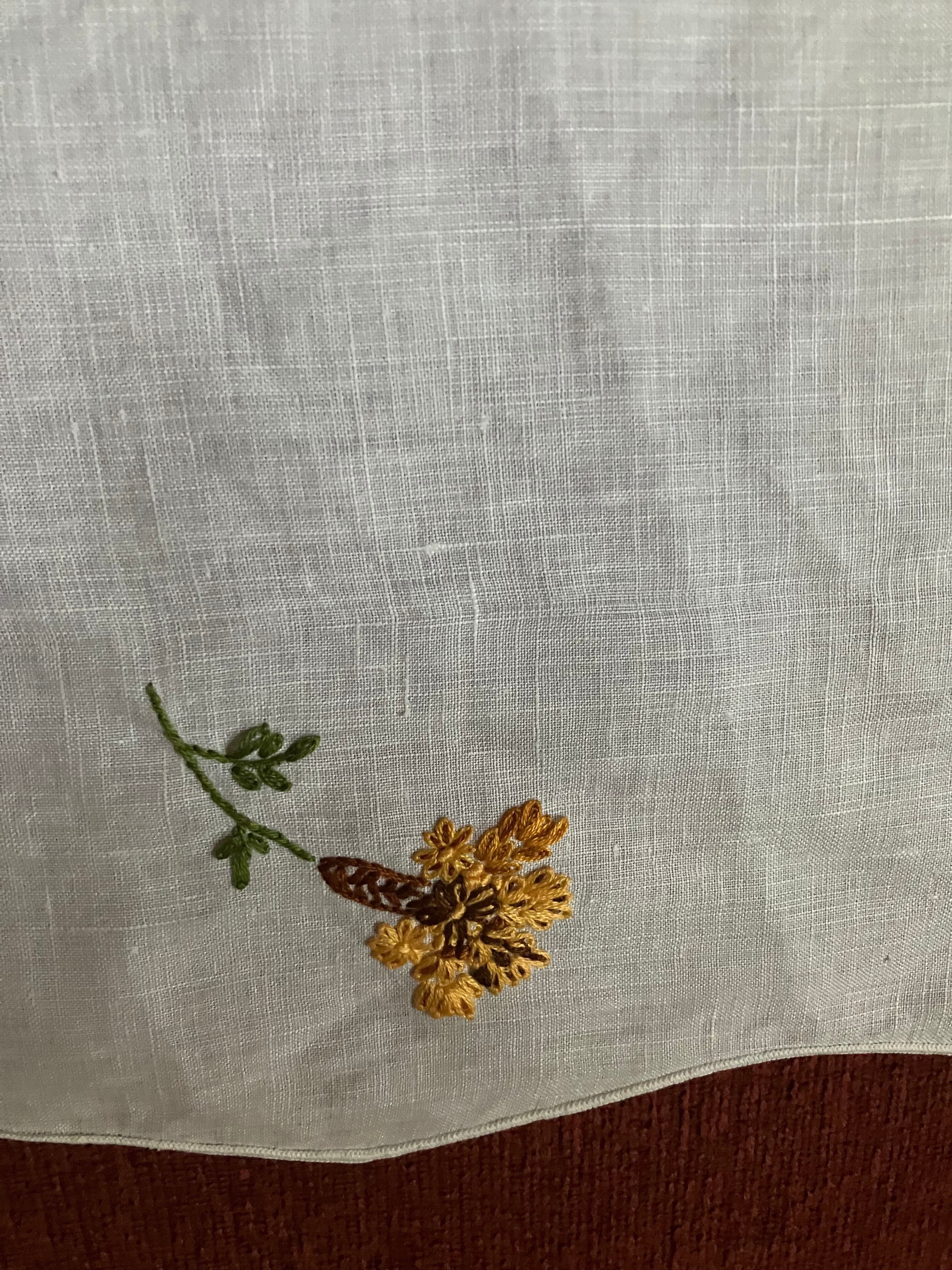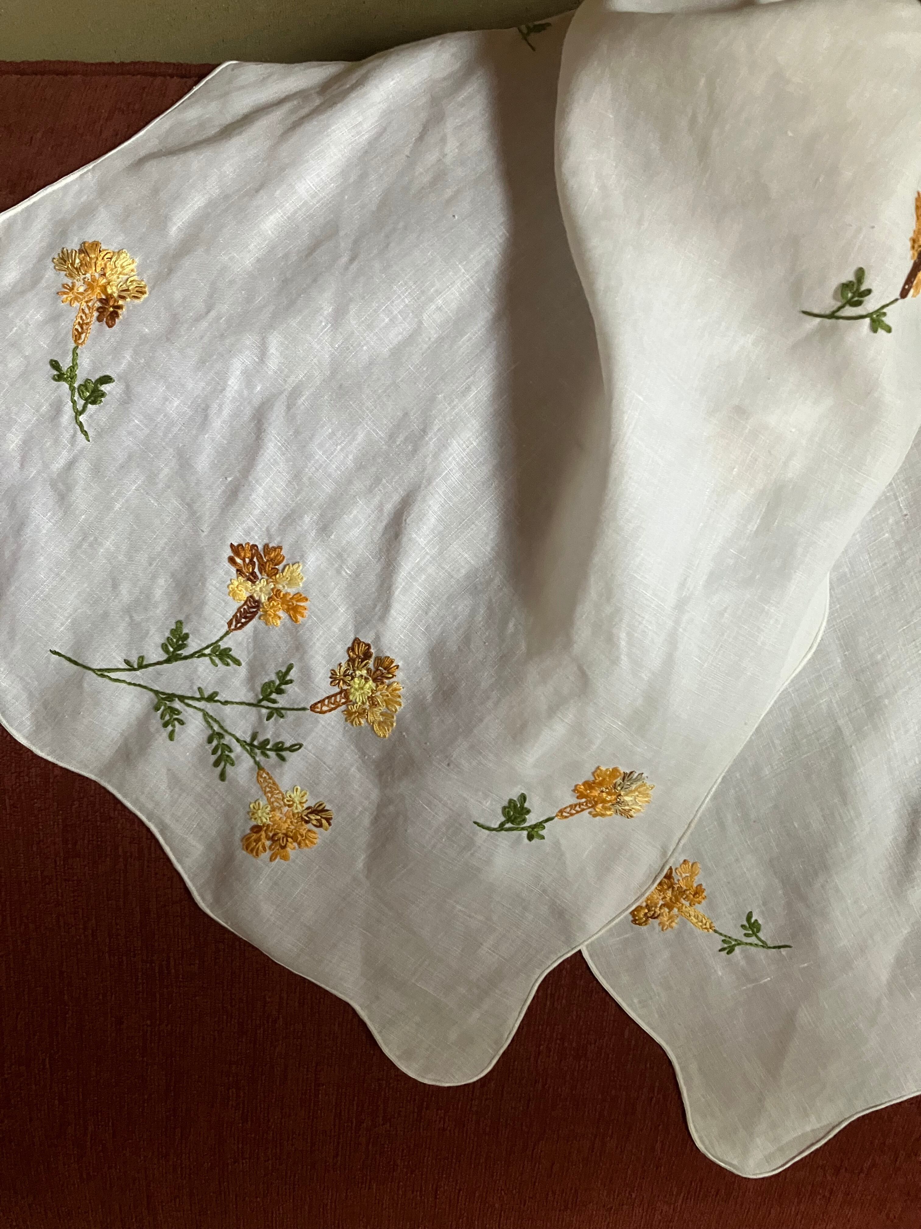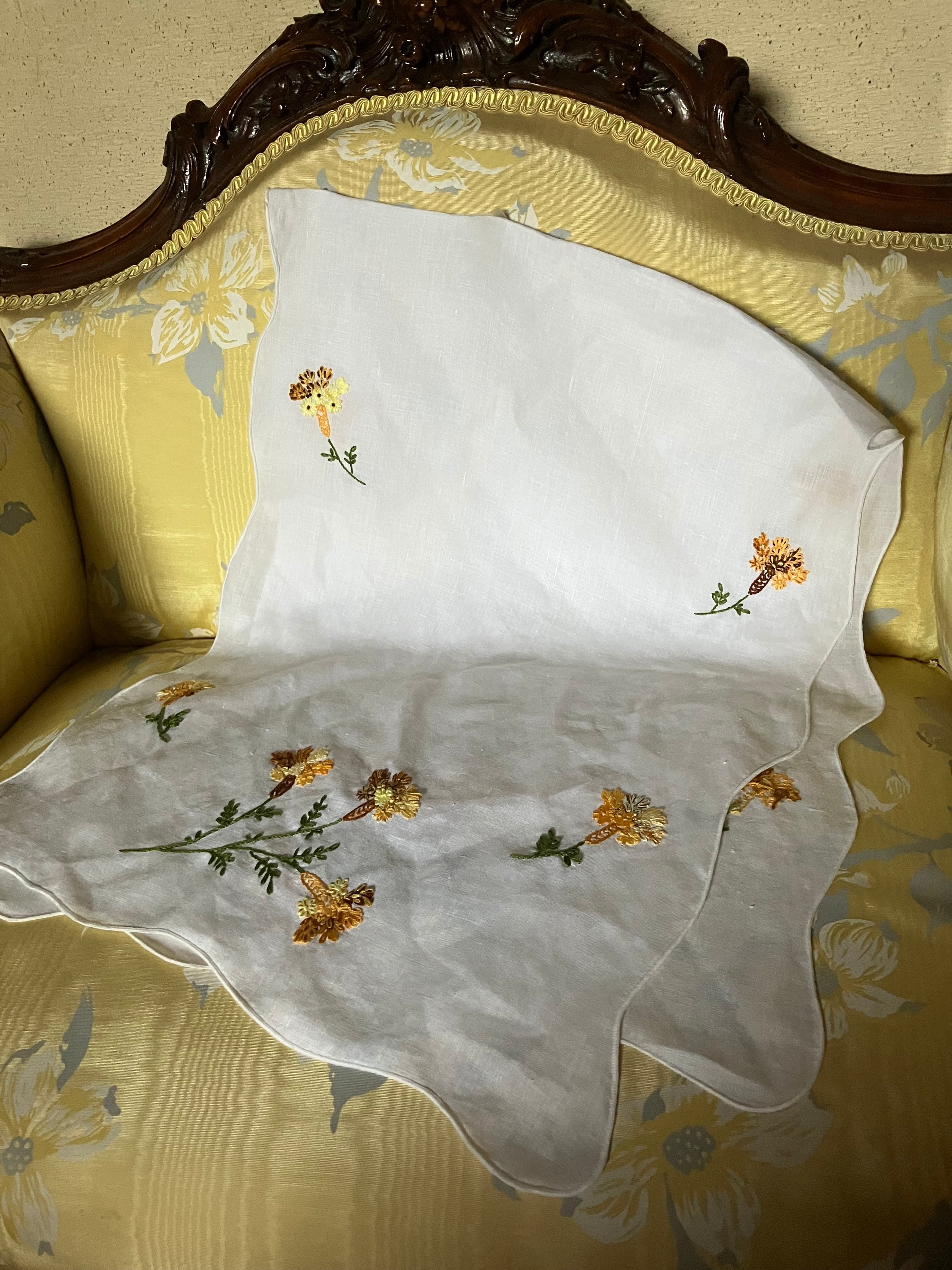 ・縦 38㎝ 横 102㎝ ホワイトリネンに丁寧に黄色の花が刺繍されたセンターです。花はひとつひとつ色々な黄色で刺繍されていて、エレガントな1枚です。1920年から30年。フランスアンティークしし
