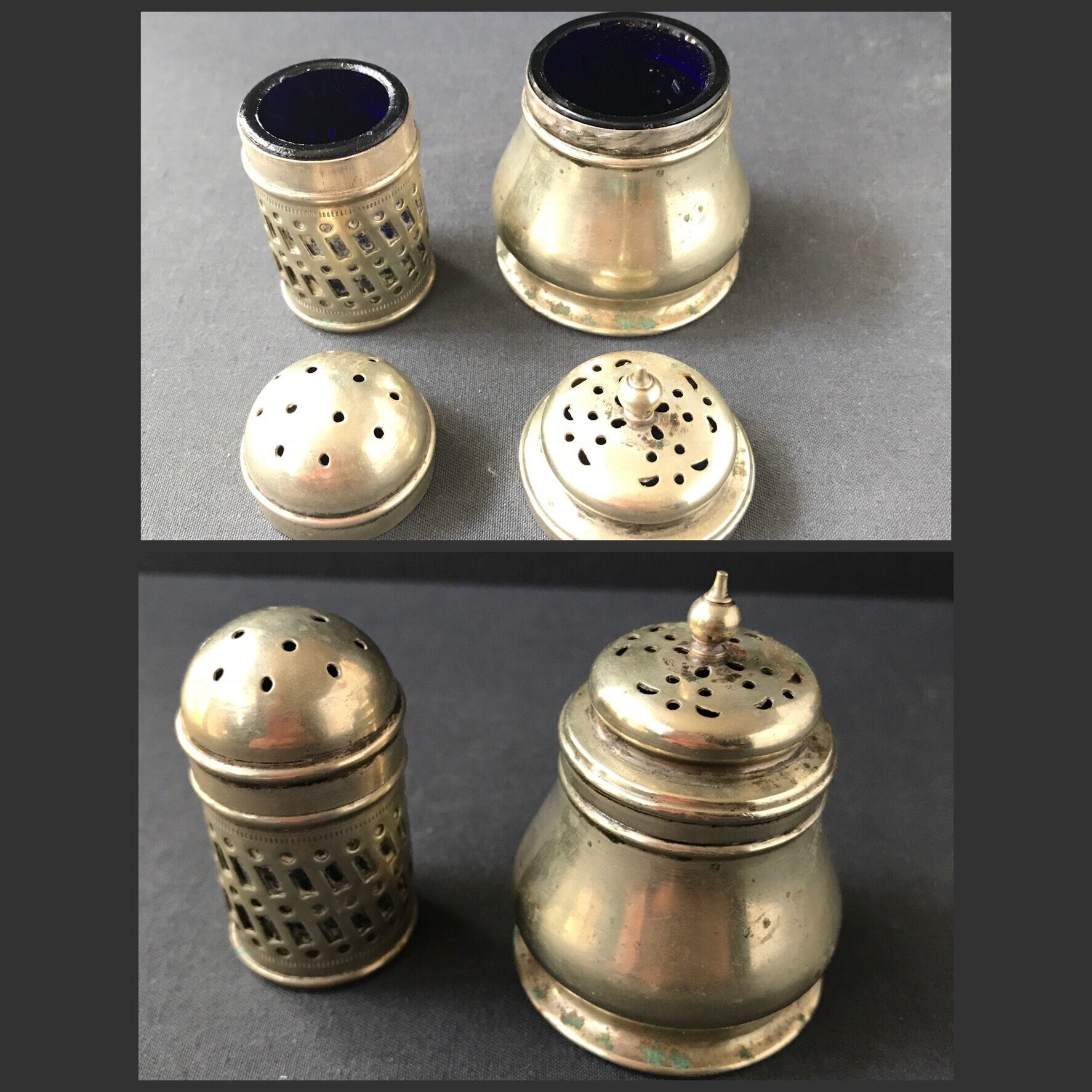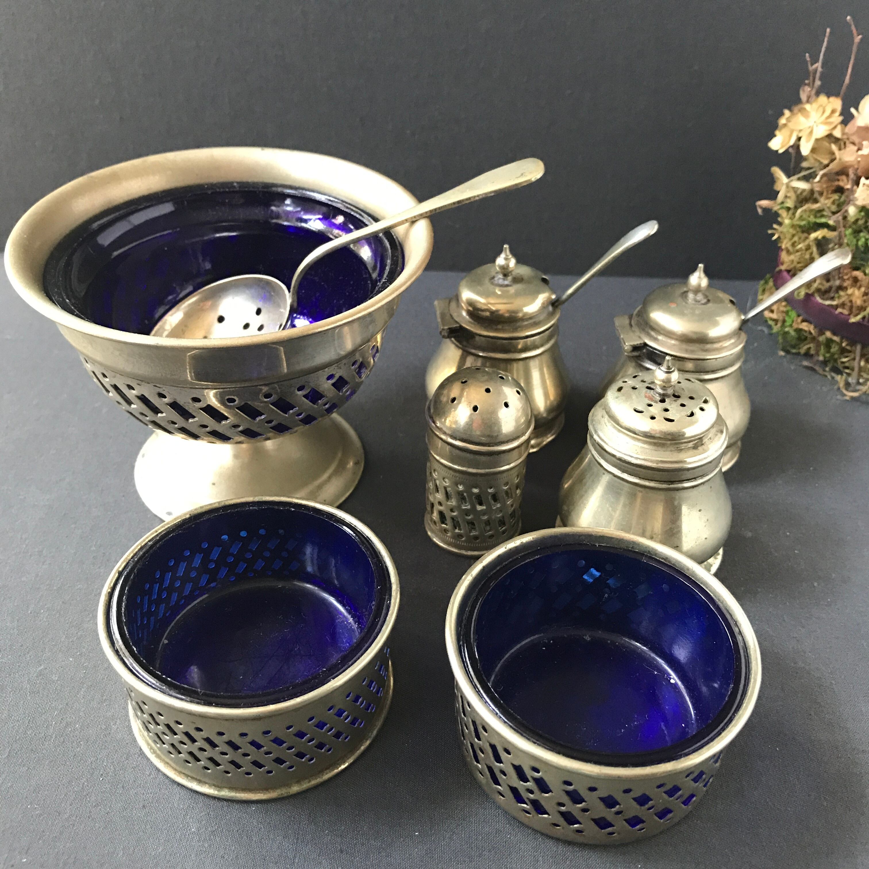 非常に盛りだくさんな10点セットです。すべての容器にコバルトブルーのガラスが入っていまして、とても綺麗です。バラバラで出てくる事はありますが、これだけのセットはなかなか出ません。フランスアンティーク。