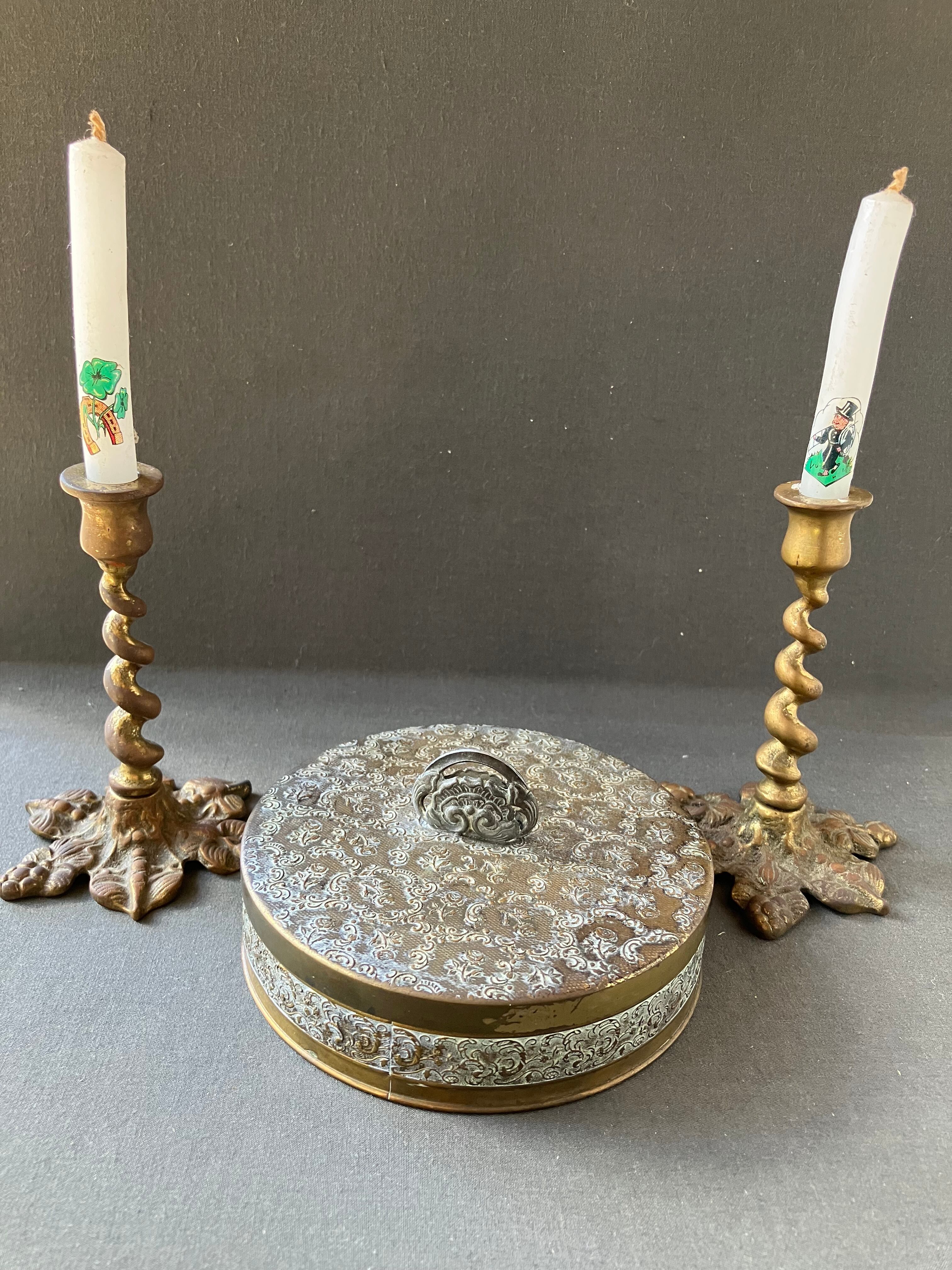 は2本セットです。ロカイユの持ち手とビクトリアンなエンボスが素晴らしいパウダーケースとディスプレイすると綺麗です。クローバーのキャンドルとシルクハットのキャンドルは少し歪みがあります。こちらもセットです。1920年から30年。フランスアンティーク。