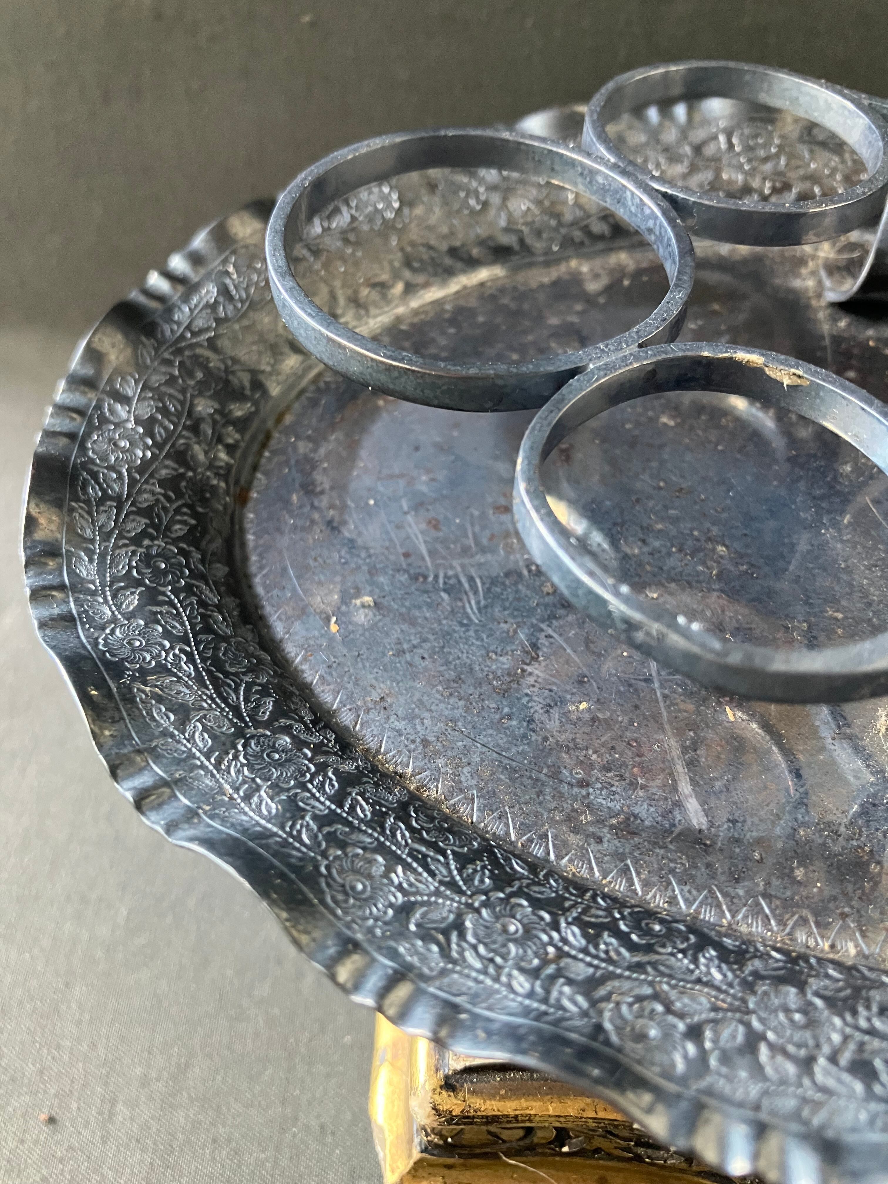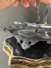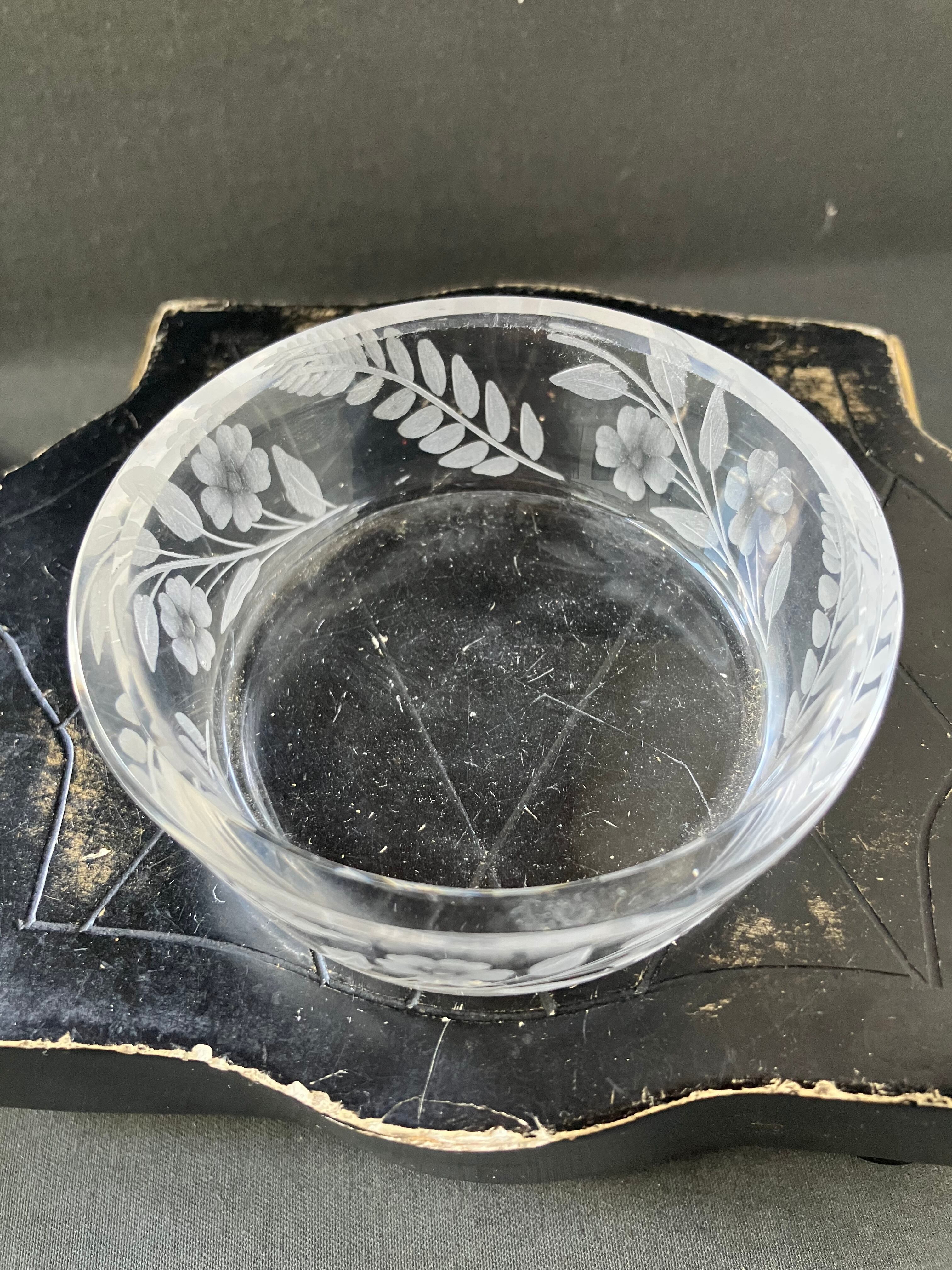 シルバーホールマーク入りのトレイに素晴らしいカービングのグラスのマスタードポットと塩胡椒入れ、モノグラムWの入ったシルバースプーンが