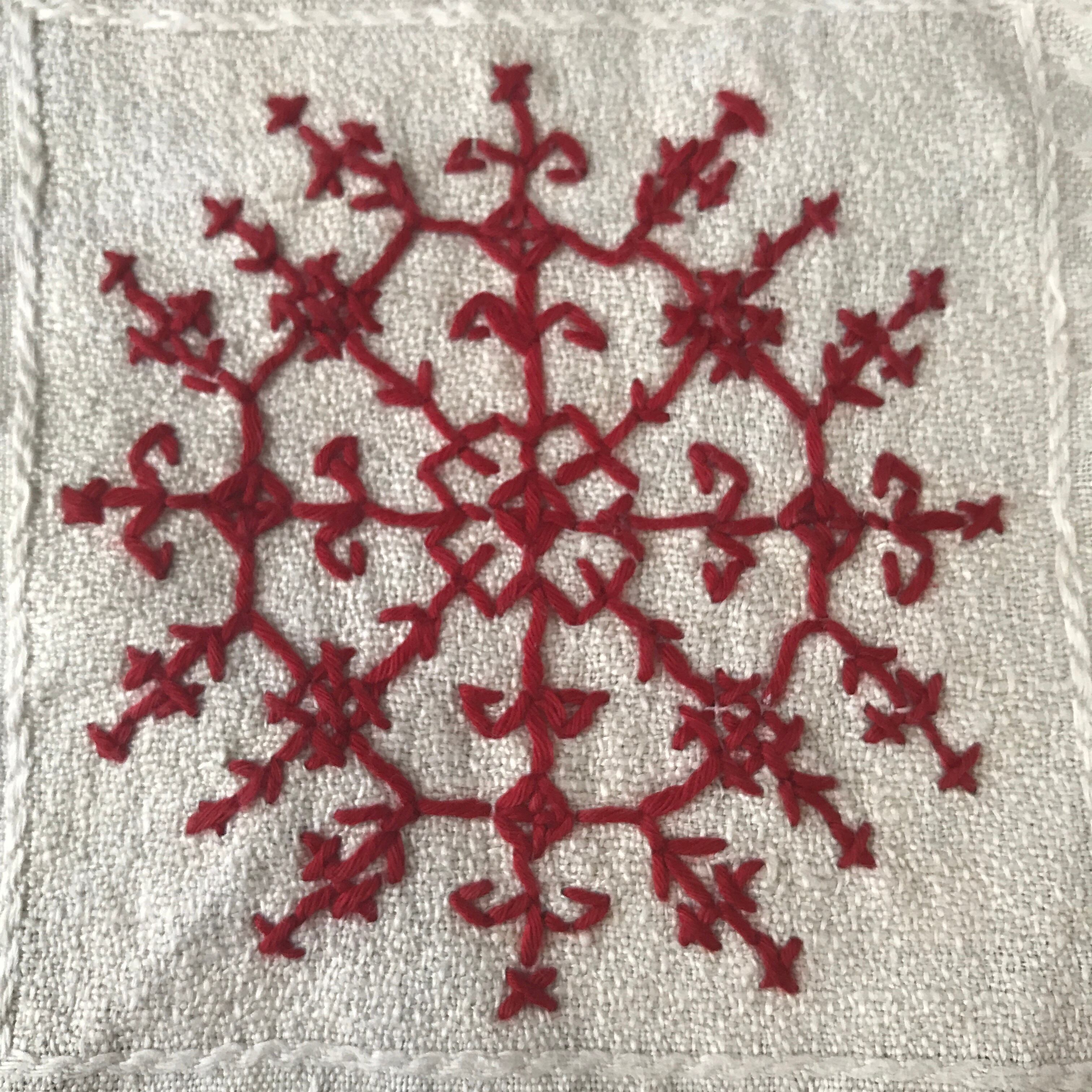 中央にバンドでメダリオンの様な刺繍が施され、周りをオフホワイトの糸で刺繍して、フリンジもつけた実は大変手の込んだスクエアマットです。フランスビンテージ。
