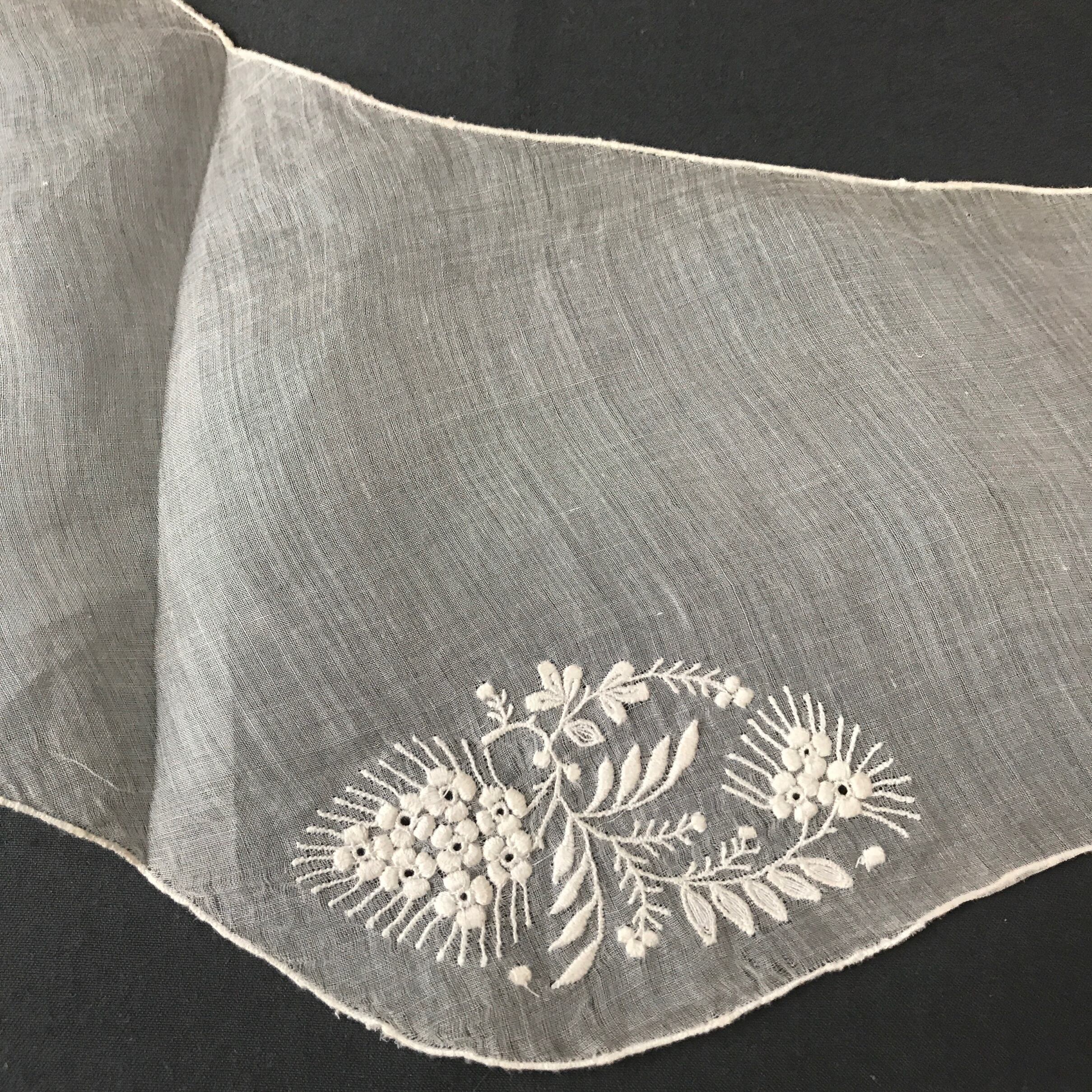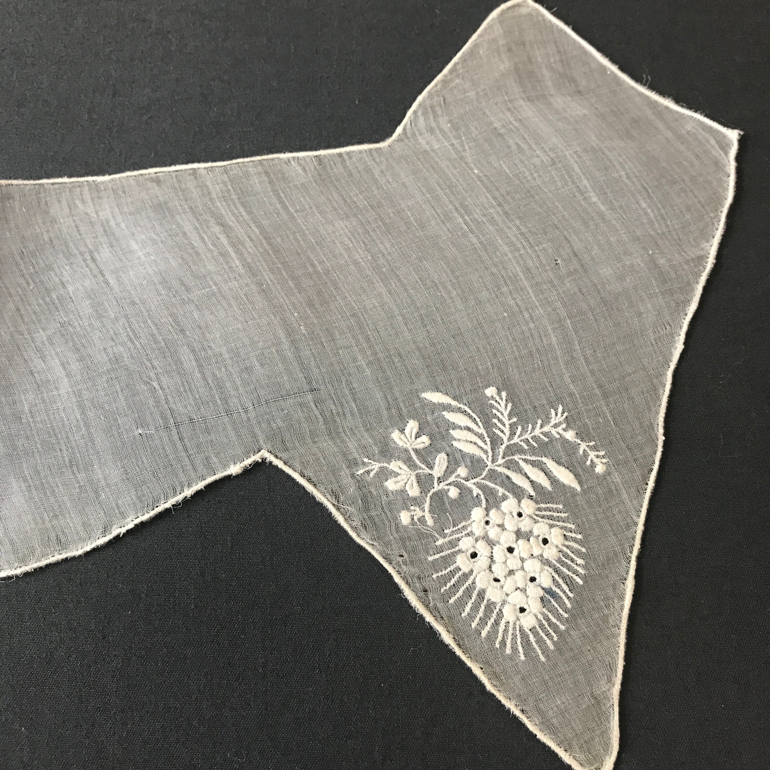 ・縦 約 17㎝ 横 52㎝ 大変薄手のリネンのチュールにバンドで、細やかな刺繍が2箇所入っています。チュールの形が変わっていますが、刺繍のクオリティがとても良いので、それぞれバンドメイドの材料に使って頂いたり、コラージュして額装して頂いても綺麗です。フランスビンテージ。