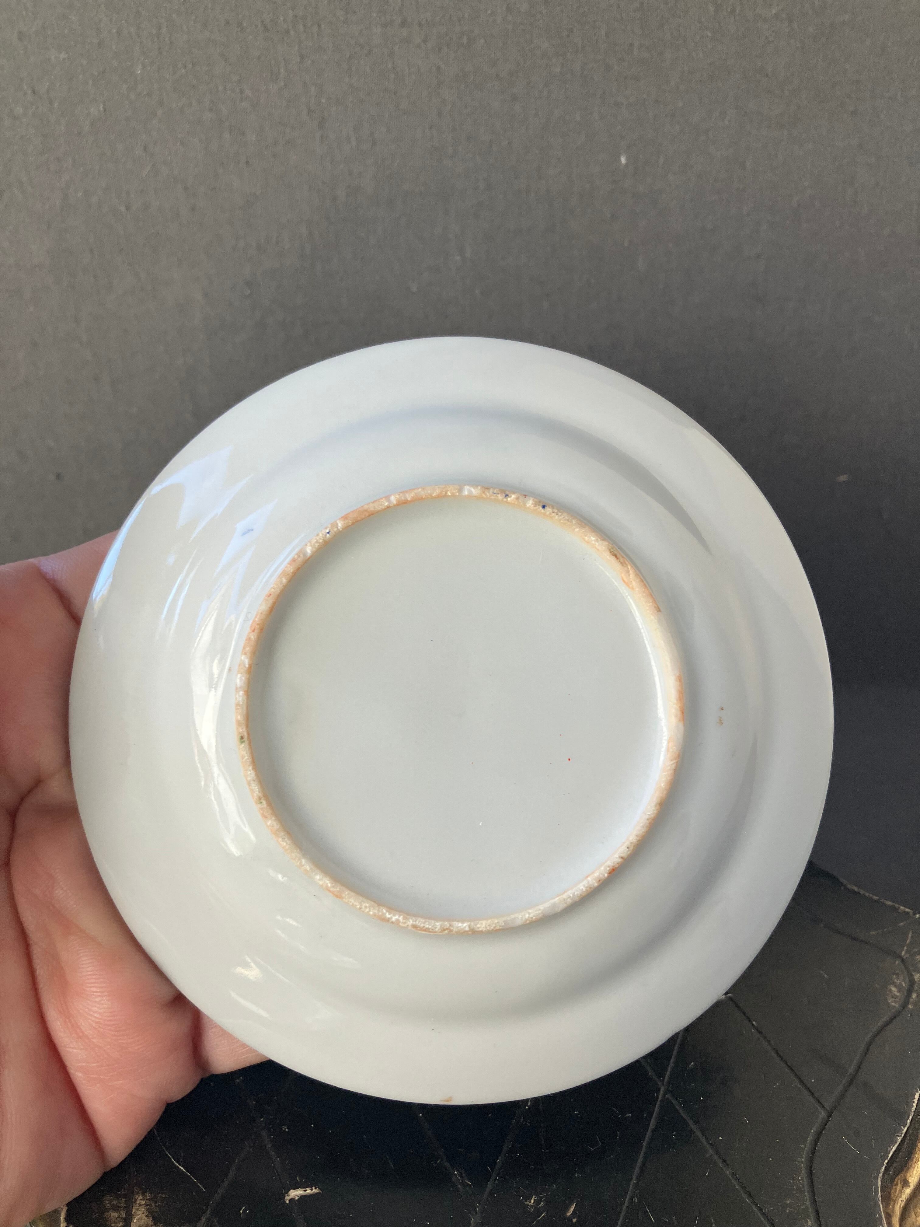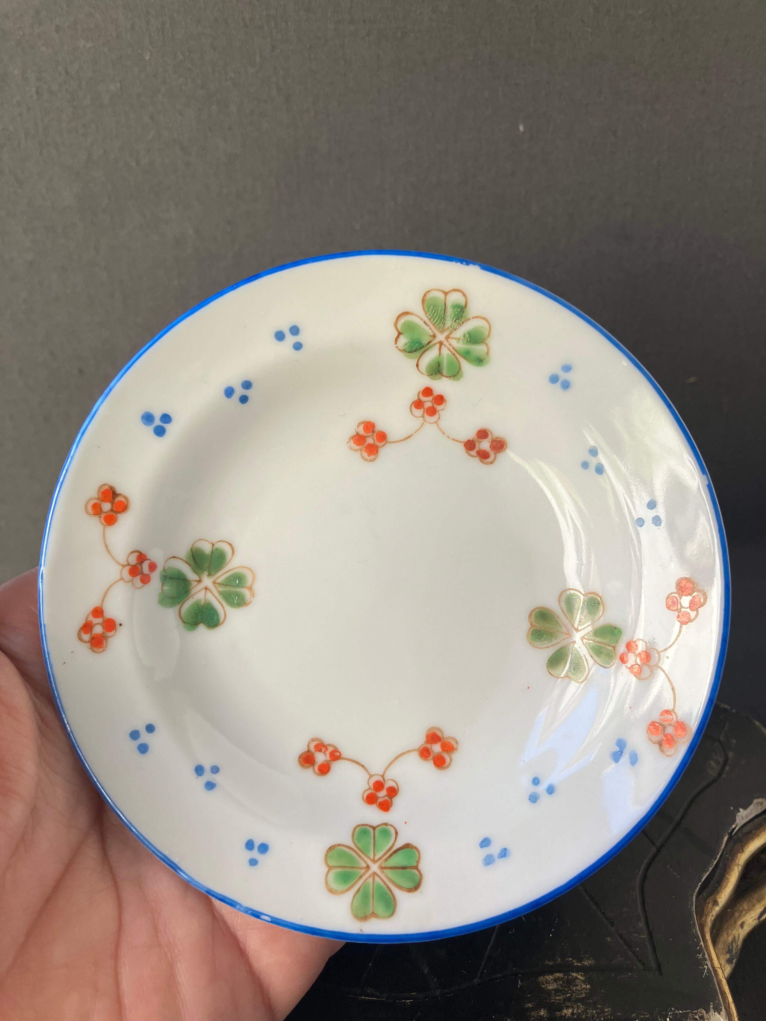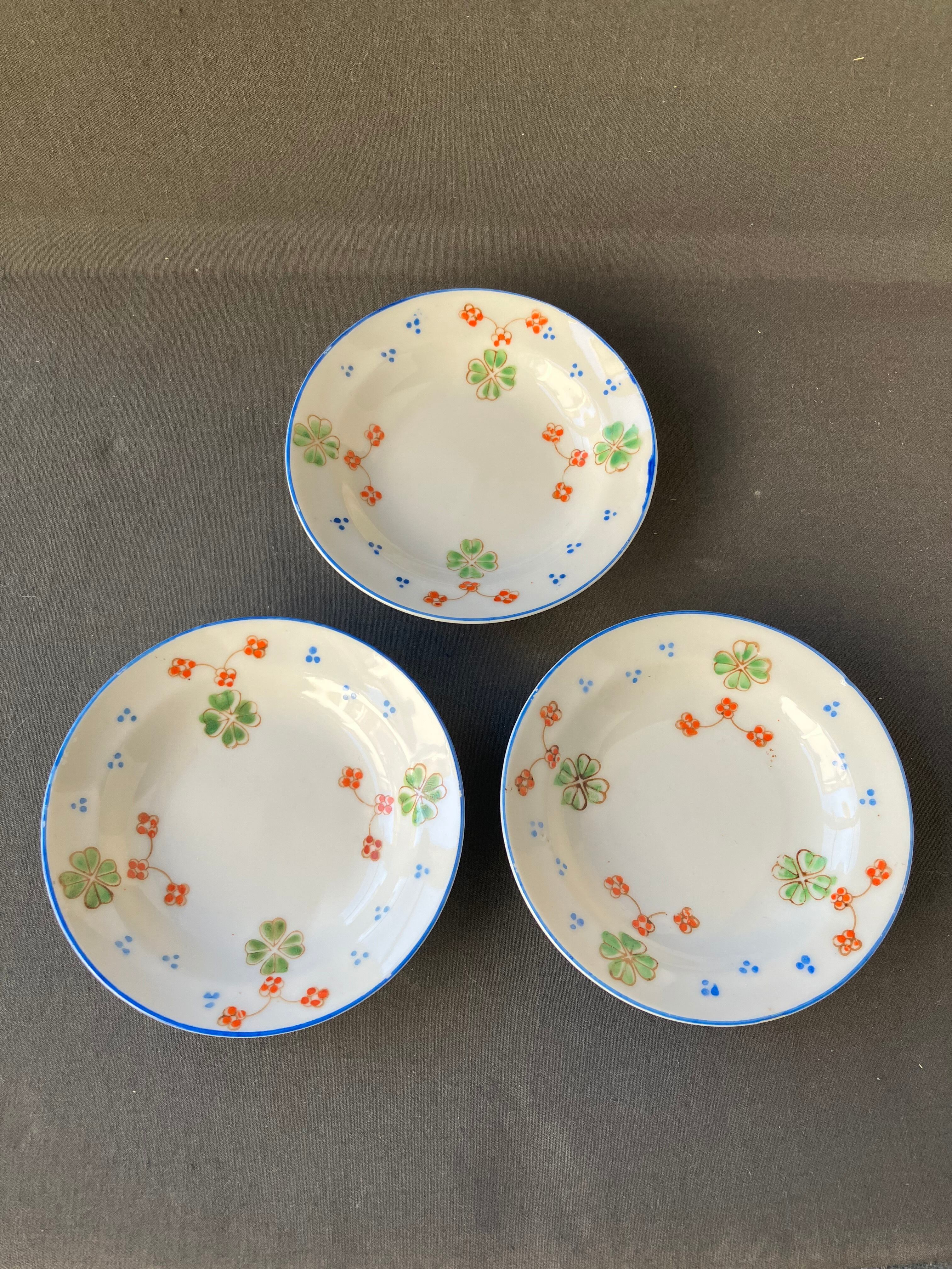 ・直径 10㎝ 四つ葉のクローバーと赤い花、ブルーの縁周りが可愛いらしいディネットです。3枚セットのお値段です。ヒビカケ無く良い状態です。1920年から30年。フランスアンティーク。