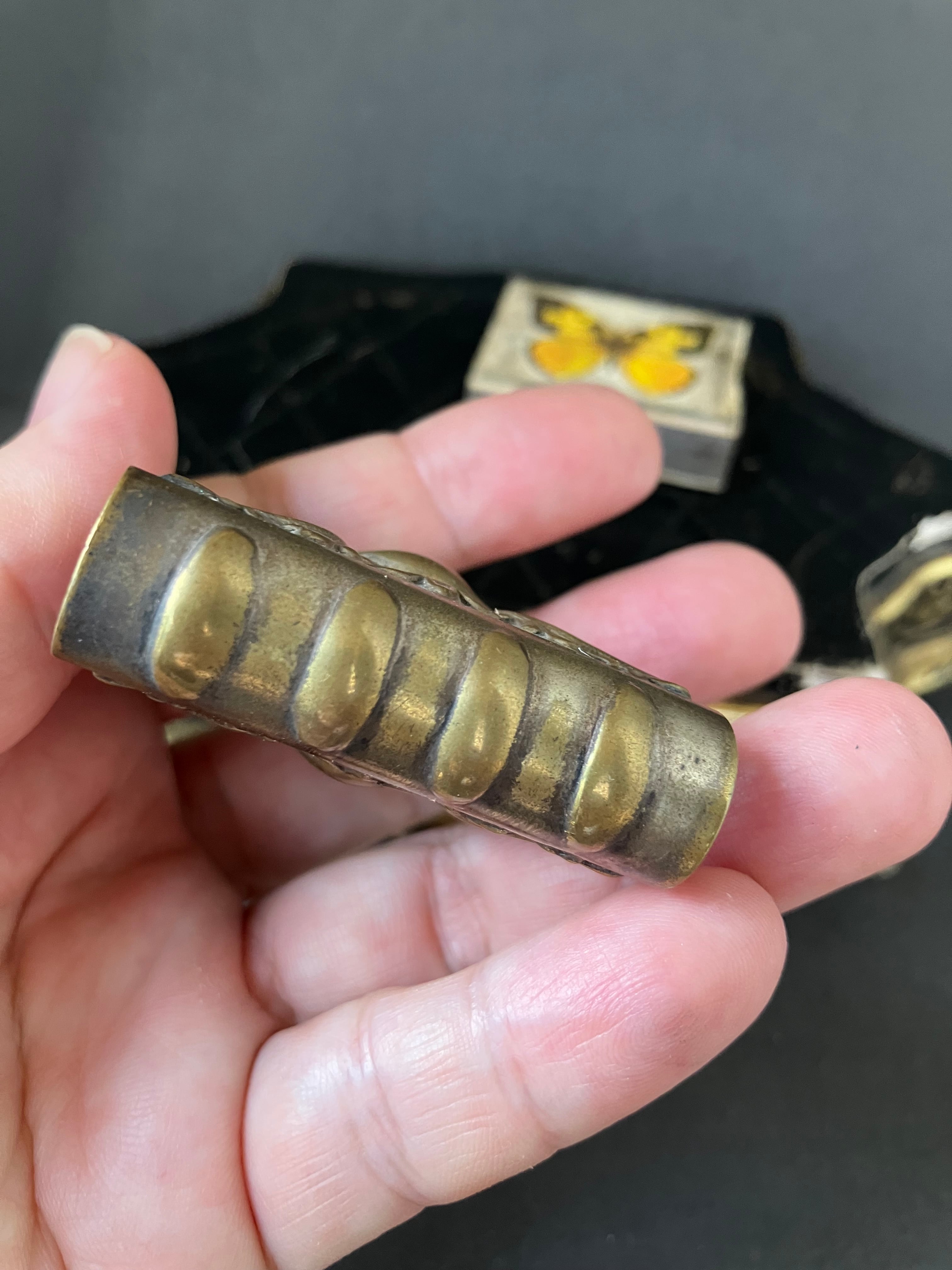 真鍮製のロカイユのエンボスが綺麗なマッチケースです。蝶々のマッチもセットです。ポケットに入れた時マッチが潰れないようにとマッチが擦りやすくなるようにケースにいれました。1920年から30年。フランスアンティーク。