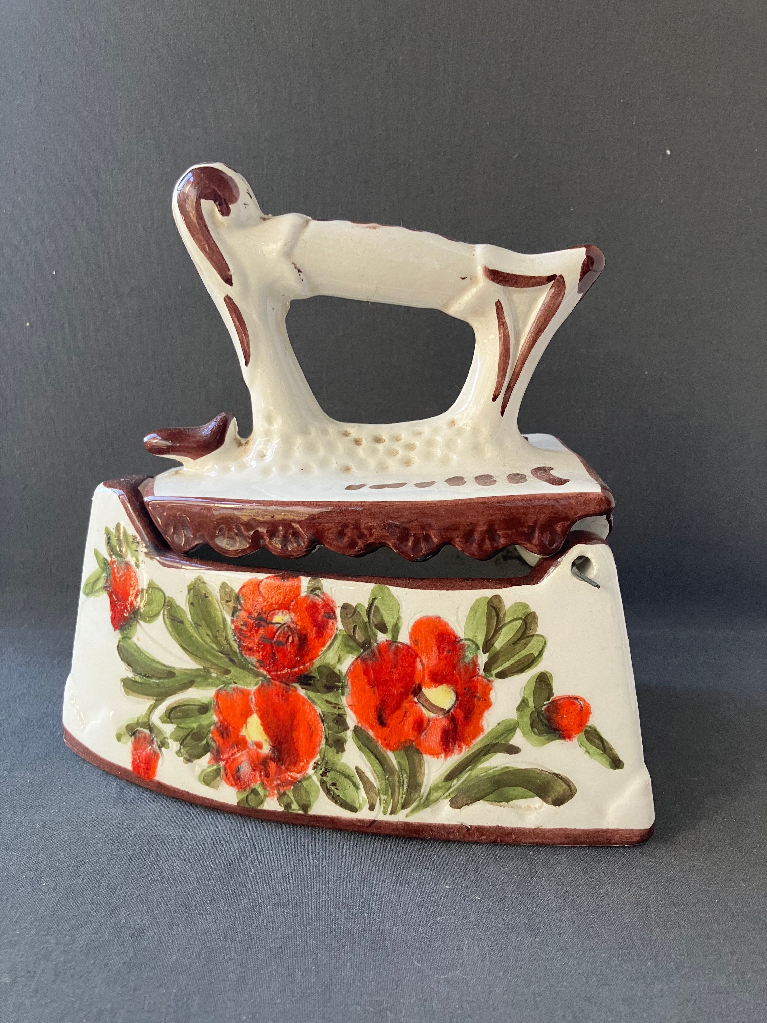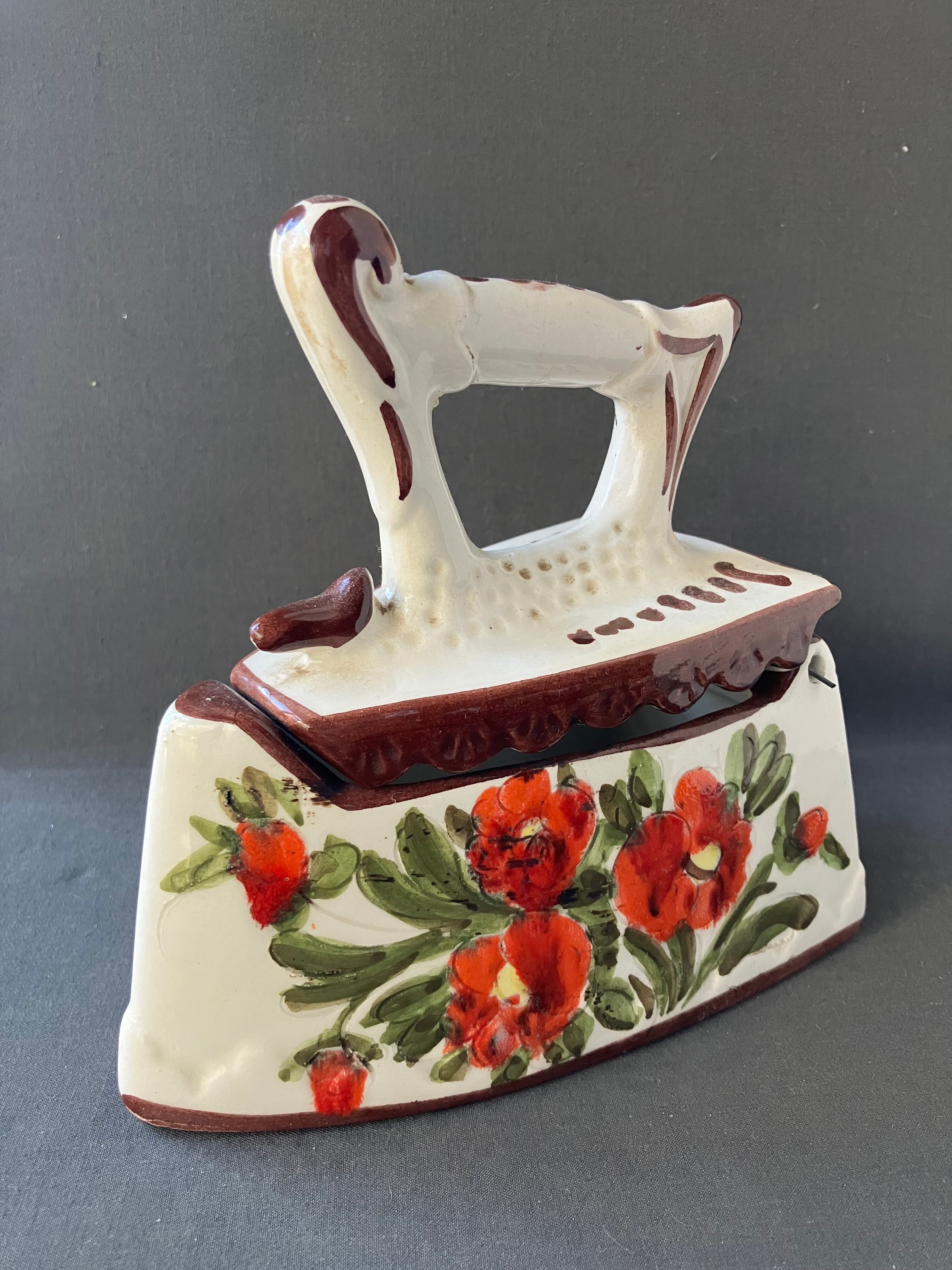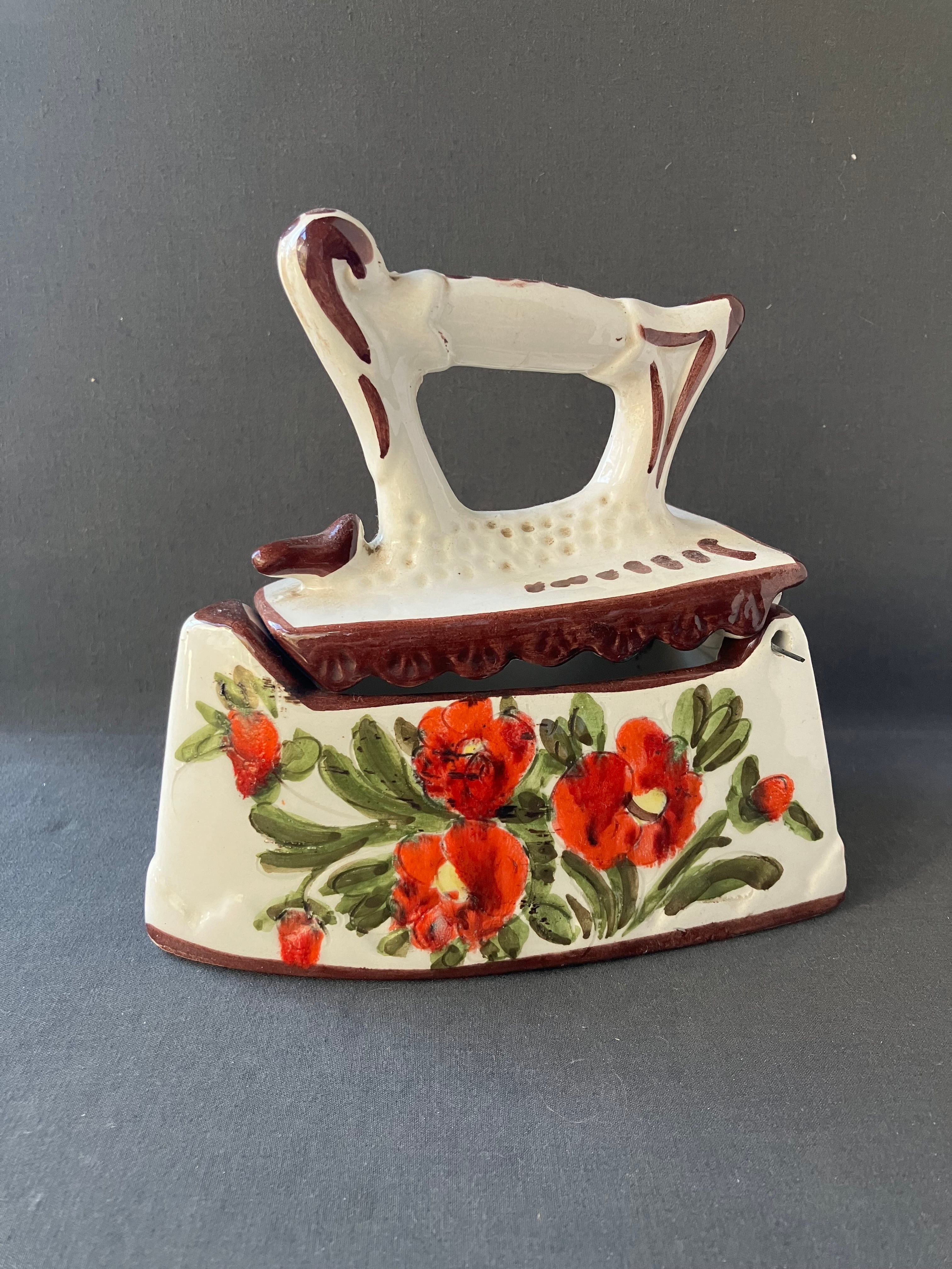 陶器のアイロン型のBOXです。蓋が開くようになっています。ドライフラワーを飾って頂いたり、ジュエリーBOXのようにお使い頂いても綺麗です。ヒビカケ無く経年の割に良い状態です。