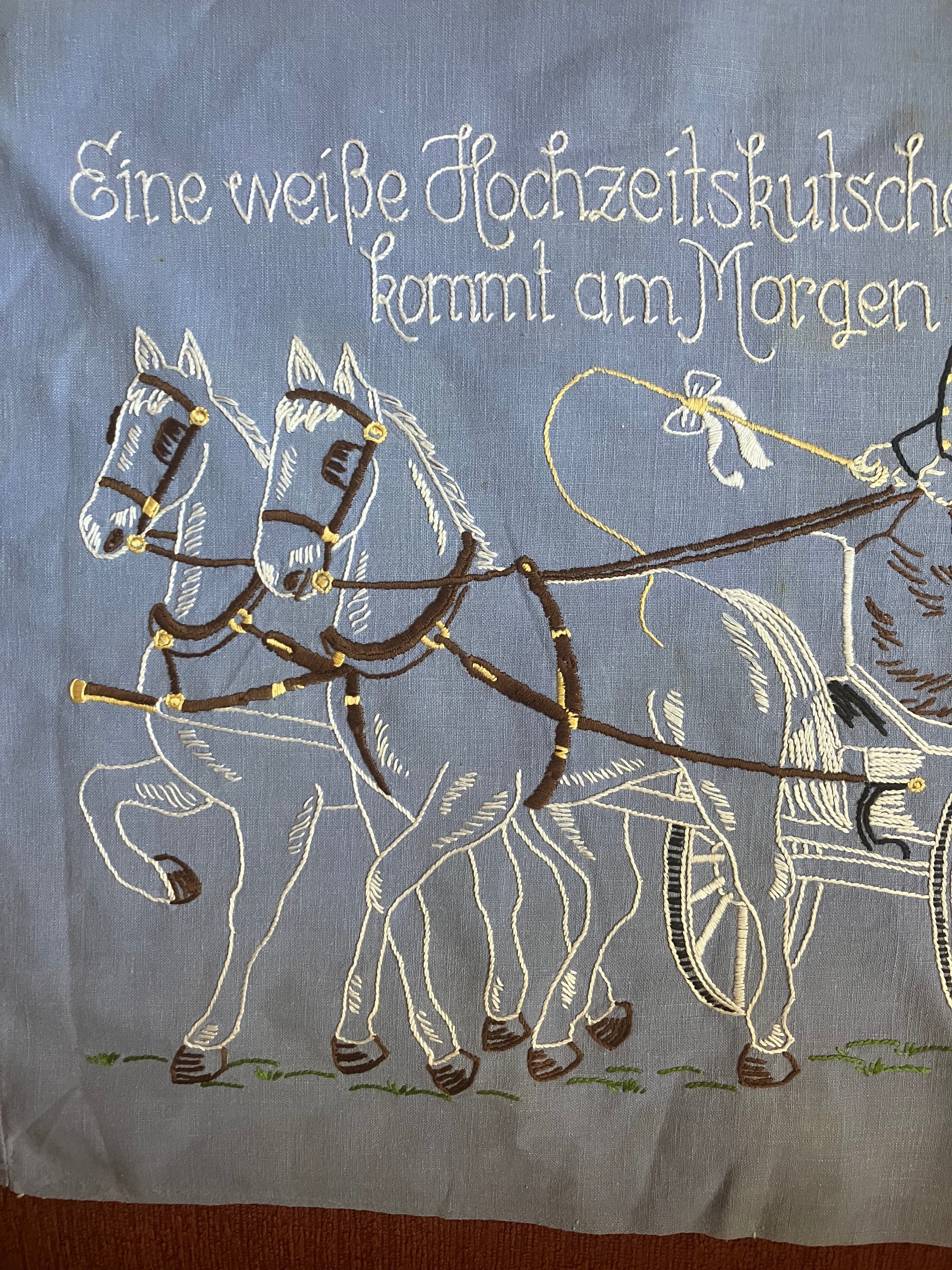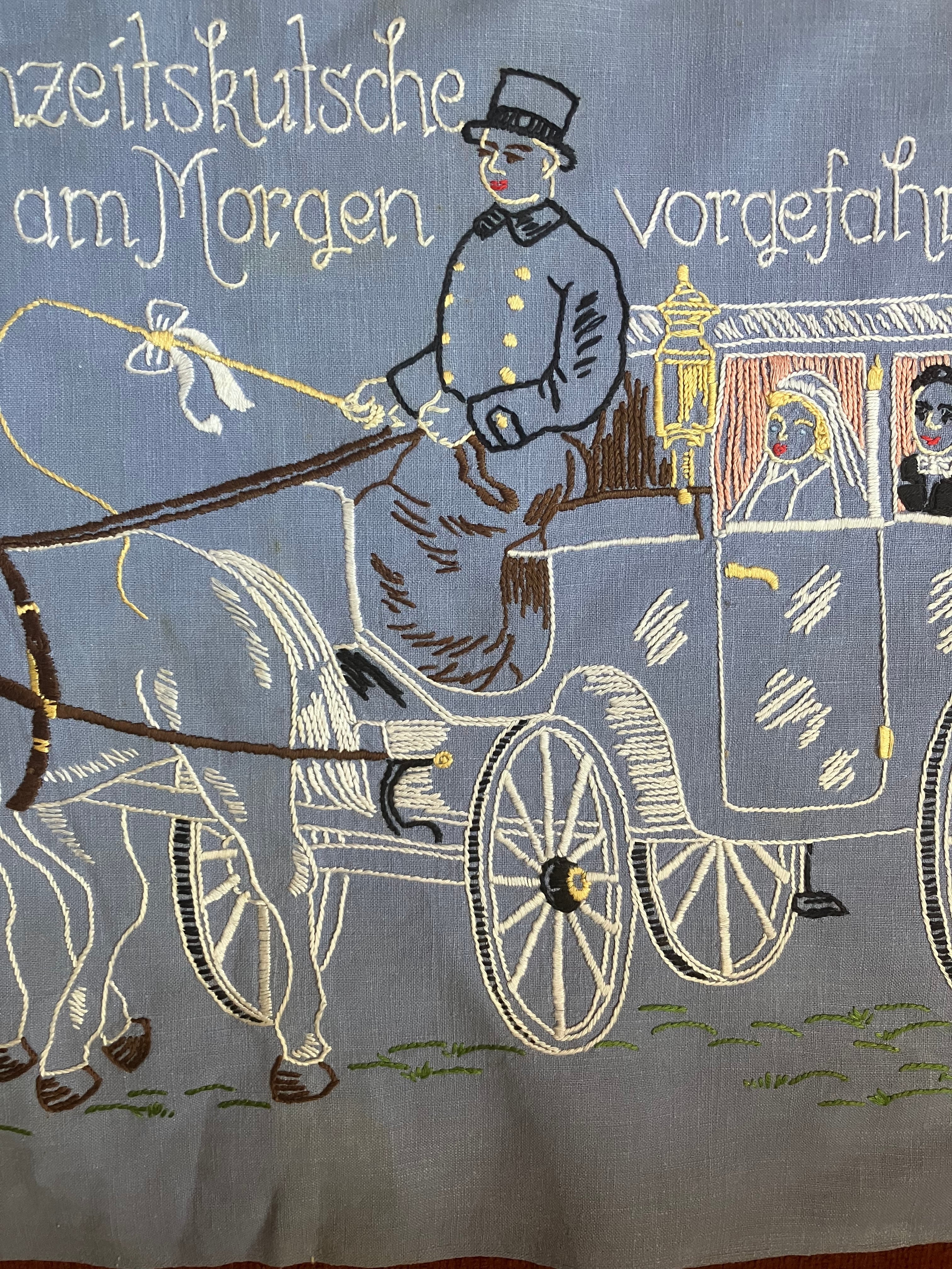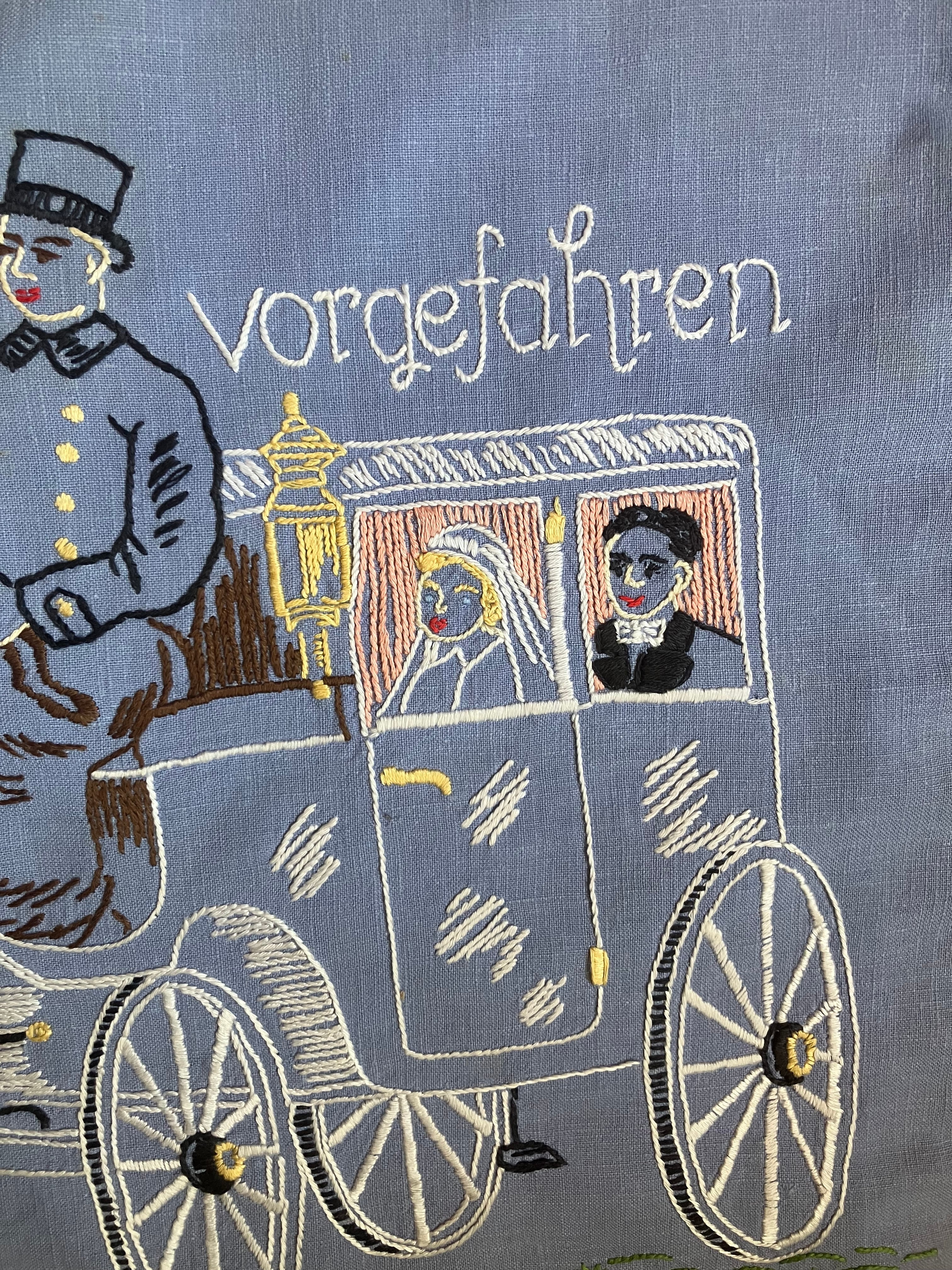 淡いブルーの生地に馬車と貴族が刺繍された貴族の婚礼の様子のクッションカバーとバラのクロス刺繍のドイリー のセットです。イギリスアンティーク。
