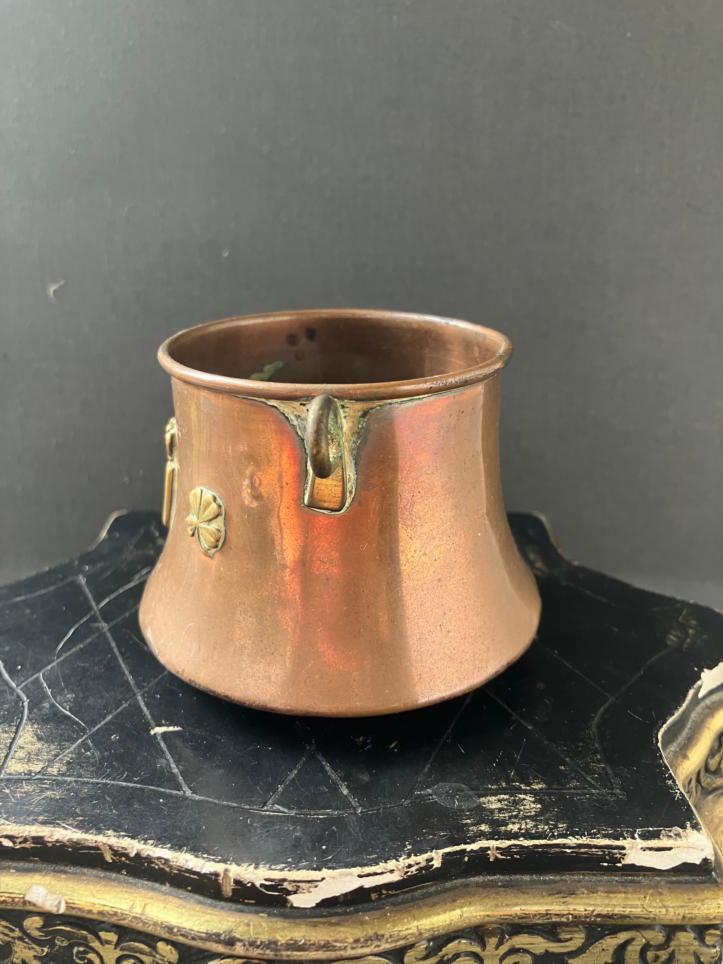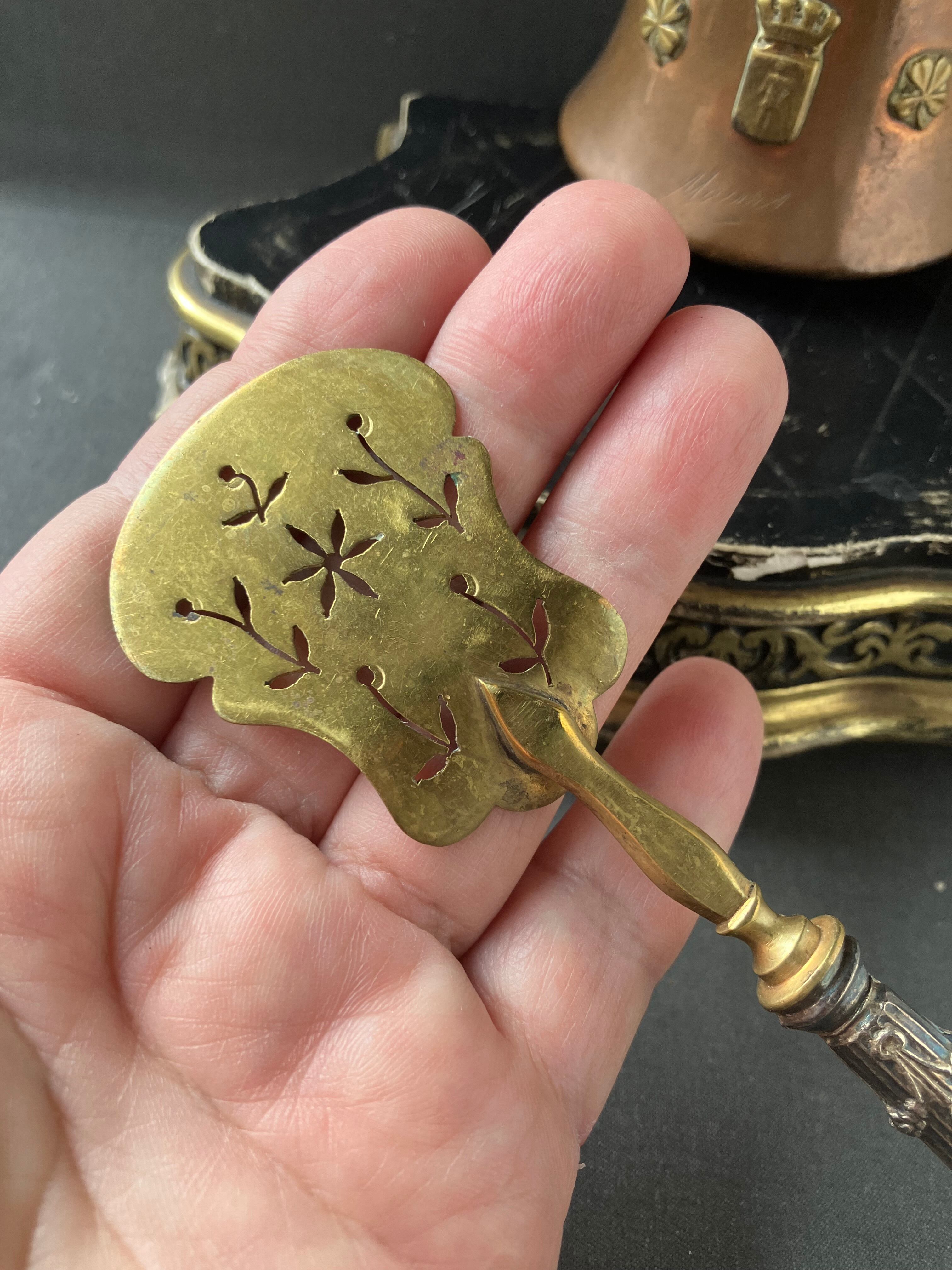 シルバーのガーランドの装飾が綺麗なティースプーンと真鍮製のエンブレムと4葉のクローバーがポイントのカップのセットです。1920年から30年。