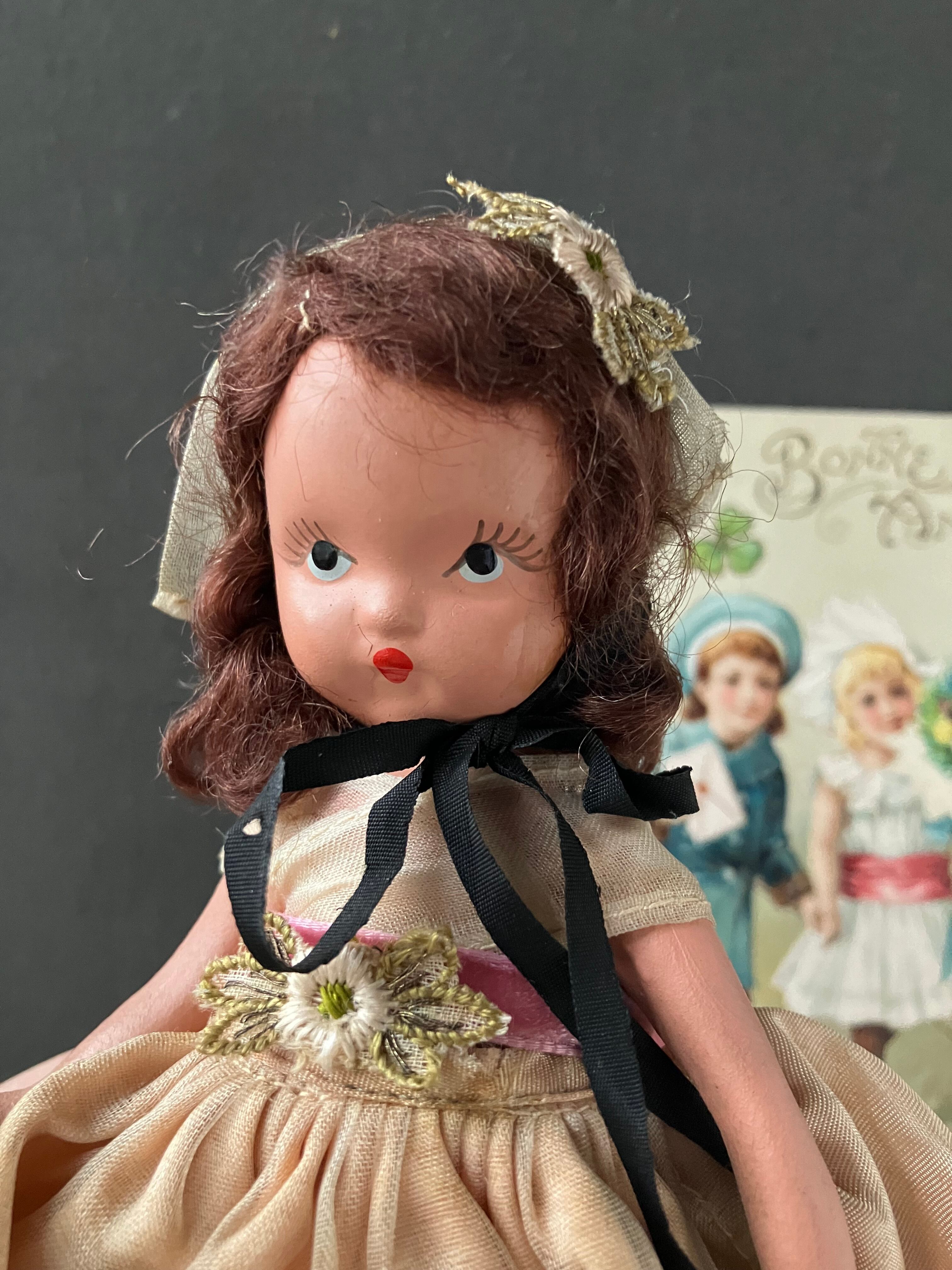 ・身長 13㎝ オールビスクのミニョネットちゃんです。ピンクとチュールのドレス、ボネが可愛いらしいです。スェードリボンとお花は貼り付けてありません。世界観が同じポストカードもセットです。スタンドもおつけします。1920年から40年。フランスアンティーク。