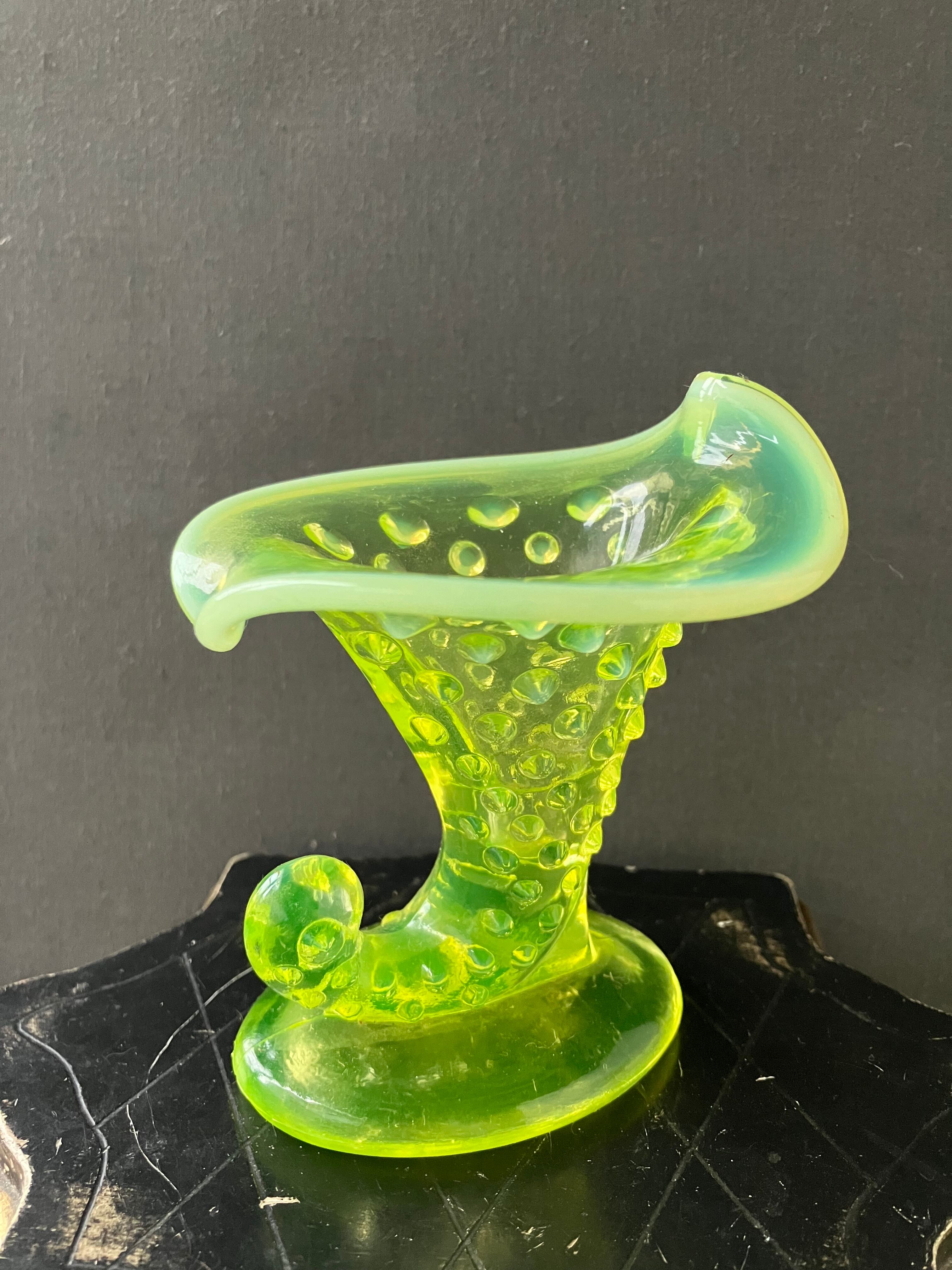 オパリンガラスとウランガラス、ボブネイルのキャンドルスタンドセットです。キャンドルスタンドとしましたが、ベイスンとしてもお使い頂けます。2個セットですので、シンメトリーにディスプレイして頂くとキャンドルを飾らなくても綺麗です。ヒビカケなく良い状態です。1920年から30年。フランスアンティーク。