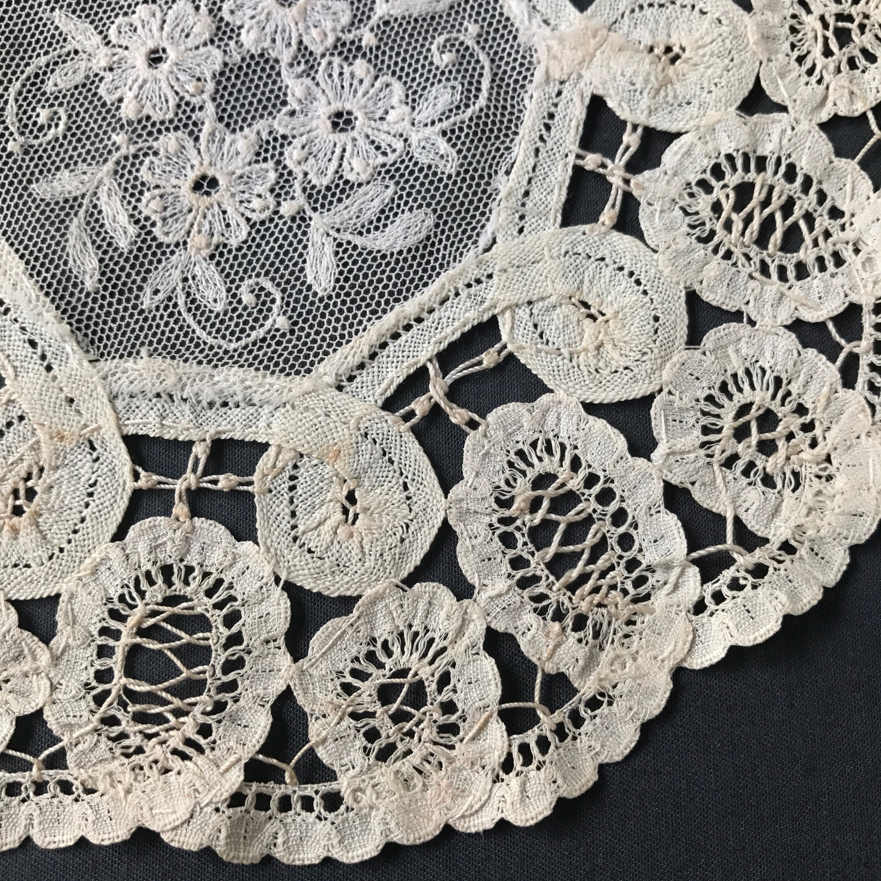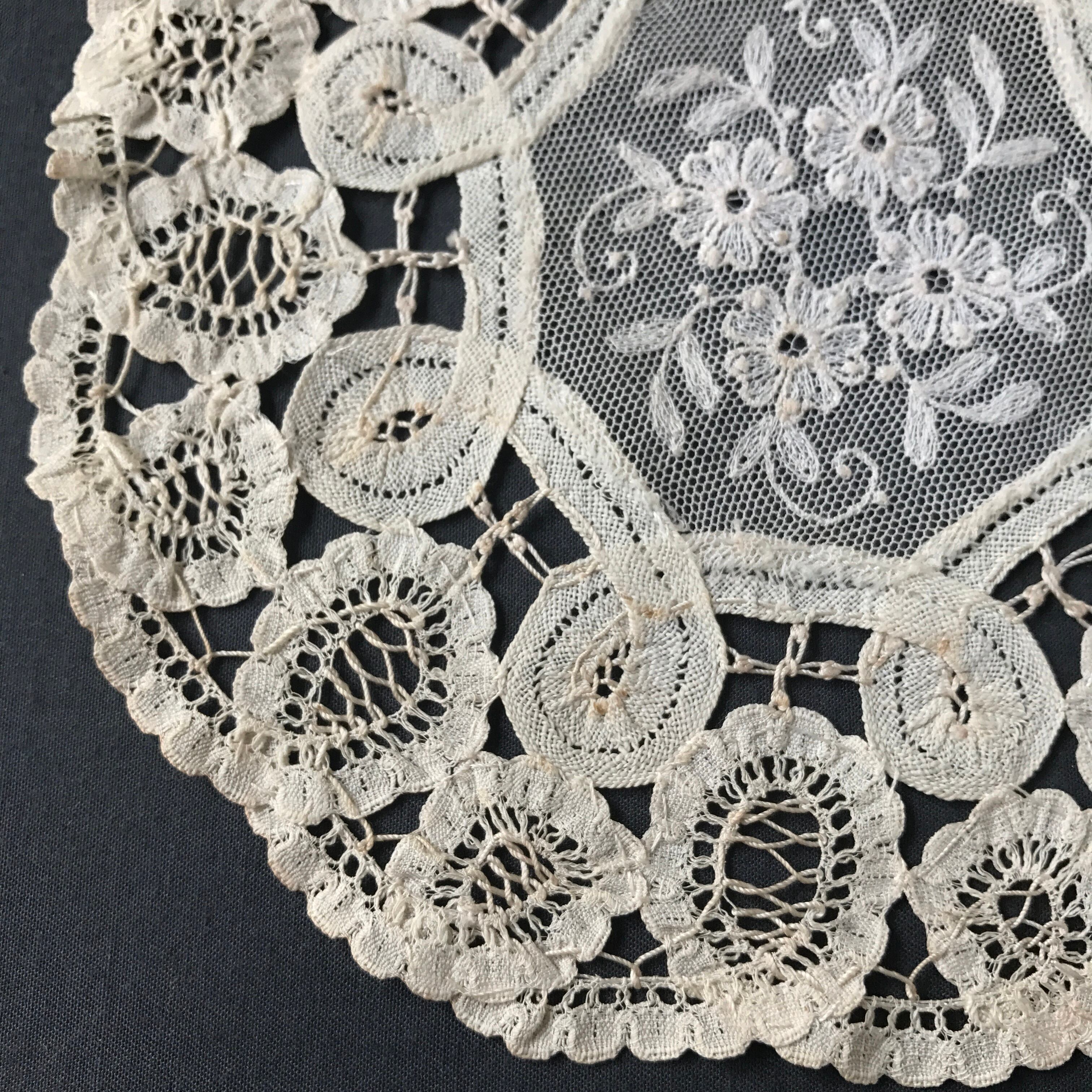 ・直径 18㎝ 中央はチュールにバンドの花の刺繍が入り、周りをバテンレースで繋ぎあわせた可愛らしいレースドイリーです。フランスアンティーク。
