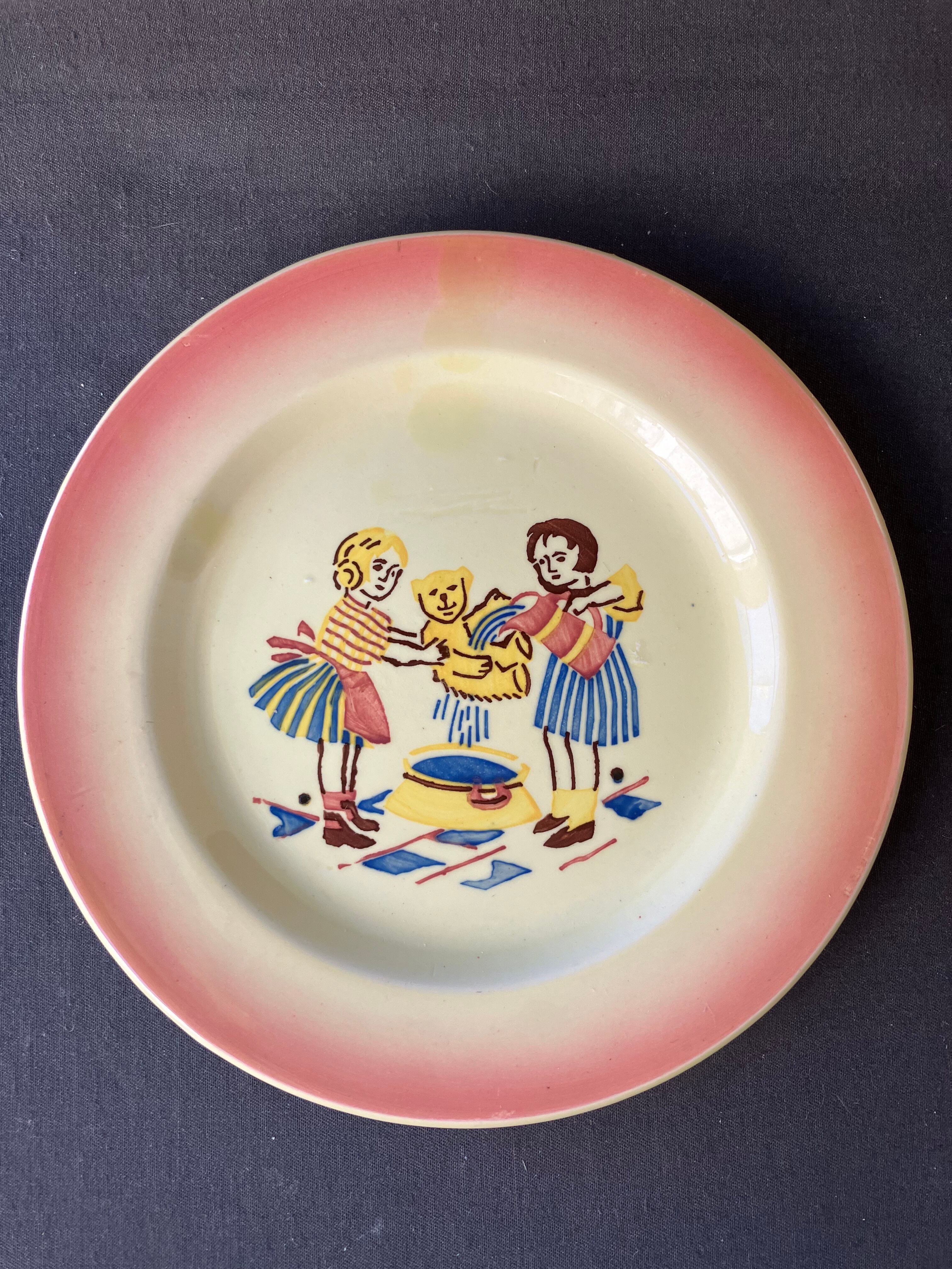 ・直径 16㎝ 2枚 テディベアを洗う少女のディネットです。ディネットと言いましてもデザート皿としてお使い頂けます。ヒビカケ無く経年の割に良い状態です。1930年から40年。フランスビンテージ。
