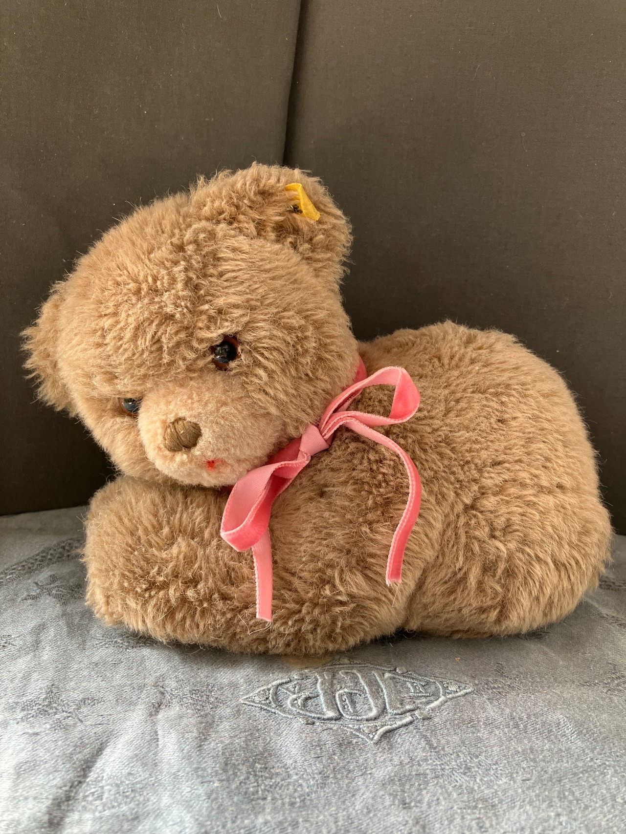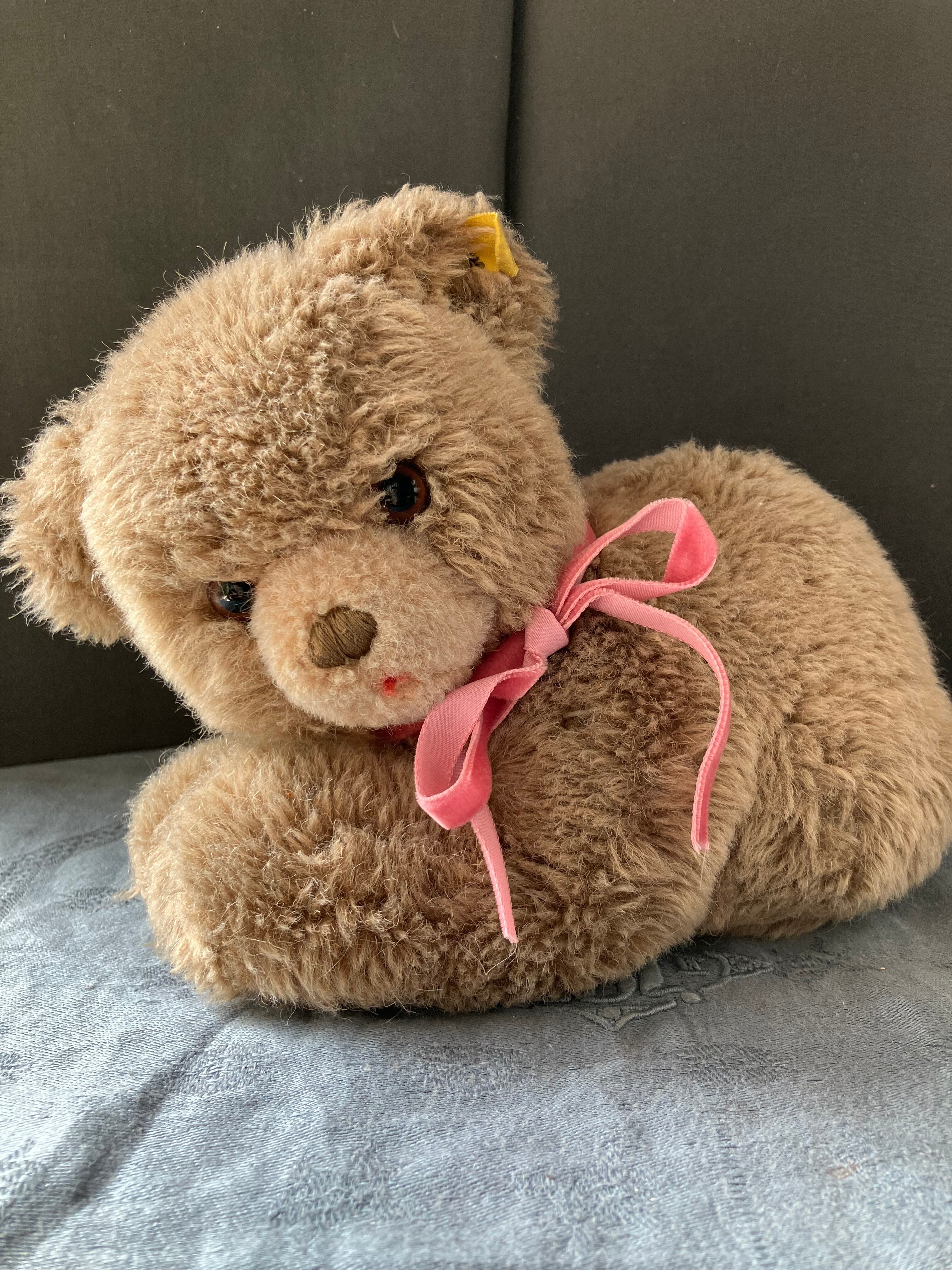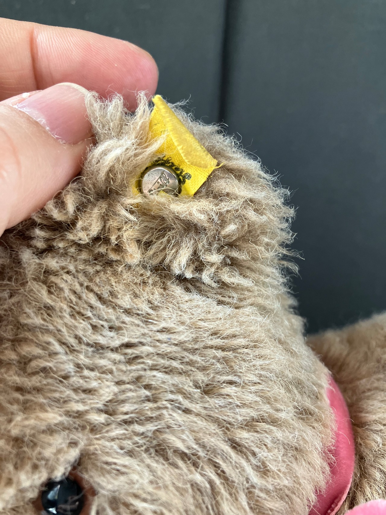 シュタイフ イエローラベルとタグ付きのお座りベアちゃんです。ultoramodのスェードリボンお付けします。ドイツビンテージ。