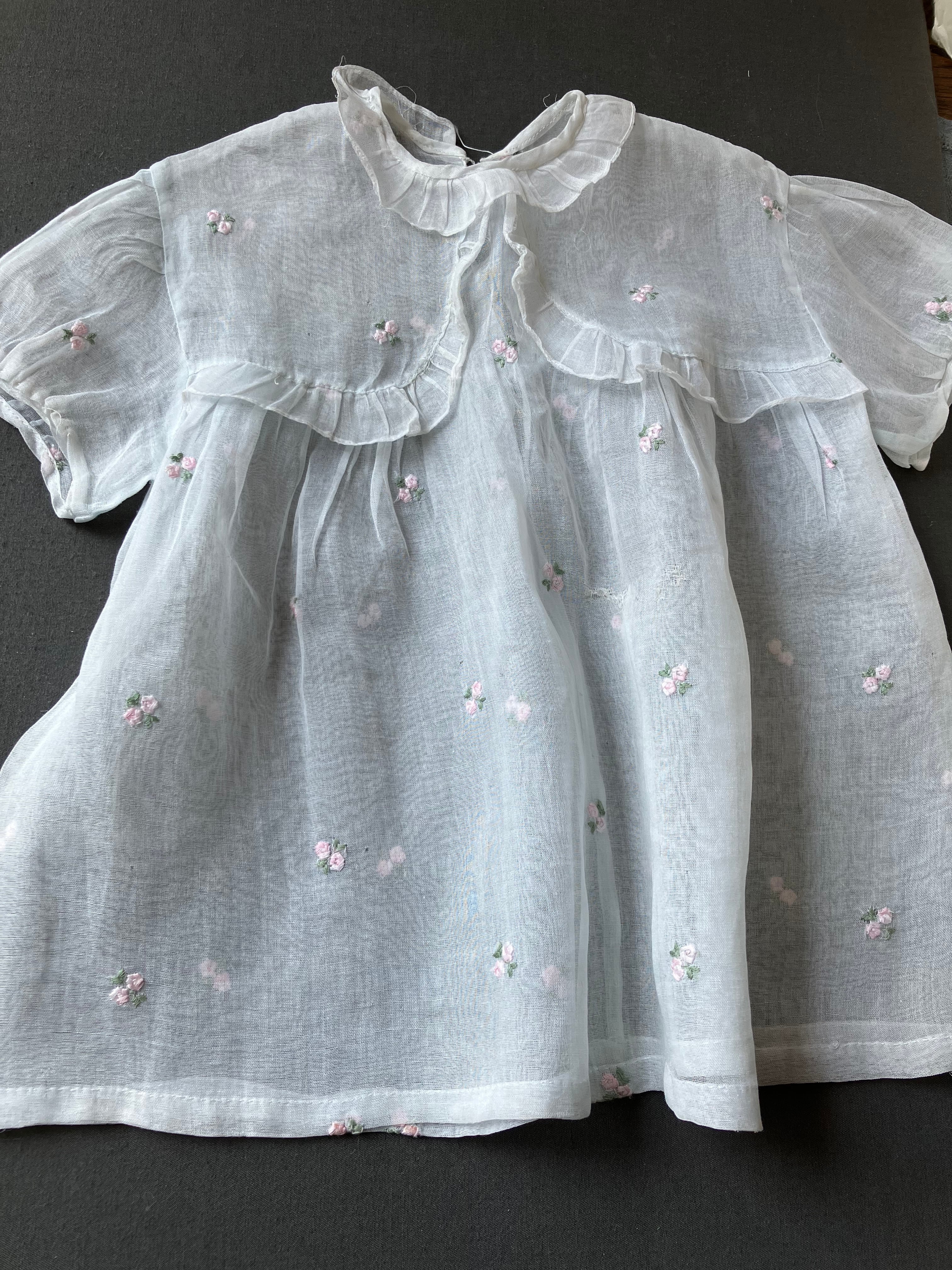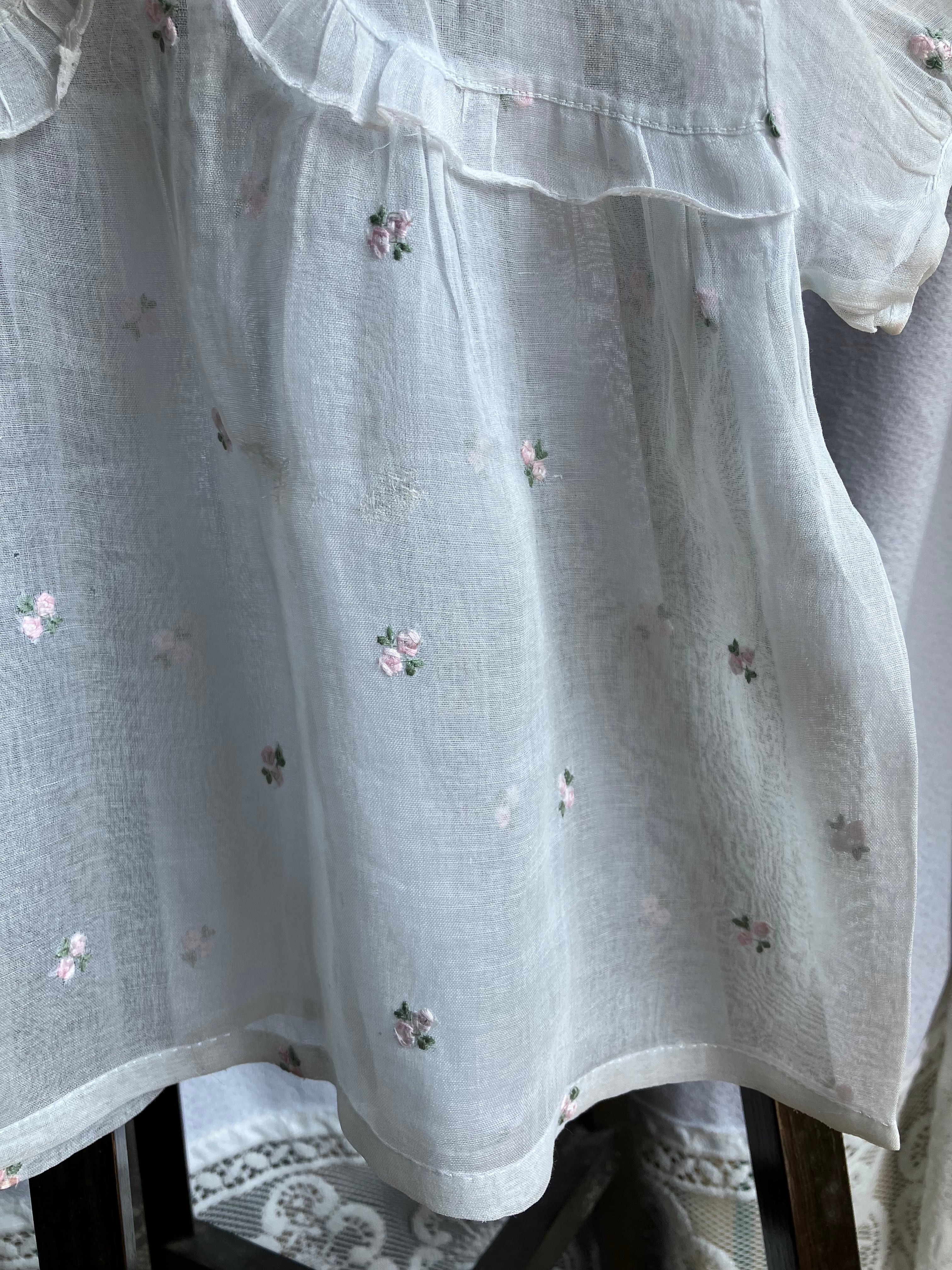 ピンクのバラの刺繍が散りばめられた、ラブリーなベビードレスです。チュールレースの特性上ほつれがありましたが、上手にお直しされています。1930年から90年。フランスアンティーク。