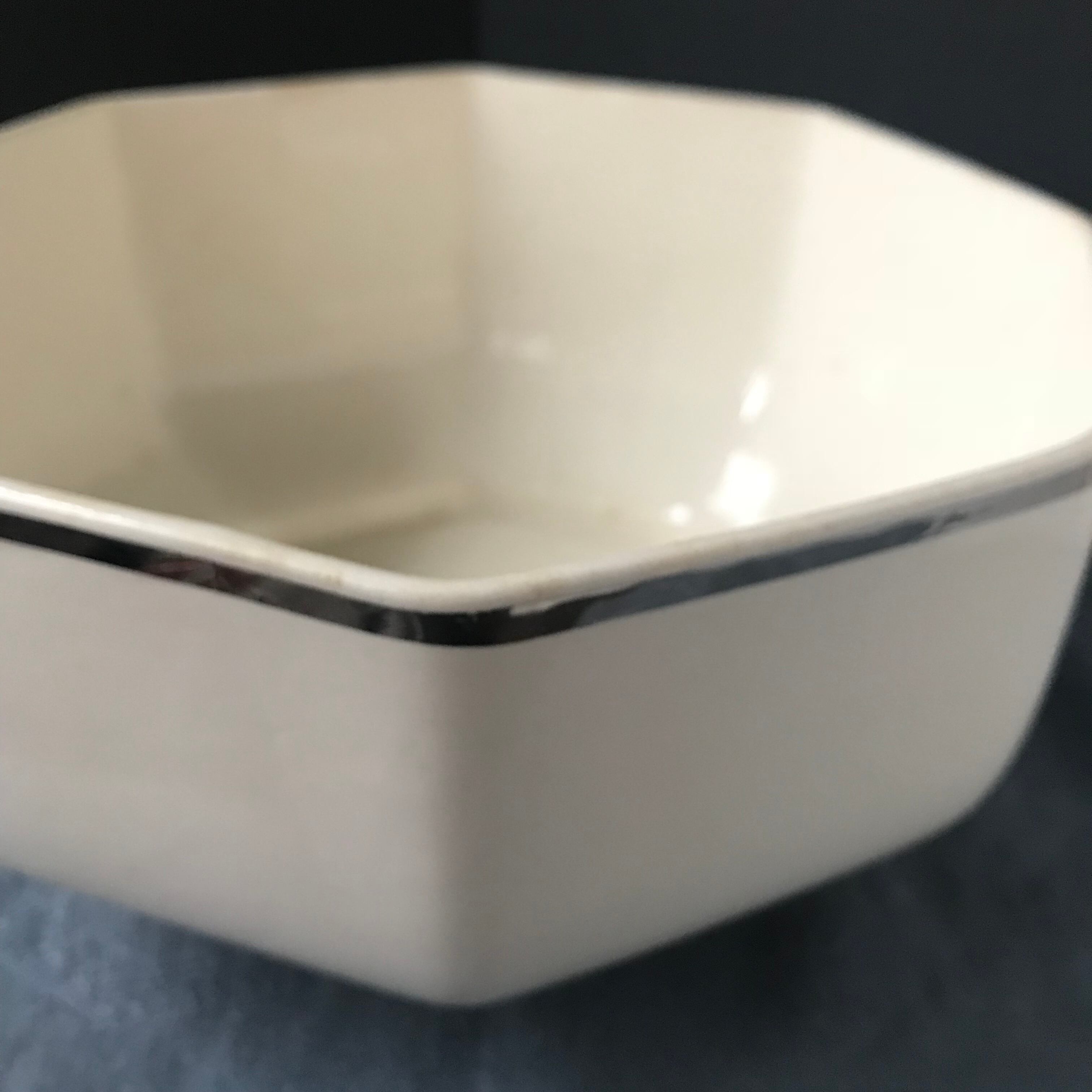 ・縦 22.5㎝ 横 22.5㎝ 高さ 12㎝ VILLEROY&BOCH のオクトゴナルスーピエールです。乳白色の陶器肌に縁周りにシルバーのラインが入っています。ヒビカケは無く良い状態です。シンプルなオクトゴナルのスーピエールは色々に使って頂けそうです。フランスアンティーク。