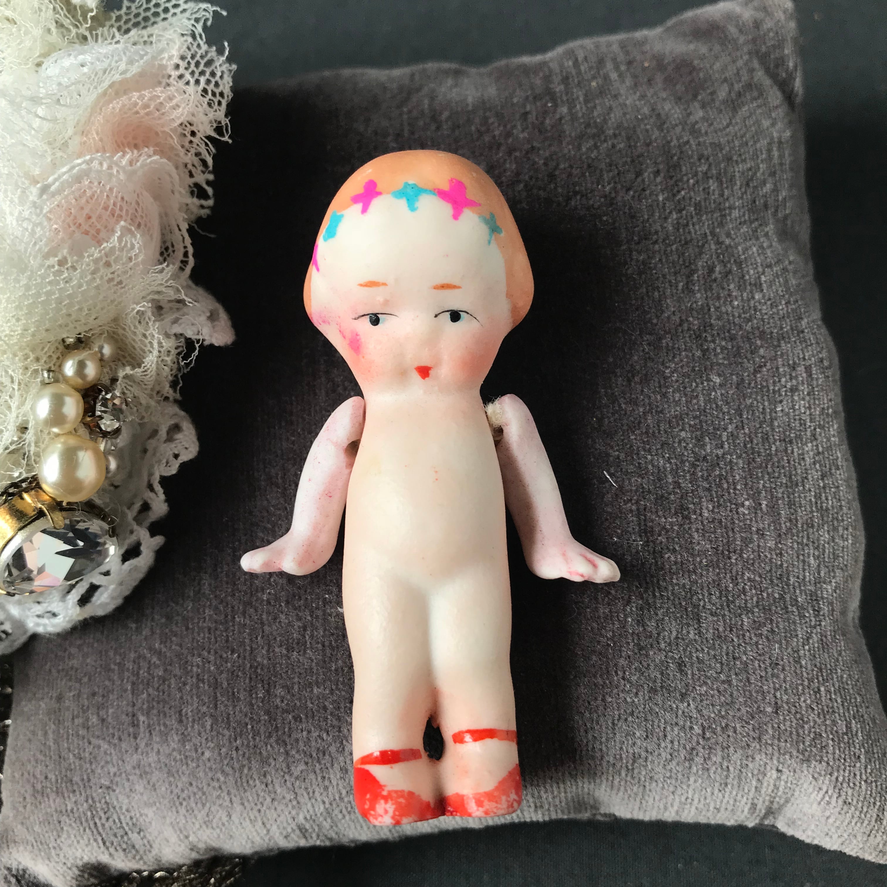 ・身長 6㎝ 頭に花冠がついて、赤い靴をはいたオールビスクドールです。腕はゴムジョイント動きます。輸出向け日本製里帰り品です。可愛らしい女の子です。お洋服は無いので作ってあげて下さい。フランスビンテージ。