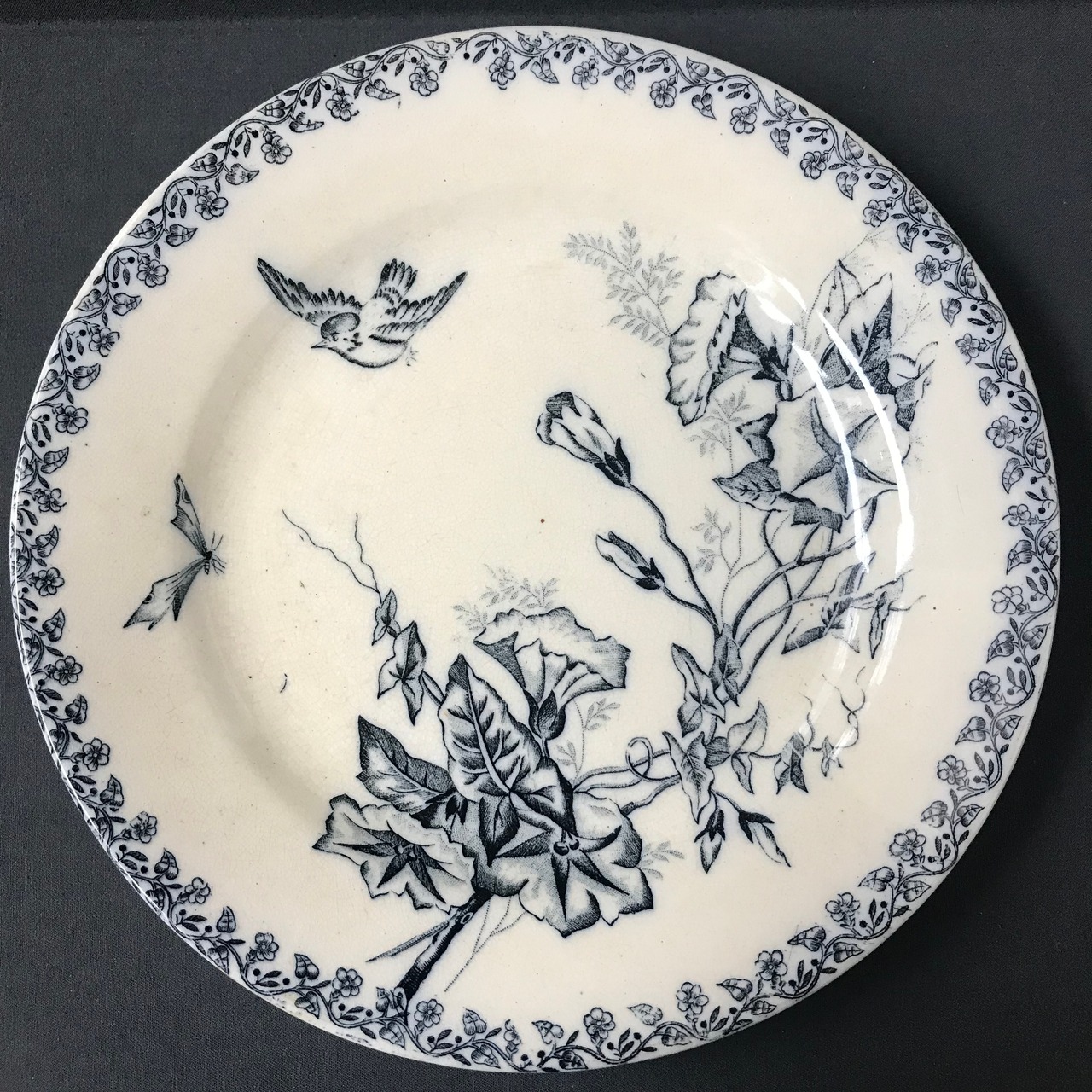 ・直径 22.3 ㎝ サルグミンヌの 朝顔、鳥、蝶々が描かれたプレートです。縁周りは花と葉、実が描かれています。芸術的なプレートです。ヒビカケございません。フランスアンティーク。
