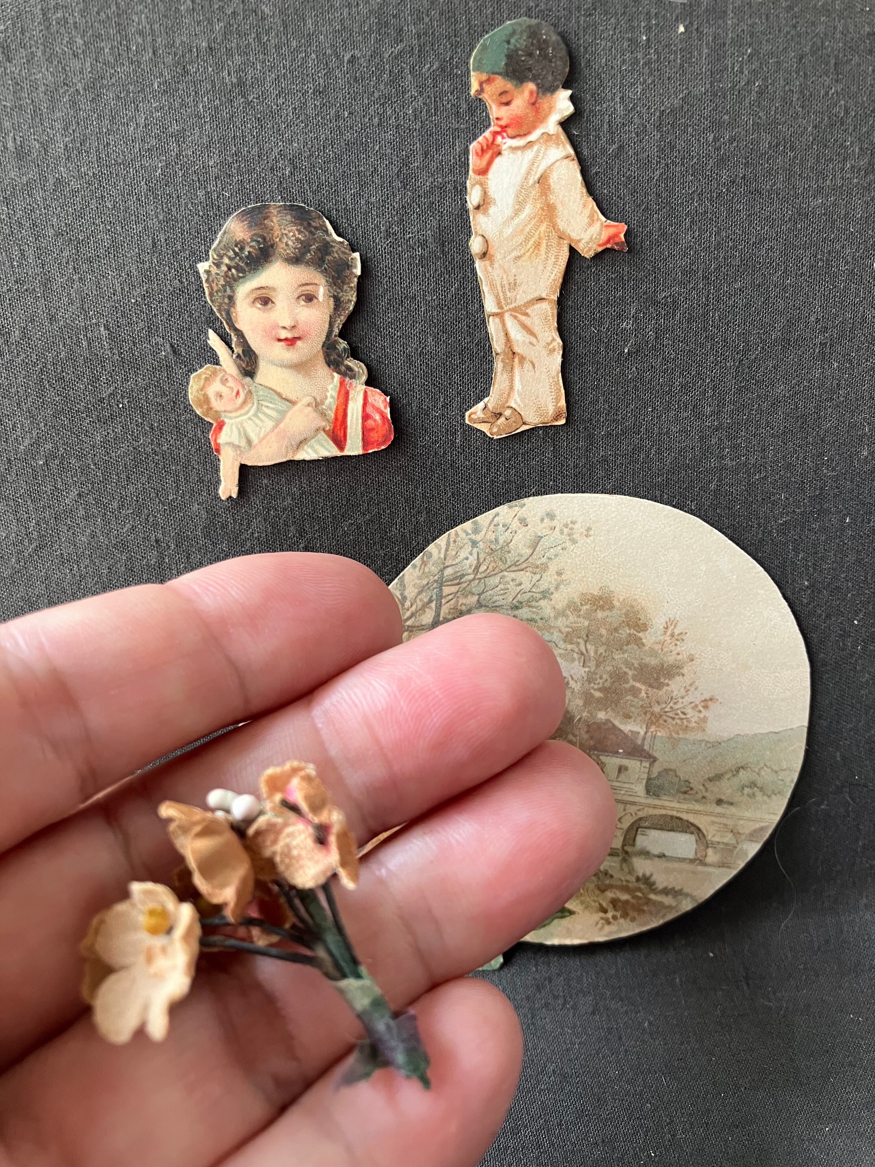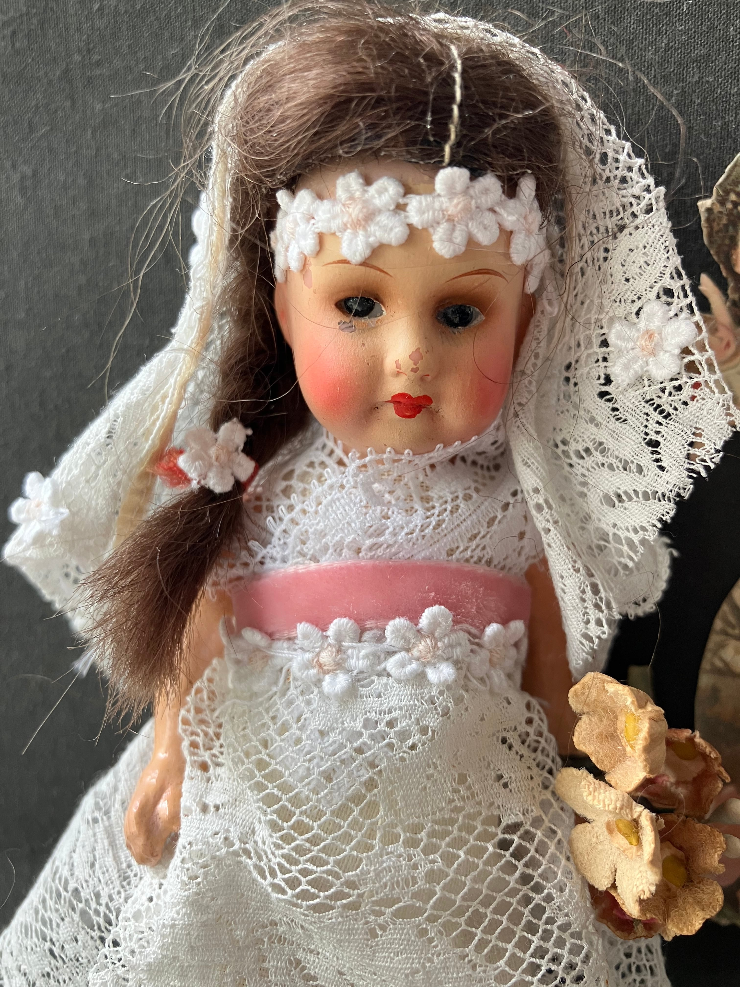 ・身長 14㎝ おさげ髪のミニョネットちゃんです。ヘッドはビスク グラスアイ ボディはコンポジション 手足はジョイントです。オリジナルの下着を付けています。当方でアンティークレースを使ってドレスとベールに仕立てました。ヘッドに刻印あります。刻印はA15/OM その上の刻印は最初の文字が判読不明後半の文字がOMJと読めます。クロモス3枚とブケお付けします。ドイツアンティーク。
