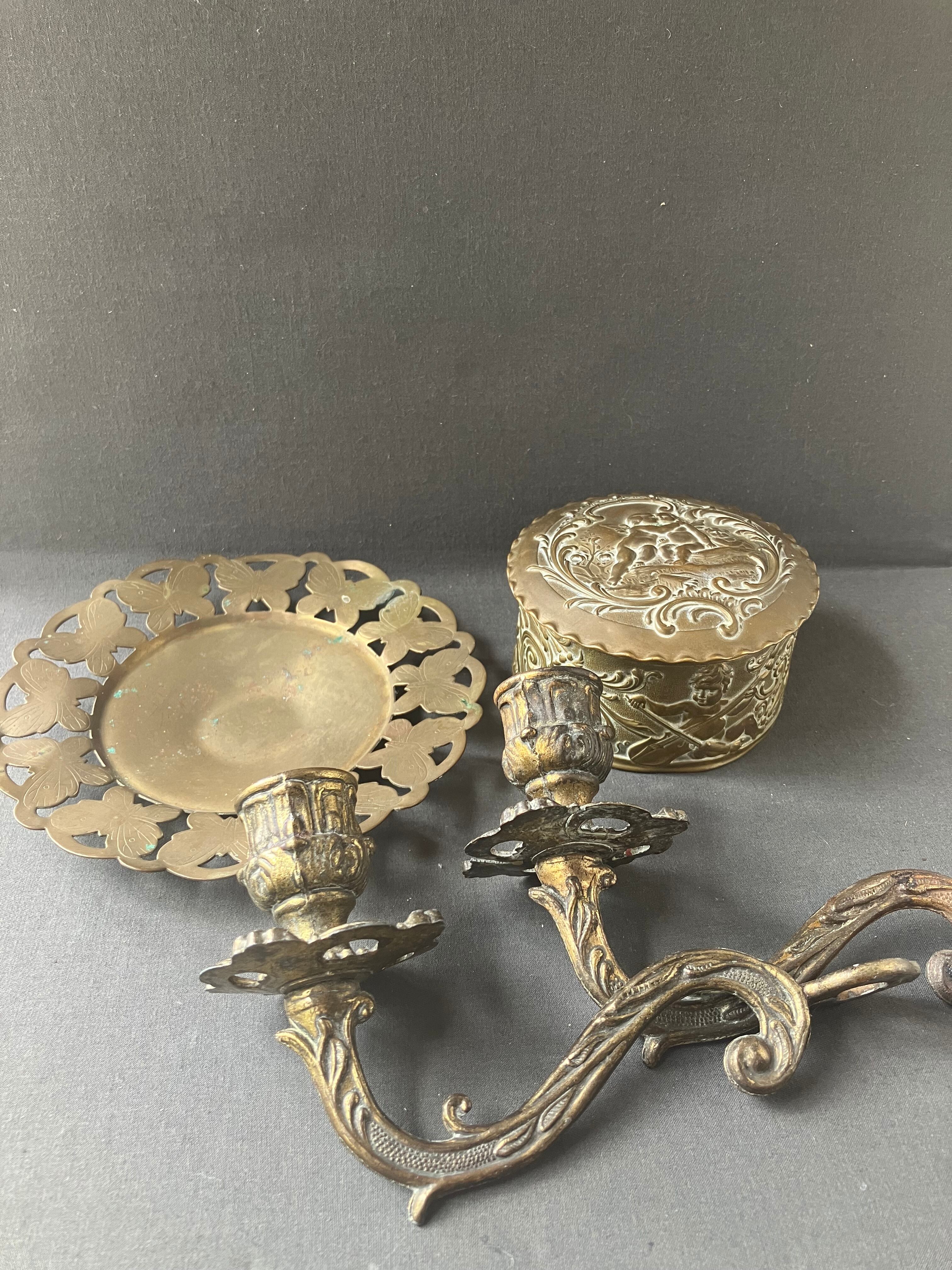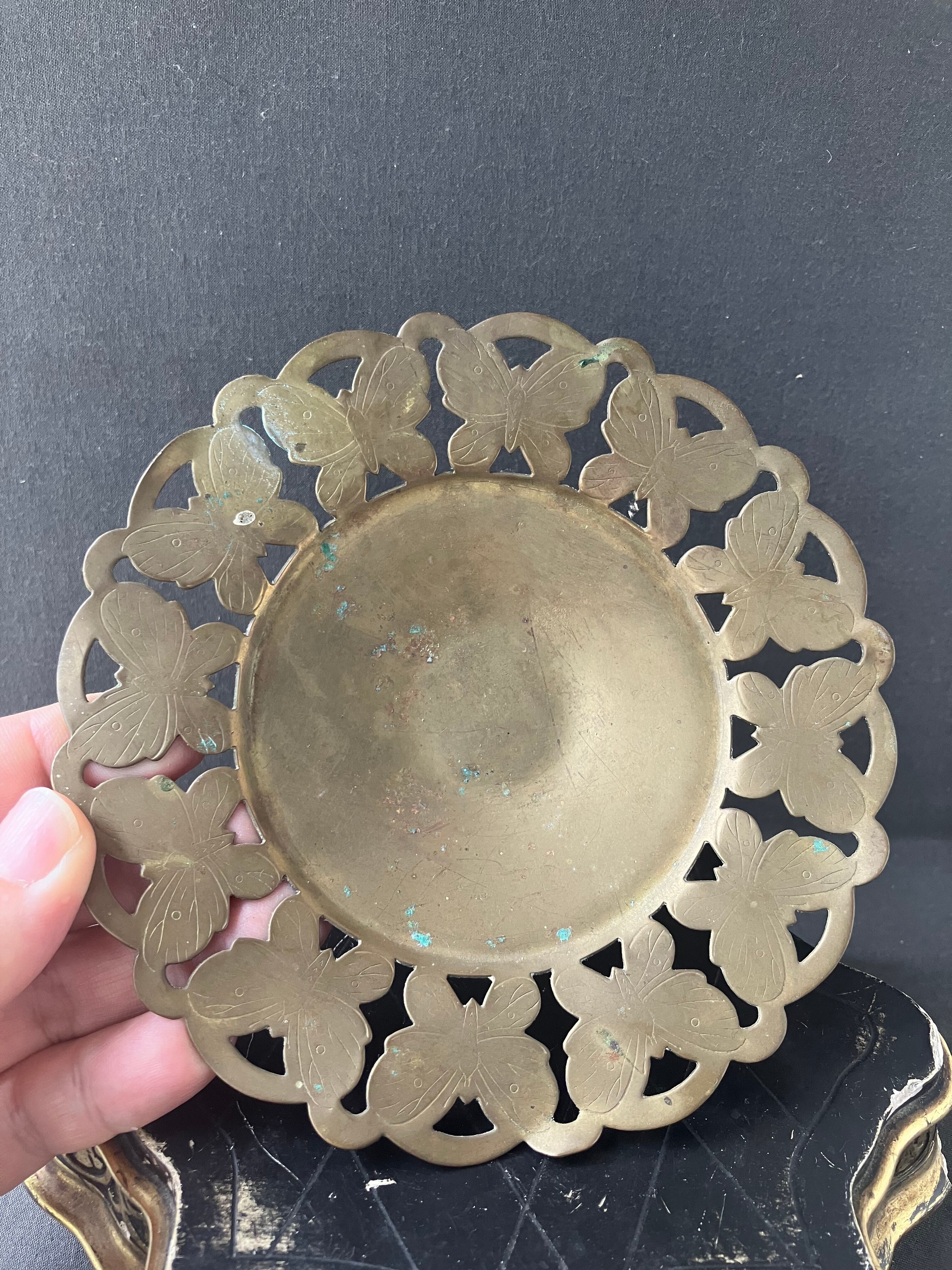 真鍮製素晴らしい打ち出しのエンジェルのレリーフのBOXです。底に歪みがあります。真鍮製のバタフライデザインのアクセサリートレイと真鍮製のキャンドルスタンド2本の合計4点のセットです。フランスアンティーク。