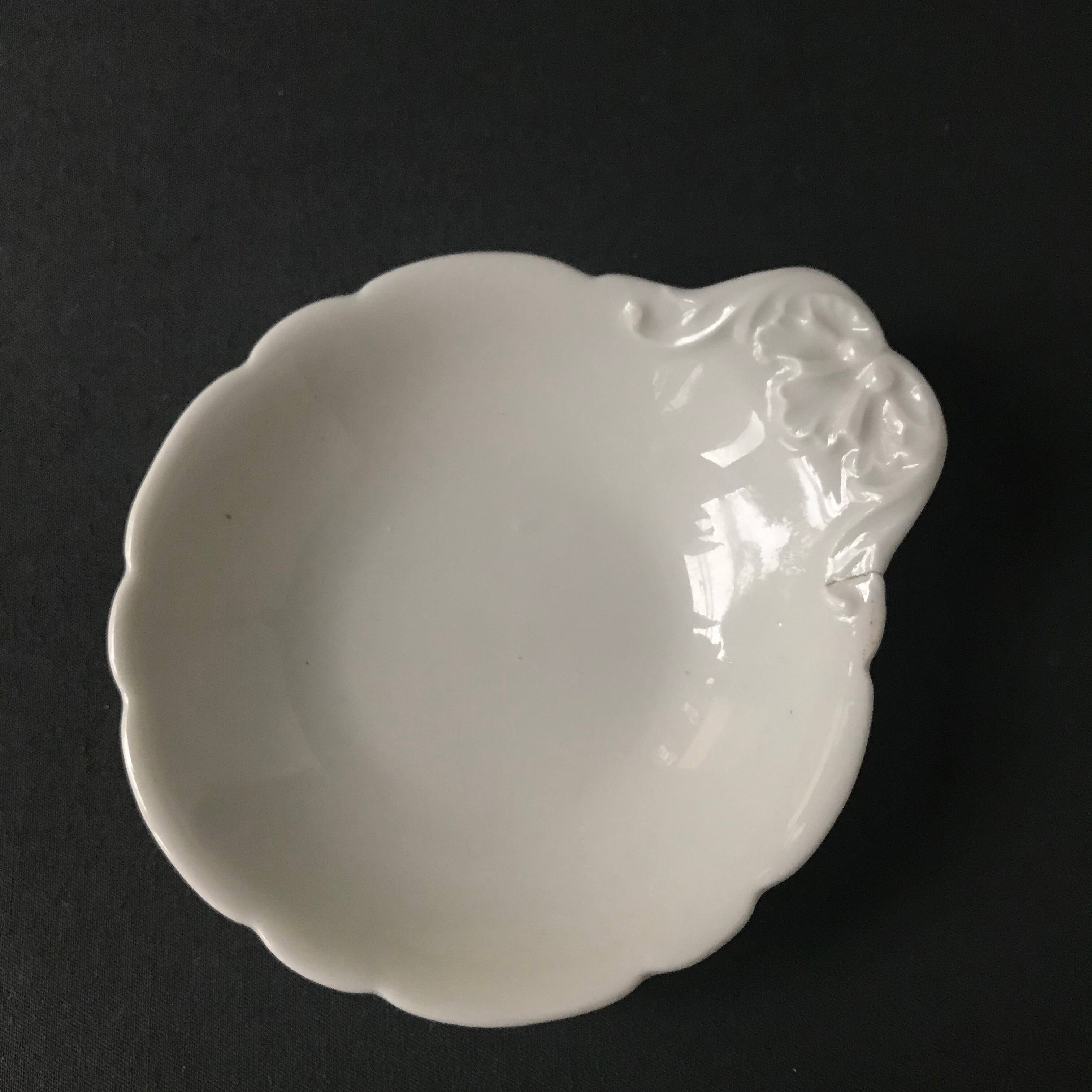 ・縦 10㎝ 横 11.7㎝ レリーフと周りのスカラップが可愛らしいジュエリートレイに良さそうなプレートです。ぽってりとした陶器肌は年代を感じさせます。レリーフの所に7㎜程のラインがあります。フランスアンティーク。