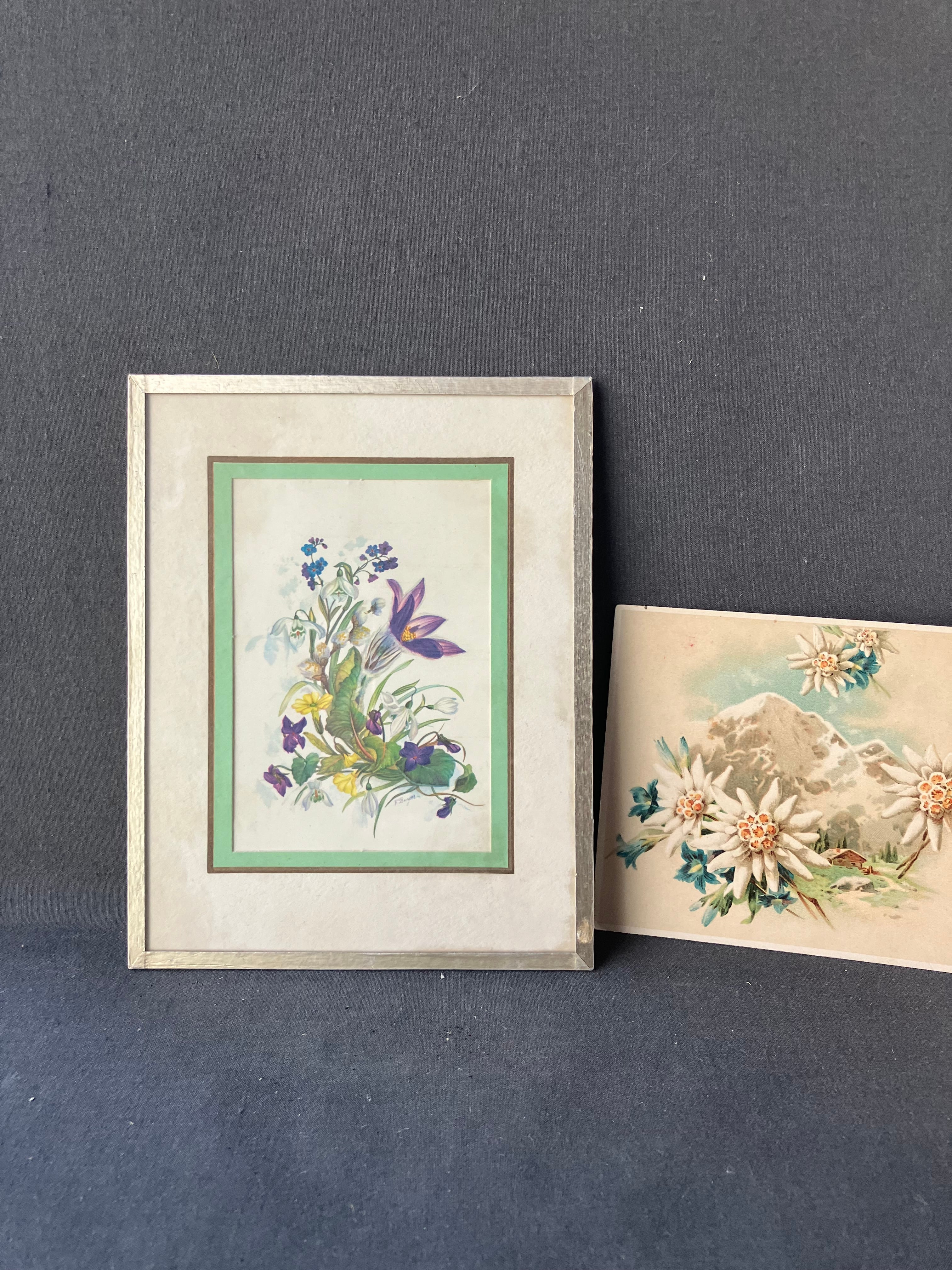 スミレのブケの水彩画をガラストップを付けてマットを付けて額装してあります。小振りなサイズはインテリアの邪魔をせず飾って頂けます。ポストカードもセットです。1930年から40年。フランスビンテージ。