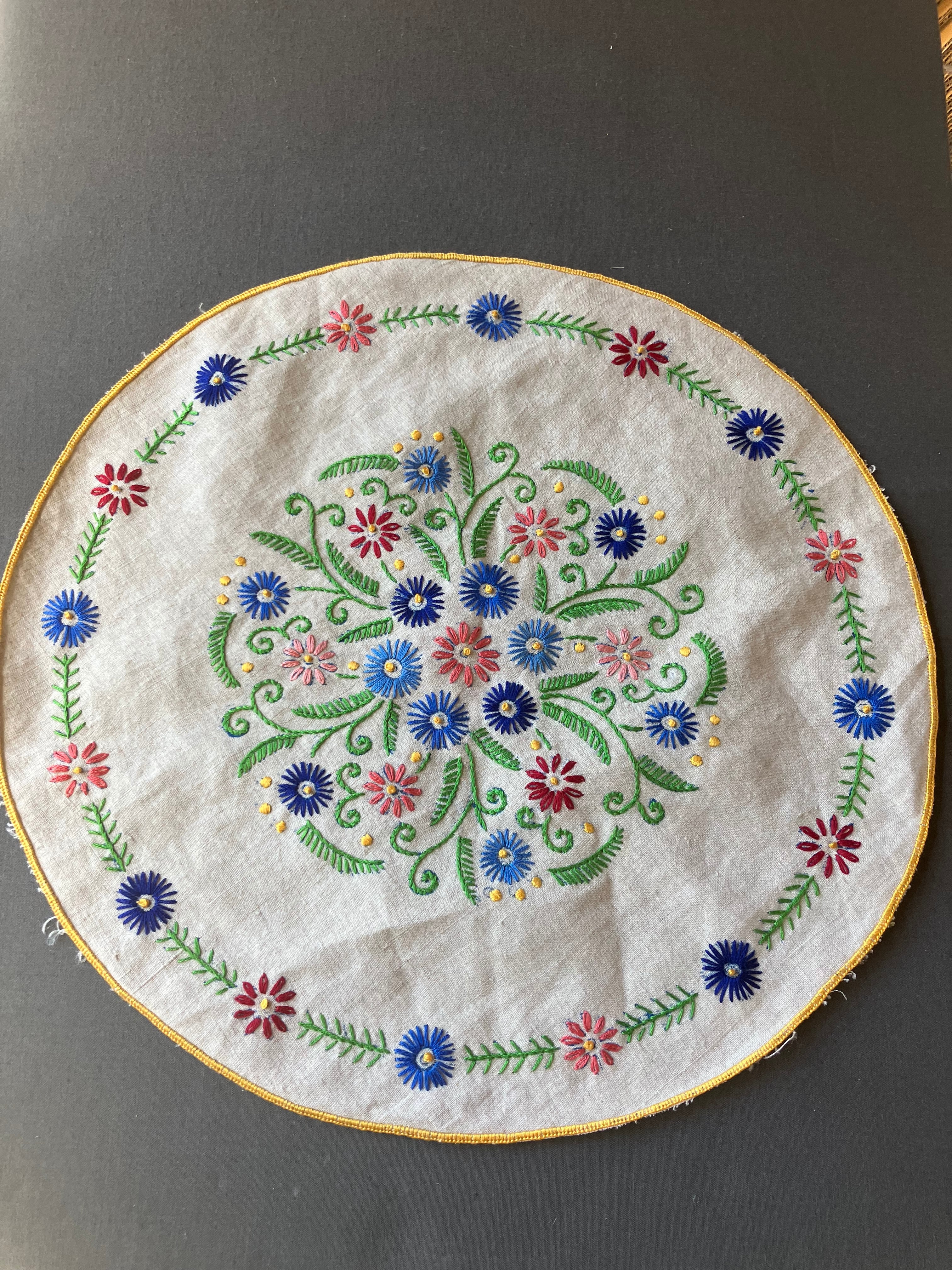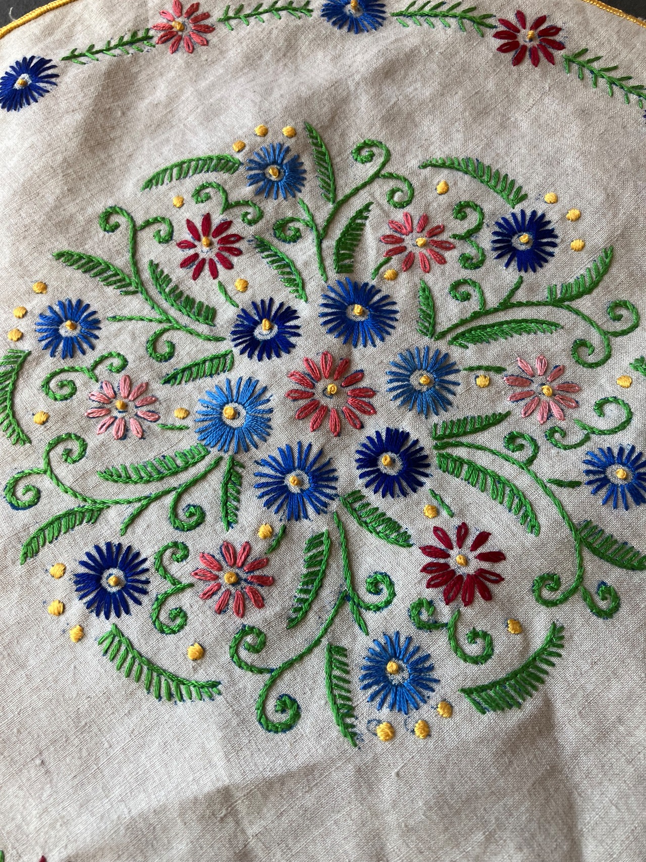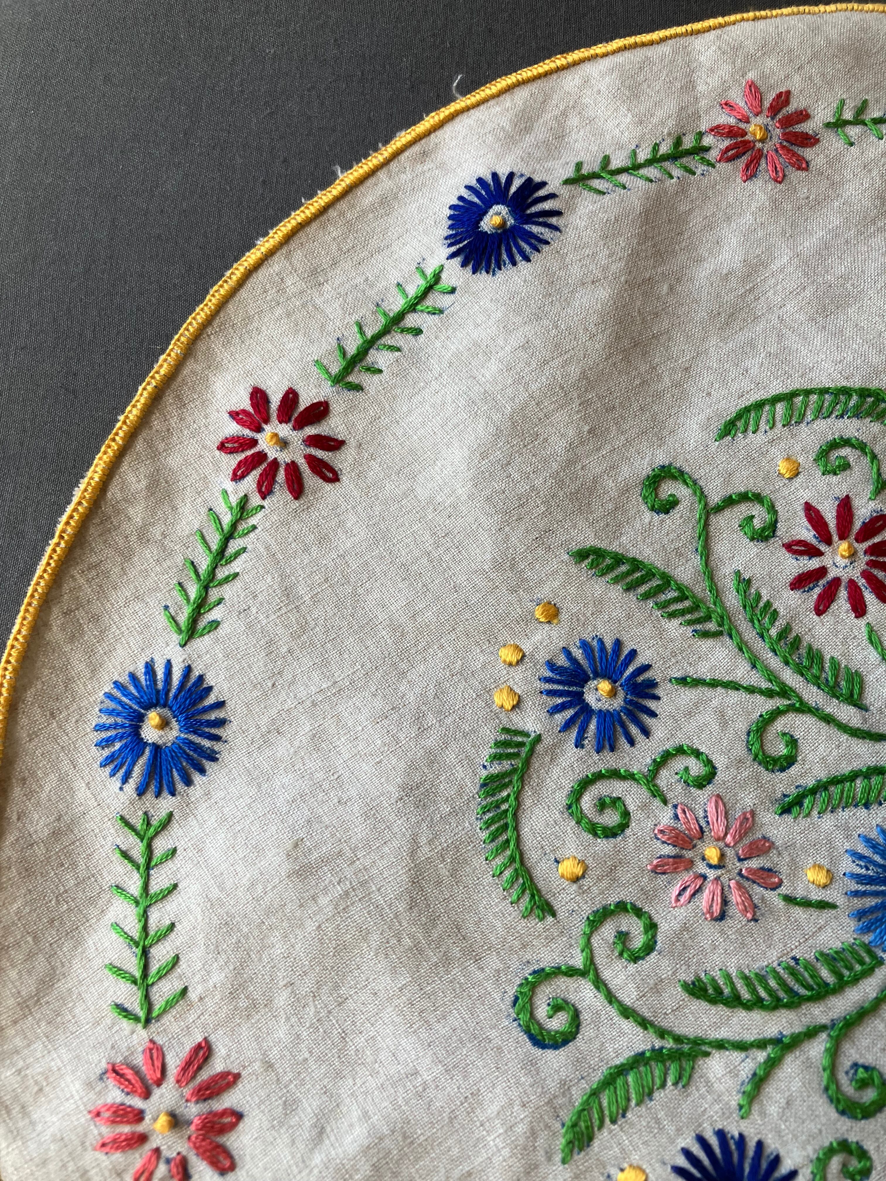 リネン素材に素晴らしいハンド刺繍のドイリー と